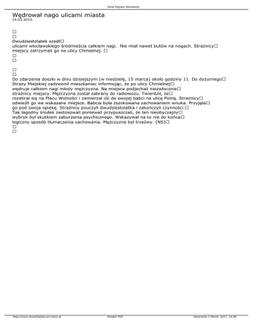 Straż Miejska Włocławek Wędrował nago ulicami miasta 15.03.2015. Dwudziestolatek szedł ulicami włocławskiego śródmieścia całkiem nagi. Nie miał nawet butów na nogach. Strażnicy miejscy zatrzymali go na ulicy Chmielnej. Do zdarzenia doszło w dniu dzisiejszym (w niedzielę, 15 marca) około godziny 11. Do dyżurnego Straży Miejskiej zadzwonił mieszkaniec informując, że po ulicy Chmielnej wędruje całkiem nagi młody mężczyzna. Na miejsce podjechali niezwłocznie strażnicy miejscy. Mężczyzna został zabrany do radiowozu. Twierdził, że rozebrał się na Placu Wolności i zamierzał iść do swojej babci na ulicę Polną. Strażnicy odwieźli go we wskazane miejsce. Babcia była zszokowana zachowaniem wnuka. Przyjęła go pod swoja opiekę. Strażnicy pouczyli dwudziestolatka i zakończyli czynności. Tak łagodny środek zastosowali ponieważ przypuszczali, że ten nieobyczajny wybryk był skutkiem zaburzenia psychicznego. Wskazywał na to nie do końca logiczny sposób tłumaczenia zachowania. Mężczyzna był trzeźwy. (NS) http://www.strazmiejska.um.wlocl.pl Kreator PDF Utworzono 3 March, 2017, 16:48
