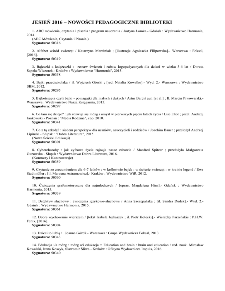 JESIEŃ 2016 – NOWOŚCI PEDAGOGICZNE BIBLIOTEKI 1. ABC mówienia, czytania i pisania : program nauczania / Justyna Łomża.- Gdańsk : Wydawnictwo Harmonia, 2014. (ABC Mówienia, Czytania i Pisania.) Sygnatura: 50316 2. Alfabet wśród zwierząt / Katarzyna Marciniak ; [ilustracje Agnieszka Filipowska].- Warszawa : Foksal, [2016]. Sygnatura: 50319 3. Bajeczki z książeczki : zestaw ćwiczeń i zabaw logopedycznych dla dzieci w wieku 3-6 lat / Dorota Sapela-Wiezorek.- Kraków : Wydawnictwo "Harmonia", 2015. Sygnatura: 50358 4. Bajki przedszkolaka / il. Wojciech Górski ; [red. Natalia Kowałko].- Wyd. 2.- Warszawa : Wydawnictwo SBM, 2012. Sygnatura: 50295 5. Bajkoterapia czyli bajki - pomagajki dla małych i dużych / Artur Barciś aut. [et al.] ; Il. Marcin Piwowarski.Warszawa : Wydawnictwo Nasza Księgarnia, 2015. Sygnatura: 50297 6. Co tam się dzieje? : jak rozwija się mózg i umysł w pierwszych pięciu latach życia / Lise Eliot ; przeł. Andrzej Jankowski.- Poznań : "Media Rodzina", cop. 2010. Sygnatura: 50341 7. Co z tą szkołą? : siedem perspektyw dla uczniów, nauczycieli i rodziców / Joachim Bauer ; przełożył Andrzej Lipiński.- Słupsk : "Dobra Literatura", 2015. (Nowe Ścieżki Edukacji) Sygnatura: 50301 8. Cyberchoroby : jak cyfrowe życie rujnuje nasze zdrowie / Manfred Spitzer ; przełożyła Małgorzata Guzowska.- Słupsk : Wydawnictwo Dobra Literatura, 2016. (Kontrasty i Kontrowersje) Sygnatura: 50359 9. Czytanie ze zrozumieniem dla 6-7 latków : w królestwie bajek : w świecie zwierząt : w krainie legend / Ewa Stadtmüller ; [il. Marzena Astramowicz].- Kraków : Wydawnictwo WiR, 2012. Sygnatura: 50360 10. Ćwiczenia grafomotoryczne dla najmłodszych / [oprac. Magdalena Hinz].- Gdańsk : Wydawnictwo Harmonia, 2015. Sygnatura: 50339 11. Detektyw słuchowy : ćwiczenia językowo-słuchowe / Anna Szczepańska ; [il. Sandra Dudek].- Wyd. 2.Gdańsk : Wydawnictwo Harmonia, 2015. Sygnatura: 50361 12. Dobre wychowanie wierszem / [tekst Izabela Jędraszek ; il. Piotr Kotecki].- Wierzchy Parzeńskie : P.H.W. Fenix, [2016]. Sygnatura: 50304 13. Dzieci to lubią / Joanna Góźdź.- Warszawa : Grupa Wydawnicza Foksal, 2013 Sygnatura: 50343 14. Edukacja i/a mózg : mózg a/i edukacja = Education and brain : brain and education / red. nauk. Mirosław Kowalski, Irena Koszyk, Sławomir Śliwa.- Kraków : Oficyna Wydawnicza Impuls, 2016. Sygnatura: 50340 15. Granica bólu : o źródłach agresji i przemocy / Jachim Bauer ; przełożyła Maria Skalska- Słupsk : Dobra Literatura, 2015. (Kontrasty i Kontrowersje 830) Sygnatura: 50302 16. Jak wspierać dziecko w nauce : niezbędnik aktywnego rodzica / Małgorzata Taraszkiewicz [et al.].Warszawa : Wolters Kluwer Polska, cop. 2009. (Rodzice, Szkoła, Uczeń) Sygnatura: 50309 17. Jak wydobyć geniusza ze swojego dziecka : zabawy i ćwiczenia rozwijające intelekt dzieci w wieku od 0 do 11 lat / Ken Adams ; il. Peter Liddiard ; tł. Wojciech Nowicki.- Poznań : Wydawnictwo Publicat, [2011]. Sygnatura: 50335 18. Jak zachęcać do czytania : minilekcje dla uczniów gimnazjum i liceum / Kelly Gallagher ; tł. Magdalena Pagińska.- Wyd. 2.- Gdańsk : Gdańskie Wydawnictwo Oświatowe, 2010. (Biblioteka Między Nami) Sygnatura: 50306 19. Jesteśmy aktorami : scenariusze teatrzyków dziecięcych / Dorota Niewola.- Kraków : Oficyna Wydawnicza "Impuls", 2012. Sygnatura: 50352 20. Logopedyczne przygody z Szofikiem : przewodnik dla dzieci z zaburzoną wymową głosek szeregu szumiącego / Magdalena Bochniak, Monika Domańska.- Gdańsk : Wydawnictwo Harmonia, 2013. Sygnatura: 50303 21. Łamigłówki logopedyczne z głoską r : zadania ułatwiające terapię logopedyczną / Romana Sprawka.Gdańsk : Harmonia, 2010. Sygnatura: 50324 22. Metody nauki czytania i pisania z perspektywy trudności uczniów / Anna Jurek.- Gdańsk : Harmonia Universalis, 2012. Sygnatura: 50312 23. Metody wywoływania głosek / Jagoda Cieszyńska.- Kraków : Omega Stage Systems - Jędrzej Cieszyński, 2012. Sygnatura: 50338 24. Moc jest w nas : bajki terapeutyczne dla dzieci i ich rodziców / red.Kamila Zdanowicz-Kuczarczyk.Kraków : Wydawnictwo Impuls, 2016. Sygnatura: 50350 25. Moja pierwsza przygoda z literaturą : warsztaty literackie dla przedszkolaków / Olga Pawlik.- Gdańsk : Harmonia, 2013. Sygnatura: 50356 26. Motywacja do uczenia się uczniów w młodszym wieku szkolnym / Małgorzata Głoskowska-Sołdatow ; Wydział Pedagogiki i Psychologii Uniwersytetu w Białymstoku.- Warszawa : Wydawnictwo Akademickie Żak Jacek Śnieciński, 2016. Sygnatura: 50342 27. Motywacja przez wielkie M : zmierzaj do celu : praktyczny poradnik rozwoju osobistego / Marcin Capiga.Konstancin-Jeziorna : Wydawnictwo Rea-SJ, cop. 2015. (Rozwijaj Się) Sygnatura: 50337 28. Mutyzm wybiórczy : trzy spojrzenia / Monika Cabała, Agnieszka Leśniak-Stępień, Renata Szot, Katarzyna Szyszka.- Kraków : Impuls, 2016. Sygnatura: 50351 29. Pedagogika porównawcza : podręcznik akademicki / Czesław Kępski.- Warszawa : Difin, 2016. (Engram) Sygnatura: 50314 30. Praca z dzieckiem ryzyka dysleksji i dysgrafii na zajęciach terapeutycznych w przedszkolu / Anna Klim-Klimaszewska.- Warszawa : Instytut Wydawniczy ERICA, 2015. Sygnatura: 50346 31. Programy pracy szkoły : Program wychowawczy ; Szkolny program profilaktyki ; Program edukacji regionalnej / Alicja Tanajewska, Iwona Kiełpińska, Ewa Korzeniewska.- Gdańsk : Wydawnictwo Harmonia, 2013. Sygnatura: 50326 32. Przedszkolak idzie do szkoły / Barbara Zakrzewska.- Gdańsk : Wydawnictwo Harmonia, 2015. Sygnatura: 50331 33. Przygody Fryderyki czyli Bajki terapeutyczne / Joanna Brodowska.- Warszawa : Wydawnictwo Harmonia, 2013. Sygnatura: 50336 34. Psychologia w pracy terapeuty zajęciowego : wybrane zagadnienia / Edyta Janus.- Warszawa : Difin, 2016. (Engram) Sygnatura: 50311 35. Socjoterapia dzieci i młodzieży : diagnoza i metody pracy / redakcja naukowa Agnieszka Lasota i Jan L. Franczyk.- Warszawa : "Żak", cop. 2015. Sygnatura: 50322 36. Terap