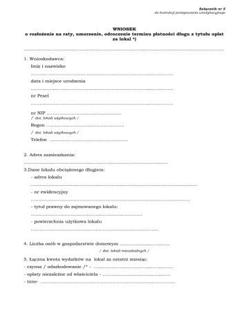 Załącznik nr 5 do Instrukcji postępowania windykacyjnego WNIOSEK o rozłożenie na raty, umorzenie, odroczenie terminu płatności długu z tytułu opłat za lokal *) …..................................................................................................................................... 1. Wnioskodawca: Imię i nazwisko ................................................................................................. data i miejsce urodzenia ................................................................................................. nr Pesel ................................................................................................. nr NIP …................................................ / dot. lokali użytkowych / Regon ….................................................. / dot. lokali użytkowych / Telefon ….................................................. 2. Adres zamieszkania: .................................................................................................. 3.Dane lokalu obciążonego długiem: - adres lokalu ….............................................................................................................. - nr ewidencyjny …......................................................................................................... - tytuł prawny do zajmowanego lokalu: …......................................................................... - powierzchnia użytkowa lokalu ….................................................................................... 4. Liczba osób w gospodarstwie domowym .................................. / dot. lokali mieszkalnych / 5. Łączna kwota wydatków na lokal za ostatni miesiąc. - czynsz / odszkodowanie /* - …................................................... - opłaty niezależne od właściciela - …........................................... - inne- …......................................................................................... Załącznik nr 5 do Instrukcji postępowania windykacyjnego 6. Kwota zaległości z tytułu : - czynszu / odszkodowania /* - za okres od ..................... do …..................... .......................... zł. - opłat niezależnych od właściciela - za okres od …..................do …...................... ….......................zł. - odsetek - za okres od ..................... do …..................... .......................... zł. - innych - za okres od ..................... do …..................... .......................... zł. Potwierdza zarządca domu: ............................................... (podpis zarządcy) …………................................. (data i podpis przyjmującego) Niniejszym oświadczam, że wiadoma jest mi łączna kwota zadłużenia w tym jej poszczególnych składników. Składając niniejszy wniosek zostałem poinformowany, że do wniosku należy dołączyć dokumenty potwierdzające trudności płatnicze co może mieć wpływ na rozpatrzenie sprawy. ...................................................... ( data i podpis wnioskodawcy) *) Niepotrzebne skreślić / do wniosku należy dołączyć : xero umowy najmu lokalu, aktualny aneks czynszowy i dokumenty potwierdzające wysokość dochodów z 3 ostatnich miesięcy /. .................................................................. (imię i nazwisko składającego deklarację) .................................................................. (dokładny adres) ........................................................................... (miejscowość) (data) Załącznik nr 5 do Instrukcji postępowania windykacyjnego Deklaracja o wysokości dochodów za okres ......................................................................................................... (pełnych trzech miesięcy kalendarzowych poprzedzających datę złożenia wniosku) Oświadczam, że moje gospodarstwo domowe składa się z następujących osób: l. Imię i nazwisko .................................................................................................................. wnioskodawca, data urodzenia………................................................................................................... 2. Imię i nazwisko ………................................................................................................... stopień pokrewieństwa.................................. data urodzenia ........................................ 3. Imię i nazwisko ………................................................................................................... stopień pokrewieństwa.................................. data urodzenia ........................................ 4. Imię i nazwisko ………................................................................................................... stopień pokrewieństwa.................................. data urodzenia ........................................ 5. Imię i nazwisko ………................................................................................................... stopień pokrewieństwa.................................. data urodzenia ........................................ 6. Imię i nazwisko………................................................................................................... stopień pokrewieństwa.................................. data urodzenia ........................................ 7. Imię i nazwisko ………................................................................................................... stopień pokrewieństwa.................................. data urodzenia ........................................ 8. Imię i nazwisko ……………............................................................................................ stopień pokrewieństwa.................................. data urodzenia ........................................ ............................................................
