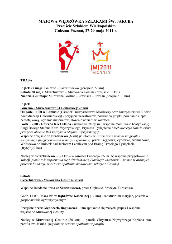 MAJOWA WĘDRÓWKA SZLAKAMI ŚW. JAKUBA Przejście Szlakiem Wielkopolskim Gniezno-Poznań, 27-29 maja 2011 r. TRASA Piątek 27 maja: Gniezno – Skrzetuszewo (przejście 22 km) Sobota 28 maja: Skrzetuszewo – Murowana Goślina (przejście 30 km) Niedziela 29 maja: Murowana Goślina – Owińska – Poznań (przejście 10 km) Piątek Gniezno – Skrzetuszewo [J.Lednickie]: 23 km Od godz. 11.00 w Lamusie (Ośrodek Duszpasterstwa MłodzieŜy oraz Duszpasterstwa Rodzin Archidiecezji Gnieźnieńskiej) - przyjęcie uczestników, podział na grupki, powitanie ciepłą herbatą/kawą, wydanie materiałów, złoŜenie udziału w kosztach. Godz. 12.00 - Gniezno KATEDRA - udział we mszy św., wspólna modlitwa o beatyfikację Sługi BoŜego Stefana Kard. Wyszyńskiego, Prymasa Tysiąclecia (Archidiecezja Gnieźnieńska przeŜywa obecnie Rok kardynała Stefana Wyszyńskiego) Wspólne przejście do Braciszewa (6 km) (k. sklepu w Braciszewie podział na grupki i kontynuacja pielgrzymowana w małych grupkach), przez Rzęgnowa, śydówko, Siemianowo, Waliszewo do Imiołek nad Jeziorem Lednickim pod Bramę Trzeciego Tysiąclecia – „Rybę”(22 km). Nocleg w Skrzetuszewie - (23 km)- w ośrodku Fundacja PATRIA; wspólne przygotowanie kolacji (moŜliwość zapoznania się z działalnością Fundacji; wieczorem – pomoc w drobnych pracach Fundacji; wieczorne spotkanie modlitewne, relacje z Camino) Sobota Skrzetuszewo - Murowana Goślina/ 30 km Wspólne śniadanie, trasa ze Skrzetuszewa, przez Głębokie, Sroczyn, Turostowo. Godz. 13.00 - Msza św. w Dąbrówce Kościelnej (17 km) - sanktuarium maryjne, posiłek w gospodarstwie agroturystycznym Przejście przez Głęboczek, Boguszewo – tam spotkanie się małych grupek i wspólne wejście do Murowanej Gośliny. Nocleg w Murowanej Goślinie (30 km) - parafie Chrystusa NajwyŜszego Kapłana oraz parafia św. Jakuba (wspólne wieczorne spotkanie w parafii) Niedziela Murowana Goślina - Poznań/ 10 km Ok. godz. 7.30 wyjście z Murowanej Gośliny. Przejście przez Bolechowo do Owińsk ( 9 km) - przejazd pociągiem (planowany odjazd: 10.24) na stację Poznań Garbary. Wspólne przejście z Garbar na Ostrów Tumski (1 km) i Msza św. w Katedrze o 12.15, po Mszy św. wspólny posiłek. Informacje organizacyjne: Dojazd do Gniezna: indywidualnie KaŜdy pielgrzym niesie swój plecak Koniecznie zabieramy : odpowiedni ubiór (m.in. płaszczyk przeciwdeszczowy, okrycie głowy) i obuwie; śpiwór, karimatę, menaŜkę, kubek, podręczne sztućce. KaŜdy uczestnik ponosi odpowiedzialność za siebie. Osoby niepełnoletnie muszą posiadać zgodę rodziców na udział w pielgrzymce, ponadto osoby poniŜej 16 roku Ŝycia podczas przejścia powinny znajdować się pod opieką osoby wskazanej jako ich opiekun (druki zgody przesłane będą zainteresowanym na maila po zgłoszeniu przez nich swojego udziału w Pielgrzymce). Credencial: uczestnicy otrzymają pamiątkową ksiąŜeczkę Majowej Wędrówki, w której znajdzie się równieŜ miejsce na pieczątki (credencial). Pielgrzymka zabezpieczona będzie przez jeden samochód obsługi. Uczestnicy pielgrzymki zostaną ubezpieczeni (NNW i O.C. Organizatora) Udział w kosztach: 30 zł składany podczas pielgrzymki (obejmujący koszty: zakwaterowania, posiłków, ubezpieczenia, przejazdu PKP, zabezpieczenia logistycznego, pamiątkowych materiałów, zabezpieczenia technicznego) Dojazd do Skrzetuszewa (dla osób dołączających do pielgrzymki w piątkowe popołudnie/wieczór - do Skrzetuszewa): Dojazd do Skrzetuszewa (dla osób dołączających do pielgrzymki w sobotę): - podróŜ PKP do Lednogóry (linia kolejowa Poznań - Gniezno) i 5 km spacer do Skrzetuszewa, trasa jak do bramy-ryby nad Jeziorem Lednickim. (MAPA) - podróŜ PKS z Gniezna do Imiołek-przystanek ,,na Ŝądanie" (odjazdy z Gniezna: 14:25, 15:35, 16:40, 18:30, 20:35) i pieszy spacer do Skrzetuszewa (MAPA) Dojazd do Gniezna: indywidualnie. KaŜdy pielgrzym niesie swój plecak, prosimy o zabranie odpowiedniego ubioru, śpiwora, karimaty, menaŜki… Opłata, niewielka i dokonywana przy rejestracji, pokryje koszty zakwaterowania i wyŜywienia (w cenie). KaŜdy uczestnik ponosi odpowiedzialność za siebie. Osoby niepełnoletnie muszą posiadać zgodę rodziców na udział w pielgrzymce, ponadto osoby poniŜej 16 roku Ŝycia podczas przejścia powinny znajdować się pod opieką osoby wskazanej jako ich opiekun. Uczestnicy pielgrzymki zostaną ubezpieczeni. Udział w kosztach: 30 zł (obejmujący koszty: zakwaterowania, posiłków, ubezpieczenia, przejazdu PKP, zabezpieczenia logistycznego) składany podczas pielgrzymki. Zgłoszenia do 22 maja. Kontakt: Grzegorz Pindelski (koordynator ogólnopolski): [email protected] Jakub Gwit (koordynator w Wielkopolsce): [email protected] Małgorzata Ziółecka (zgłoszenia): [email protected] ABY ZGŁOSIĆ SWÓJ UDZIAŁ W PIELGRZYMCE UśYJ FORMULARZA!!! (https://spreadsheets.google.com/spreadsheet/viewform?formkey=dEJKTVlmS0x1NE5Z MExZN1Q0bUxrQWc6MQ ) Dołącz do nas na Facebooku: www.facebook.com/event.php?eid=200747779965544 Ważne punkty na trasie Przebieg Szlaku św. Jakuba nie jest przypadkowy… Pokrywa się z trasą pokonywaną od wieków przez pielgrzymów zmierzających do Santiago de Compostela. Po drodze zatrzymamy się w kilku ważnych miejscach związanych z początkami Państwa Polskiego i z kultem świętego Jakuba Starszego Apostoła. Pola Lednickie – osada Ostrów Tumski (VIII Gniezno – Katedra Wniebowzięcia NMP i św. w.) oraz brama-ryba (2000 r.) Wojciecha (XVI w.) Na brzegach Jeziora Lednica odbywają się od 1997 r. Świątynia na Wzgórzu Lecha,Ostrów terenie pierwszej Pola Lednickie – osada Tumski (VIII w.) oraz brama-ryba (2000 r.) Ogólnopolskie Spotkania Młodych. Została historycznej stolicy kraju. Miejsce słynnego Na brzegach Jeziora Lednica odbywają się„Zjazdu od 1997 r. Ogólnopolskie Spotkania Młodych. wybudowana tam słynna bramaZostała w kształcie ryby. Gnieźnieńskiego” w
