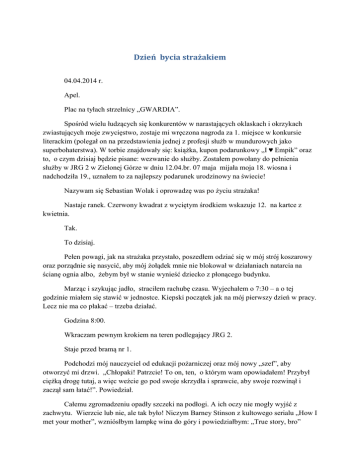 Dzień bycia strażakiem 04.04.2014 r. Apel. Plac na tyłach strzelnicy „GWARDIA”. Spośród wielu łudzących się konkurentów w narastających oklaskach i okrzykach zwiastujących moje zwycięstwo, zostaje mi wręczona nagroda za 1. miejsce w konkursie literackim (polegał on na przedstawienia jednej z profesji służb w mundurowych jako superbohaterstwa). W torbie znajdowały się: książka, kupon podarunkowy „I ♥ Empik” oraz to, o czym dzisiaj będzie pisane: wezwanie do służby. Zostałem powołany do pełnienia służby w JRG 2 w Zielonej Górze w dniu 12.04.br. 07 maja mijała moja 18. wiosna i nadchodziła 19., uznałem to za najlepszy podarunek urodzinowy na świecie! Nazywam się Sebastian Wolak i oprowadzę was po życiu strażaka! Nastaje ranek. Czerwony kwadrat z wyciętym środkiem wskazuje 12. na kartce z kwietnia. Tak. To dzisiaj. Pełen powagi, jak na strażaka przystało, poszedłem odziać się w mój strój koszarowy oraz porządnie się nasycić, aby mój żołądek mnie nie blokował w działaniach natarcia na ścianę ognia albo, żebym był w stanie wynieść dziecko z płonącego budynku. Marząc i szykując jadło, straciłem rachubę czasu. Wyjechałem o 7:30 – a o tej godzinie miałem się stawić w jednostce. Kiepski początek jak na mój pierwszy dzień w pracy. Lecz nie ma co płakać – trzeba działać. Godzina 8:00. Wkraczam pewnym krokiem na teren podlegający JRG 2. Staje przed bramą nr 1. Podchodzi mój nauczyciel od edukacji pożarniczej oraz mój nowy „szef”, aby otworzyć mi drzwi. „Chłopaki! Patrzcie! To on, ten, o którym wam opowiadałem! Przybył ciężką drogę tutaj, a więc weźcie go pod swoje skrzydła i sprawcie, aby swoje rozwinął i zaczął sam łatać!”. Powiedział. Całemu zgromadzeniu opadły szczeki na podłogi. A ich oczy nie mogły wyjść z zachwytu. Wierzcie lub nie, ale tak było! Niczym Barney Stinson z kultowego serialu „How I met your mother”, wzniósłbym lampkę wina do góry i powiedziałbym: „True story, bro” (ang. Prawdziwa historia, brachu). Trochę się zdziwiłem, bo to przecież za sprawą konkursu literackiego zostałem tutaj zaproszony. No ale pewnie wspominano o moich nadzwyczajnych zdolnościach, stad ten podziw. Jak zostało im powiedziane, tak uczynili. Wesołą grupą chłopaków w czarnych uniformach z odblaskami i napisem STRAŻ poszliśmy zjeść wspólne śniadanie.„Cholipka, przecież już jadłem, przez to się spóźniłem” – pomyślałem. Wypiłem tylko herbatę. Powiem wam na wstępie, że chłopaki od razu miło mnie przywitali. Najwidoczniej w pojedynkę nie mogłem im wielce zaszkodzić. Podczas posiłku dowódca zmiany przedstawił nam plan dnia. Był on czysty jak kropla wody i przejrzysty jak lusterko w samochodzie, czy też szyba w drzwiach czy bramach… Naszym zadaniem było… umyć bramy wyjazdowe w garażu oraz jeden z wozów. Szczerze? Strażacy, którym pomagałem, od razu się zdziwili, że służba w sobotę (dzień porządkowy) ma być moją nagrodą. No ale ja dalej nie traciłem nadziei. Przecież ogień lub inne zagrożenie atakują znienacka. Nawet w sobotę. A z resztą, miałem zobaczyć, jak żyje strażak. Oprócz wezwań mają także obowiązki, co również jest ważne. Bo przecież nie chcemy się cofnąć do śmierdzącego wszystkim średniowiecza. Po śniadaniu i po naradzie zszedłem jak każdy normalny strażak po schodach (nie po ześlizgu) na dół, do garażu. Pomijając kwestię ugoszczenia kolegów z klasy w „mojej remizie” (mieli ćwiczenia w komorze dymnej ), musiałem zakasać rękawy i brnąc w kierunku wozu bojowego, aby wyciągnąć coś na wzór drabiny. Ten profesjonalny sprzęt był nam potrzebny do jakże profesjonalnego mycia okien w bramach wjazdowych do garażu. Oczywiście było wesoło. Obsługując myjkę ciśnieniową, czułem się jak strażak w natarciu z podłączoną 52’ (typ węża) na bramę piekieł, z której wydobywały się ogniste jęzory. Zbierając wodę z okien lub myjąc je, czułem jakbym rozwalał sufit w zgaszonym domu, w celu sprawdzenia czy aby nie został tam jakiś żar, zagrażający temu budynku. Trochę wyobraźni i wszystko może być przyjemniejsze. Kolejny manewr, który wykonywaliśmy był jakże bojowe! Był, ponieważ czyściliśmy jeden z wozów bojowych! Tym razem nie „poszczęściło” mi się i nie przeprowadzałem natarcia KARCHEREM. Za to obsługiwałem ściągaczkę-do-wody (Tak to nazwałem. Pewnie ma inna profesjonalną nazwę, ale wyszła mi ona z głowy. Wygląda jak szczota, tyle że na końcu kija była guma). Tym razem szczotą usuwałem zanieczyszczenia z ulicy po wypadku samochodowym, do którego zostaliśmy wezwani. („Zamiatałem” wodę za bramę albo do kanalizacji. Wóz był czyszczony w garażu) Było super! Kolejny dobry uczynek został wykonany! Jak każdy superbohater musimy jeść. Cała zmiana poszła przyrządzać sobie posiłek popołudniowy. Ja poszedłem ich śladem. Strażacy byli zadowoleni, bo większość poleceń zostało wykonanych. Głodny po pracy zjadłem swój na szybko przyrządzony prowiant. Wiele to nie dało. Na szczęście z pomocą przyszło danie przyrządzone dla mnie przez moją fankę. Daniesałatka było przepyszne! Do dziś zastanawia mnie przepis tego smakołyku. Po zasłużonym posiłku wszyscy rozeszli się do swoich obowiązków. A ja? Ja próbowałem odnaleźć się w tym labiryncie. „Gdzie oni wszyscy się podziali?!”. Zacząłem bez celu wędrować po budynku. Spotkałem grupę strażaków z OSP oraz tych z PSP, którzy szkolili tych pierwszych. Idąc dalej, trafiłem do garażu. Tam przyglądałem się każdemu wozowi. Niczego nie dotykałem w obawie, że coś sknocę. Mam do tego talent! A przecież w każdym momencie mogło być wezwanie. Znów zwiedziłem garaż, korytarz, siłownie, korytarz, korytarz, korytarz itp., itd. Nagle nastąpiło zebranie przed wozem, w którym trzeba było naprawić z