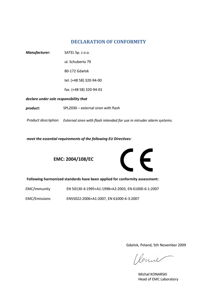 DECLARATION OF CONFORMITY Manufacturer: SATEL Sp. z o.o. ul. Schuberta 79 80-172 Gdańsk tel. (+48 58) 320-94-00 fax. (+48 58) 320-94-01 declare under sole responsibility that product: SPL2030 – external siren with flash Product description: External siren with flash intended for use in intruder alarm systems. meet the essential requirements of the following EU Directives: EMC: 2004/108/EC Following harmonized standards have been applied for conformity assessment: EMC/Immunity EN 50130-4:1995+A1:1998+A2:2003, EN 61000-6-1:2007 EMC/Emissions EN55022:2006+A1:2007, EN 61000-6-3:2007 Gdańsk, Poland, 5th November 2009 Michał KONARSKI Head of EMC Laboratory