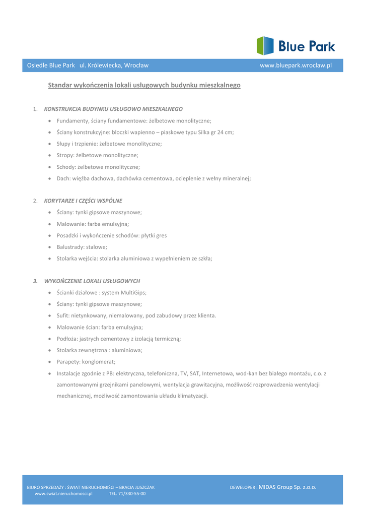 Osiedle Blue Park ul. Królewiecka, Wrocław www.bluepark.wroclaw.pl Standar wykończenia lokali usługowych budynku mieszkalnego 1. KONSTRUKCJA BUDYNKU USŁUGOWO MIESZKALNEGO  Fundamenty, ściany fundamentowe: żelbetowe monolityczne;  Ściany konstrukcyjne: bloczki wapienno – piaskowe typu Silka gr 24 cm;  Słupy i trzpienie: żelbetowe monolityczne;  Stropy: żelbetowe monolityczne;  Schody: żelbetowe monolityczne;  Dach: więźba dachowa, dachówka cementowa, ocieplenie z wełny mineralnej; 2. KORYTARZE I CZĘŚCI WSPÓLNE  Ściany: tynki gipsowe maszynowe;  Malowanie: farba emulsyjna;  Posadzki i wykończenie schodów: płytki gres  Balustrady: stalowe;  Stolarka wejścia: stolarka aluminiowa z wypełnieniem ze szkła; 3. WYKOŃCZENIE LOKALI USŁUGOWYCH  Ścianki działowe : system MultiGips;  Ściany: tynki gipsowe maszynowe;  Sufit: nietynkowany, niemalowany, pod zabudowy przez klienta.  Malowanie ścian: farba emulsyjna;  Podłoża: jastrych cementowy z izolacją termiczną;  Stolarka zewnętrzna : aluminiowa;  Parapety: konglomerat;  Instalacje zgodnie z PB: elektryczna, telefoniczna, TV, SAT, Internetowa, wod-kan bez białego montażu, c.o. z zamontowanymi grzejnikami panelowymi, wentylacja grawitacyjna, możliwość rozprowadzenia wentylacji mechanicznej, możliwość zamontowania układu klimatyzacji. BIURO SPRZEDAŻY : ŚWIAT NIERUCHOMIŚCI – BRACIA JUSZCZAK www.swiat.nieruchomosci.pl TEL. 71/330-55-00 DEWELOPER : MIDAS Group Sp. z.o.o.