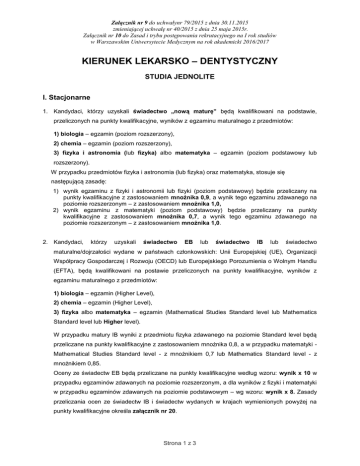 Załącznik nr 9 do uchwałynr 79/2015 z dnia 30.11.2015 zmieniającej uchwałę nr 40/2015 z dnia 25 maja 2015r. Załącznik nr 10 do Zasad i trybu postępowania rekrutacyjnego na I rok studiów w Warszawskim Uniwersytecie Medycznym na rok akademicki 2016/2017 KIERUNEK LEKARSKO – DENTYSTYCZNY STUDIA JEDNOLITE I. Stacjonarne 1. Kandydaci, którzy uzyskali świadectwo „nową maturę” będą kwalifikowani na podstawie, przeliczonych na punkty kwalifikacyjne, wyników z egzaminu maturalnego z przedmiotów: 1) biologia – egzamin (poziom rozszerzony), 2) chemia – egzamin (poziom rozszerzony), 3) fizyka i astronomia (lub fizyka) albo matematyka – egzamin (poziom podstawowy lub rozszerzony). W przypadku przedmiotów fizyka i astronomia (lub fizyka) oraz matematyka, stosuje się następującą zasadę: 1) wynik egzaminu z fizyki i astronomii lub fizyki (poziom podstawowy) będzie przeliczany na punkty kwalifikacyjne z zastosowaniem mnożnika 0,9, a wynik tego egzaminu zdawanego na poziomie rozszerzonym – z zastosowaniem mnożnika 1,0, 2) wynik egzaminu z matematyki (poziom podstawowy) będzie przeliczany na punkty kwalifikacyjne z zastosowaniem mnożnika 0,7, a wynik tego egzaminu zdawanego na poziomie rozszerzonym – z zastosowaniem mnożnika 1,0. 2. Kandydaci, którzy uzyskali świadectwo EB lub świadectwo IB lub świadectwo maturalne/dojrzałości wydane w państwach członkowskich: Unii Europejskiej (UE), Organizacji Współpracy Gospodarczej i Rozwoju (OECD) lub Europejskiego Porozumienia o Wolnym Handlu (EFTA), będą kwalifikowani na postawie przeliczonych na punkty kwalifikacyjne, wyników z egzaminu maturalnego z przedmiotów: 1) biologia – egzamin (Higher Level), 2) chemia – egzamin (Higher Level), 3) fizyka albo matematyka – egzamin (Mathematical Studies Standard level lub Mathematics Standard level lub Higher level). W przypadku matury IB wyniki z przedmiotu fizyka zdawanego na poziomie Standard level będą przeliczane na punkty kwalifikacyjne z zastosowaniem mnożnika 0,8, a w przypadku matematyki Mathematical Studies Standard level - z mnożnikiem 0,7 lub Mathematics Standard level - z mnożnikiem 0,85. Oceny ze świadectw EB będą przeliczane na punkty kwalifikacyjne według wzoru: wynik x 10 w przypadku egzaminów zdawanych na poziomie rozszerzonym, a dla wyników z fizyki i matematyki w przypadku egzaminów zdawanych na poziomie podstawowym – wg wzoru: wynik x 8. Zasady przeliczania ocen ze świadectw IB i świadectw wydanych w krajach wymienionych powyżej na punkty kwalifikacyjne określa załącznik nr 20. Strona 1 z 3 Załącznik nr 9 do uchwałynr 79/2015 z dnia 30.11.2015 zmieniającej uchwałę nr 40/2015 z dnia 25 maja 2015r. Załącznik nr 10 do Zasad i trybu postępowania rekrutacyjnego na I rok studiów w Warszawskim Uniwersytecie Medycznym na rok akademicki 2016/2017 Jeżeli na świadectwie IB brakuje wyniku z wymaganego przedmiotu zdawanego na wymaganym poziomie, kandydat może uzupełnić brakujący wynik przystępując do UEW. 3. Kandydaci, którzy uzyskali świadectwo „starą maturę” lub świadectwo maturalne / dojrzałości poza granicami Polski w państwach innych niż państwa członkowskie: UE, (OECD) lub (EFTA), będą kwalifikowani na podstawie, przeliczonych na punkty kwalifikacyjne, wyników UEW z przedmiotów: 1) biologia – egzamin pisemny (równoważny z poziomem rozszerzonym „nowej matury"), 2) chemia – egzamin pisemny (równoważny z poziomem rozszerzonym „nowej matury"), 3) fizyka albo matematyka – egzamin pisemny (równoważny z poziomem rozszerzonym „nowej matury"). W przypadku przedmiotów fizyka i astronomia (lub fizyka) oraz matematyka, stosuje się następującą zasadę: 3) wynik egzaminu z fizyki i astronomii lub fizyki (poziom podstawowy) będzie przeliczany na punkty kwalifikacyjne z zastosowaniem mnożnika 0,9, a wynik tego egzaminu zdawanego na poziomie rozszerzonym – z zastosowaniem mnożnika 1,0, 4) wynik egzaminu z matematyki (poziom podstawowy) będzie przeliczany na punkty kwalifikacyjne z zastosowaniem mnożnika 0,7, a wynik tego egzaminu zdawanego na poziomie rozszerzonym – z zastosowaniem mnożnika 1,0. 4. Jeżeli przyjęcie grupy kandydatów o takiej samej łącznej liczbie punktów powodowałoby przekroczenie limitu przyjęć, o kolejności w tej grupie decyduje liczba punktów z przedmiotu biologia, a następnie liczba punktów z przedmiotu chemia. Kandydaci zakwalifikowani do przyjęcia na studia stacjonarne, chcący studiować w języku angielskim, składają w wyznaczonym terminie wniosek o przeniesienie na studia w języku angielskim na warunkach częściowej odpłatności. Dalsze postępowanie kwalifikacyjne dla tej grupy kandydatów prowadzone jest według zasad opisanych w załączniku nr 19. II. Niestacjonarne (odpłatne: dawniej wieczorowe) O przyjęcie na studia może ubiegać się osoba, która: 1. spełnia wymogi kwalifikacyjne dla kandydatów na studia stacjonarne (patrz część I.) lub 2. ukończyła studia na kierunku lekarskim w WUM lub innych Akademiach lub Uniwersytetach Medycznych w kraju lub Collegium Medicum UMK lub UJ lub 3. ukończyła studia magisterskie na innych kierunkach i przystąpiła do UEW lub przedstawiła świadectwo „nową maturę” lub świadectwo IB lub świadectwo EB, zawierające wyniki egzaminów spełniających warunki przyjęć na studia stacjonarne (patrz część I.). Kwalifikacja kandydatów wymienionych w ust. 1 i 3 będzie odbywać się na podstawie sumy punktów obliczonych zgodnie z zasadami kwalifikacji na studia stacjonarne obowiązującymi w WUM. Strona 2 z 3 Załącznik nr 9 do uchwałynr 79/2015 z dnia 30.11.2015 zmieniającej uchwałę nr 40/2015 z dnia 25 maja 2015r. Załącznik nr 10 do Zasad i trybu postępowania rekrutacyjnego na I rok studiów w Warszawskim Uniwersytecie Medycznym na rok akademicki 2016/2017 Absolwenci wymienieni w ust. 2 będą przyjmowani w pierwszej kolejności na podstawie dyplomu ukończenia studi
