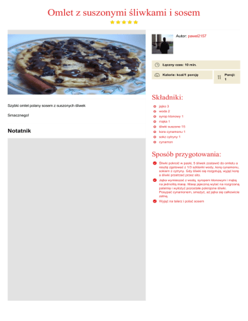 Omlet z suszonymi śliwkami i sosem Autor: pawel2157 Łączny czas: 10 min. Kalorie: kcal/1 porcję Porcji: 1 Składniki: Szybki omlet polany sosem z suszonych śliwek jajko 3 woda 2 Smacznego! syrop klonowy 1 mąka 1 śliwki suszone 15 Notatnik kora cynamonu 1 sokz cytryny 1 cynamon Sposób przygotowania: Śliwki pokroić w paski, 5 śliwek zostawić do omletu a resztę zgotować z 1/3 szklanki wody, korą cynamonu, sokiem z cytryny. Gdy śliwki się rozgotują, wyjąć korę a śliwki przetrzeć przez sito. Jajka wymieszać z wodą, syropem klonowym i mąką na jednolitą masę. Masę jajeczną wylać na rozgrzaną patelnię i wyłożyć pozostałe pokrojone śliwki. Posypać cynamonem, smażyć, aż jajka się całkowicie zetną. Wyjąć na talerz i polać sosem