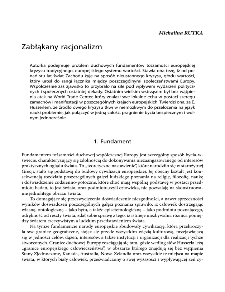 Michalina RUTKA Zabłąkany racjonalizm Autorka podejmuje problem duchowych fundamentów tożsamości europejskiej kryzysu tradycyjnego, europejskiego systemu wartości. Stawia ona tezę, iż od ponad stu lat świat Zachodu żyje na sposób nieustannego kryzysu, głodu wartości, który urósł do rangi łącznika między poszczególnymi społeczeństwami Europy. Współcześnie zaś zjawisko to przybrało na sile pod wpływem wydarzeń politycznych i społecznych ostatniej dekady. Ostatnim wielkim wstrząsem był bez wątpienia atak na World Trade Center, który znalazł swe lokalne echa w postaci szeregu zamachów i manifestacji w poszczególnych krajach europejskich. Twierdzi ona, za E. Husserlem, że źródło owego kryzysu tkwi w niemożliwym do przełożenia na język nauki problemie, jak połączyć w jedną całość, pragnienie bycia bezpiecznym i wolnym jednocześnie. 1. Fundament Fundamentem tożsamości duchowej współczesnej Europy jest szczególny sposób bycia-wświecie, charakteryzujący się zdolnością do dokonywania niezaangażowanego od interesów praktycznych oglądu świata. To „teoretyczne nastawienie”, które narodziło się w starożytnej Grecji, stało się podstawą do budowy cywilizacji europejskiej. Jej obecny kształt jest konsekwencją rozdziału poszczególnych gałęzi ludzkiego poznania na religię, filozofię, naukę i doświadczenie codzienno-potoczne, które choć mają wspólną podstawę w postaci przedmiotu badań, to jest świata, oraz podmiotu,czyli człowieka, nie pozwalają na skonstruowanie jednolitego obrazu świata. To domagające się przezwyciężenia doświadczenie niezgodności, a nawet sprzeczności wyników doświadczeń poszczególnych gałęzi poznania sprawiło, iż człowiek dostrzegając własną, ontologiczną – jako bytu, a także episetemologiczną – jako podmiotu poznającego, odrębność od reszty świata, zdał sobie sprawę z tego, iż istnieje niezbywalna różnica pomiędzy światem rzeczywistym a ludzkim przedstawieniem świata. Na tymże fundamencie narody europejskie zbudowały cywilizację, która przekroczyła swe granice geograficzne, stając się przede wszystkim więzią kulturową, przejawiającą się w jedności celów, dążeń, interesów, a także instytucji i organizacji dla realizacji tychże stworzonych. Granice duchowej Europy rozciągają się tam, gdzie według słów Husserla leżą „granice europejskiego człowieczeństwa”, w obszarze którego znajdują się bez wątpienia Stany Zjednoczone, Kanada, Australia, Nowa Zelandia oraz wszystkie te miejsca na mapie świata, w których biały człowiek, przeświadczony o swej wyższości i wypływającej zeń cy- 192 ROCZNIK BEZPIECZEŃSTWA MIĘDZYNARODOWEGO – 2006 wilizacyjnej misji, zniszczył rdzenną kulturę, ustanawiając własną, przywiezioną ze Starego Kontynentu1. Podbój i hegemonia Europy w świecie zaczęły się wraz z końcem epoki średniowiecza, kiedy to okazało się, że rzeczywistość niezmiennego świata symboli nie odpowiadała zmienności, która była obserwowalna w świecie doczesnym. A narzędzia poznawcze, jakie oferowała scholastyka, nie pozwalały na adekwatne jego poznanie. Próba przezwyciężenia tego braku stała się impulsem duchowej rewolucji, w efekcie której narodziła się epoka nowożytna. Polegała ona na zmianie kierunku poszukiwań myślowych i naukowych z metafizycznego świata uniwersalnych wartości i wiecznych prawd w stronę świata doczesnego, które to znalazło swe dopełnienie w ostatecznym rozdzieleniu świata – res extensa, od cogito – podmiotu poznającego. To Kartezjańskie odkrycie z jednej strony przyniosło rozkwit nauk fizykalnych, co w konsekwencji zaowocowało ogromnym i nabierającym coraz szybszego tempa rozwojem technologicznym, którego doświadczamy, także obecnie. Z drugiej jednak strony, zainicjowało całkowitą zmianę myślenia o człowieku i społeczeństwie, w którym wszystko to, co niemierzalne i nieweryfikowalne empirycznie lub niezrozumiałe na mocy rozumu – ratio, jak sfera przeżyć emocjonalnych czy religijnych, zostało odrzucone jako nienaukowe i zabobonne. Konsekwencją tegoż była niosąca nadzieję na stworzenie racjonalnego ładu rewolucja polityczna, która była przeniesieniem zasad mechaniki Newtona w świat człowieka, kulturę i społeczeństwo. Przejawiająca się w nieustannym poszukiwaniu obowiązującej wszystkich bez wyjątku, niezależnie od miejsca i historycznego czasu, prawdy – nomos. 2. Poszukiwanie jedności Horyzontem poszukiwań, przejawiających się zarówno w działaniu społeczeństw, jak i poszczególnych członków świata Zachodu, jest po dzień dzisiejszy, zapytywanie się o wzajemne relacje sfer cogito i res extensa. Ich współistnienie stanowi nieustanny przedmiot dociekań, które przejawia się w filozoficznym, religijnym, a obecnie i naukowym poszukiwaniu sposobu na przezwyciężenie owego rozłamu i przywróceniu człowiekowi „utraconej” jedności. Jego podstawę stanowią dwie najcenniejsze dla duchowych Europejczyków wartości, z których pierwszą jest potrzeba bezpieczeństwa, drugą zaś pragnienie wolności. Pierwsza zakotwiczona jest we wspólnotowym doświadczaniu świata i przeżyciu religijnym, druga zaś ma swe źródło w odczuwaniu odrębności i jest wynikiem rozwoju filozofii i nauki. Ich wzajemną relację można porównać do koniecznego współistnienia światła i cienia, które pozornie wykluczające się, stanowią jednak nierozerwalną całość. Owe pozornie sprzeczne pragnienia są różnie uświadamiane i wyrażane w zależności od wielu zmiennych zarówno historycznych, ekonomicznych, politycznych jak i stopnia wewnętrznego rozwoju jednostki. Stanowią jednak duchowy łącznik, który pozwala mówić o duchowej tożsamości Starego Kontynentu, a także zadawać pytanie o jego obecną kondy1 E. Husserl, Kryzys europejskiego człowieczeństwa a filozofia, Warszawa 1993, s. 16–2
