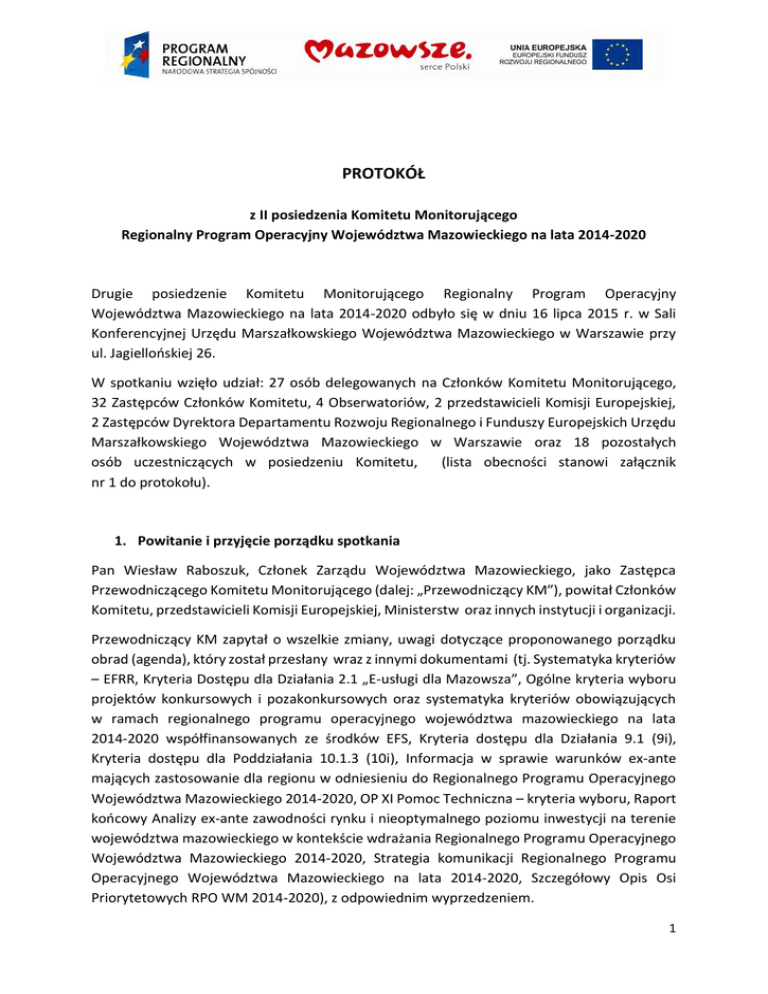 PROTOKÓŁ z II posiedzenia Komitetu Monitorującego Regionalny Program Operacyjny Województwa Mazowieckiego na lata 2014-2020 Drugie posiedzenie Komitetu Monitorującego Regionalny Program Operacyjny Województwa Mazowieckiego na lata 2014-2020 odbyło się w dniu 16 lipca 2015 r. w Sali Konferencyjnej Urzędu Marszałkowskiego Województwa Mazowieckiego w Warszawie przy ul. Jagiellońskiej 26. W spotkaniu wzięło udział: 27 osób delegowanych na Członków Komitetu Monitorującego, 32 Zastępców Członków Komitetu, 4 Obserwatoriów, 2 przedstawicieli Komisji Europejskiej, 2 Zastępców Dyrektora Departamentu Rozwoju Regionalnego i Funduszy Europejskich Urzędu Marszałkowskiego Województwa Mazowieckiego w Warszawie oraz 18 pozostałych osób uczestniczących w posiedzeniu Komitetu, (lista obecności stanowi załącznik nr 1 do protokołu). 1. Powitanie i przyjęcie porządku spotkania Pan Wiesław Raboszuk, Członek Zarządu Województwa Mazowieckiego, jako Zastępca Przewodniczącego Komitetu Monitorującego (dalej: „Przewodniczący KM”), powitał Członków Komitetu, przedstawicieli Komisji Europejskiej, Ministerstw oraz innych instytucji i organizacji. Przewodniczący KM zapytał o wszelkie zmiany, uwagi dotyczące proponowanego porządku obrad (agenda), który został przesłany wraz z innymi dokumentami (tj. Systematyka kryteriów – EFRR, Kryteria Dostępu dla Działania 2.1 „E-usługi dla Mazowsza”, Ogólne kryteria wyboru projektów konkursowych i pozakonkursowych oraz systematyka kryteriów obowiązujących w ramach regionalnego programu operacyjnego województwa mazowieckiego na lata 2014-2020 współfinansowanych ze środków EFS, Kryteria dostępu dla Działania 9.1 (9i), Kryteria dostępu dla Poddziałania 10.1.3 (10i), Informacja w sprawie warunków ex-ante mających zastosowanie dla regionu w odniesieniu do Regionalnego Programu Operacyjnego Województwa Mazowieckiego 2014-2020, OP XI Pomoc Techniczna – kryteria wyboru, Raport końcowy Analizy ex-ante zawodności rynku i nieoptymalnego poziomu inwestycji na terenie województwa mazowieckiego w kontekście wdrażania Regionalnego Programu Operacyjnego Województwa Mazowieckiego 2014-2020, Strategia komunikacji Regionalnego Programu Operacyjnego Województwa Mazowieckiego na lata 2014-2020, Szczegółowy Opis Osi Priorytetowych RPO WM 2014-2020), z odpowiednim wyprzedzeniem. 1 Pani Magdalena Klaus z Fundacji Aktywizacji zaproponowała przeniesienie na kolejne spotkanie dyskusji na temat punktu 11 i 12 z agendy, ponieważ nie została podjęta dyskusja na temat zgłoszonych przez Panią Klaus na grupie roboczej i mailowo uwag dotyczących braku spójności zapisu Kryteriów z system akredytacji oraz wątpliwości co do alokacji wskaźników. Przewodniczący KM zaproponował, aby dyskusję nad usunięciem punktów z porządku obrad przełożyć na moment prezentacji Kryteriów wyboru dla Działania 9.3. Pan Daniel Prędkopowicz, Przedstawiciel Federacji MAZOWIA wskazał, że nie odbyło się jeszcze żadne spotkanie Grup roboczych. Przewodniczący KM w odpowiedzi na uwagę poinformował, że odbyły się spotkania robocze, na podstawie zgłoszeń z poprzedniego Komitetu, natomiast na obecnym Komitecie zostaną podjęte uchwały ws. powołania Grup roboczych. Po wysłuchaniu wszystkich uwag porządek obrad (agenda) został przyjęty w głosowaniu jawnym, wymaganą większością głosów. 2. Wręczenie aktów powołania Przewodniczący Komitetu Monitorującego Pan Wiesław Raboszuk – Członek Zarządu Województwa Mazowieckiego, wręczył imienne nominacje nowym Członkom Komitetu Monitorującego. 3. Prezentacja Kryteriów ogólnych wyboru projektów konkursowych w ramach Regionalnego Programu Operacyjnego Województwa Mazowieckiego na lata 20142020 współfinansowanych ze środków EFRR. Prezentację dotyczącą Kryteriów ogólnych wyboru projektów konkursowych w ramach Regionalnego Programu Operacyjnego Województwa Mazowieckiego na lata 2014-2020 współfinansowanych ze środków EFRR przedstawił Pan Artur Waś – Główny Specjalista, Wydział Programowania RPO WM 2014-2020 w Departamencie Rozwoju Regionalnego i Funduszy Europejskich. Kryteria zostały uzgodnione ze wszystkimi IP, z Zespołem roboczym w ramach Prekomitetu oraz Ministerstwem Infrastruktury i Rozwoju, pod kątem zgodności z umową partnerstwa. (Tryb ustawowy Art.7 Ustawy wdrożeniowej). Kryteria zostały zatwierdzone przez Zarząd Województwa Mazowieckiego 30 czerwca 2015 r. Komisja Europejska i Członkowie Komitetu nie zgłosiły żadnych uwag. Pani Anna Sulińska-Wójcik - Naczelnik Wydziału Koordynacji Strategicznej i Zarządczej, Departament Koordynacji Strategii i Polityk Rozwoju Ministerstwa Infrastruktury i Rozwoju, zgłosiła uwagę dotyczącą sposobu poprawiania wniosku o dofinasowanie, powołując się na Art. 37 Ustawy Wdrożeniowej. 2 Głos w tej sprawie zabrał również Pan Błażej Gorgol z Dyrekcji ds. Spraw Polityki Regionalnej Komisji Europejskiej, który przyłączył się do wniosku ws. zgłoszonej uwagi przez przedstawiciela Ministerstwa Infrastruktury i Rozwoju. Przewodniczący KM zapewnił, że zgłoszone uwagi będą uwzględnione w konkretnych zapisach dotyczących zasad danego konkursu. 4. Głosowanie nad przyjęciem uchwały zatwierdzającej Kryteria ogólne wyboru projektów konkursowych w ramach Regionalnego Programu Operacyjnego Województwa Mazowieckiego na lata 2014-2020 współfinansowanych ze środków EFRR. Po przedstawieniu projektu kryteriów oraz wysłuchaniu uwag zgłoszonych w trakcie dyskusji w poprzednim punkcie porządku obrad Przewodniczący KM przed głosowaniem przypomniał o zasadach głosowania dotyczących członków i zastępców członków. Następnie Przewodniczący KM zarządził głosowanie nad przyjęciem uchwały zatwierdzającej Kryteria ogólne wyboru projektów konkursowych w ramach Regionalnego Programu Operacyjnego Województwa Mazowieckiego na lata 2014-2020 współfina