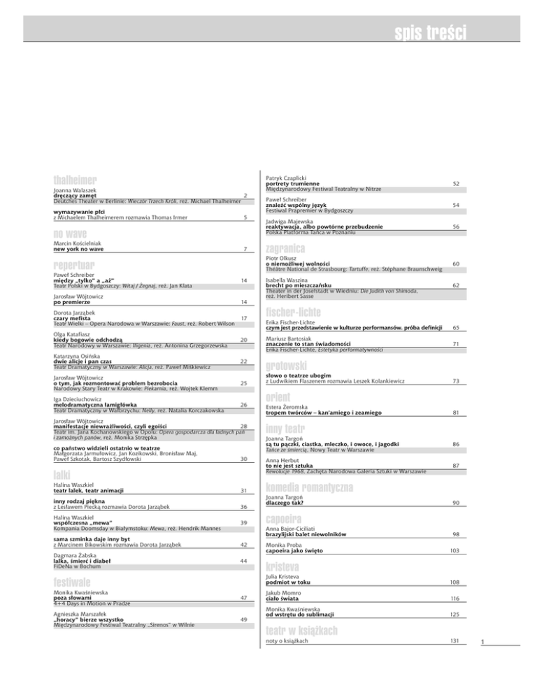 spis treści dział thalheimer Joanna Walaszek dręczący zamęt 2 Deutches Theater w Berlinie: Wieczór Trzech Króli, reż. Michael Thalheimer wymazywanie płci z Michaelem Thalheimerem rozmawia Thomas Irmer 5 no wave Marcin Kościelniak new york no wave 7 repertuar Paweł Schreiber między „tylko” a „aż” Teatr Polski w Bydgoszczy: Witaj / Żegnaj, reż. Jan Klata 14 Jarosław Wójtowicz po premierze 14 Dorota Jarząbek czary mefista Teatr Wielki – Opera Narodowa w Warszawie: Faust, reż. Robert Wilson 17 Olga Katafiasz kiedy bogowie odchodzą Teatr Narodowy w Warszawie: Ifigenia, reż. Antonina Grzegorzewska Patryk Czaplicki portrety trumienne Międzynarodowy Festiwal Teatralny w Nitrze 52 Paweł Schreiber znaleźć wspólny język Festiwal Prapremier w Bydgoszczy 54 Jadwiga Majewska reaktywacja, albo powtórne przebudzenie Polska Platforma Tańca w Poznaniu 56 zagranica Piotr Olkusz o niemożliwej wolności Théâtre National de Strasbourg: Tartuffe, reż. Stéphane Braunschweig 60 Isabella Waszina brecht po mieszczańsku Theater in der Josefstadt w Wiedniu: Die Judith von Shimoda, reż. Heribert Sasse 62 fischer-lichte Erika Fischer-Lichte czym jest przedstawienie w kulturze performansów. próba definicji 65 20 Mariusz Bartosiak znaczenie to stan świadomości Erika Fischer-Lichte, Estetyka performatywności 71 Katarzyna Osińska dwie alicje i pan czas Teatr Dramatyczny w Warszawie: Alicja, reż. Paweł Miśkiewicz 22 grotowski Jarosław Wójtowicz o tym, jak rozmontować problem bezrobocia Narodowy Stary Teatr w Krakowie: Piekarnia, reż. Wojtek Klemm 25 Iga Dzieciuchowicz melodramatyczna łamigłówka Teatr Dramatyczny w Wałbrzychu: Nelly, reż. Natalia Korczakowska 26 Jarosław Wójtowicz manifestacje niewrażliwości, czyli egoiści 28 Teatr im. Jana Kochanowskiego w Opolu: Opera gospodarcza dla ładnych pań i zamożnych panów, reż. Monika Strzępka co państwo widzieli ostatnio w teatrze Małgorzata Jarmułowicz, Jan Kozikowski, Bronisław Maj, Paweł Szkotak, Bartosz Szydłowski 30 lalki Halina Waszkiel teatr lalek, teatr animacji 31 inny rodzaj piękna z Lesławem Piecką rozmawia Dorota Jarząbek 36 Halina Waszkiel współczesna „mewa” Kompania Doomsday w Białymstoku: Mewa, reż. Hendrik Mannes sama szminka daje inny byt z Marcinem Bikowskim rozmawia Dorota Jarząbek Dagmara Żabska lalka, śmierć i diabeł FiDeNa w Bochum 39 słowo o teatrze ubogim z Ludwikiem Flaszenem rozmawia Leszek Kolankiewicz orient Estera Żeromska tropem twórców – kan’amiego i zeamiego Joanna Targoń są tu pączki, ciastka, mleczko, i owoce, i jagodki Tańce ze śmiercią, Nowy Teatr w Warszawie 86 Anna Herbut to nie jest sztuka Rewolucje 1968, Zachęta Narodowa Galeria Sztuki w Warszawie 87 komedia romantyczna Joanna Targoń dlaczego tak? Anna Bajor-Ciciliati brazylijski balet niewolników 44 kristeva 47 Agnieszka Marszałek „horacy” bierze wszystko Międzynarodowy Festiwal Teatralny „Sirenos” w Wilnie 49 90 capoeira Monika Proba capoeira jako święto Monika Kwaśniewska poza słowami 4+4 Days in Motion w Pradze 81 inny teatr 42 festiwale 73 98 103 Julia Kristeva podmiot w toku 108 Jakub Momro ciało świata 116 Monika Kwaśniewska od wstrętu do sublimacji 125 teatr w książkach noty o książkach 131 1