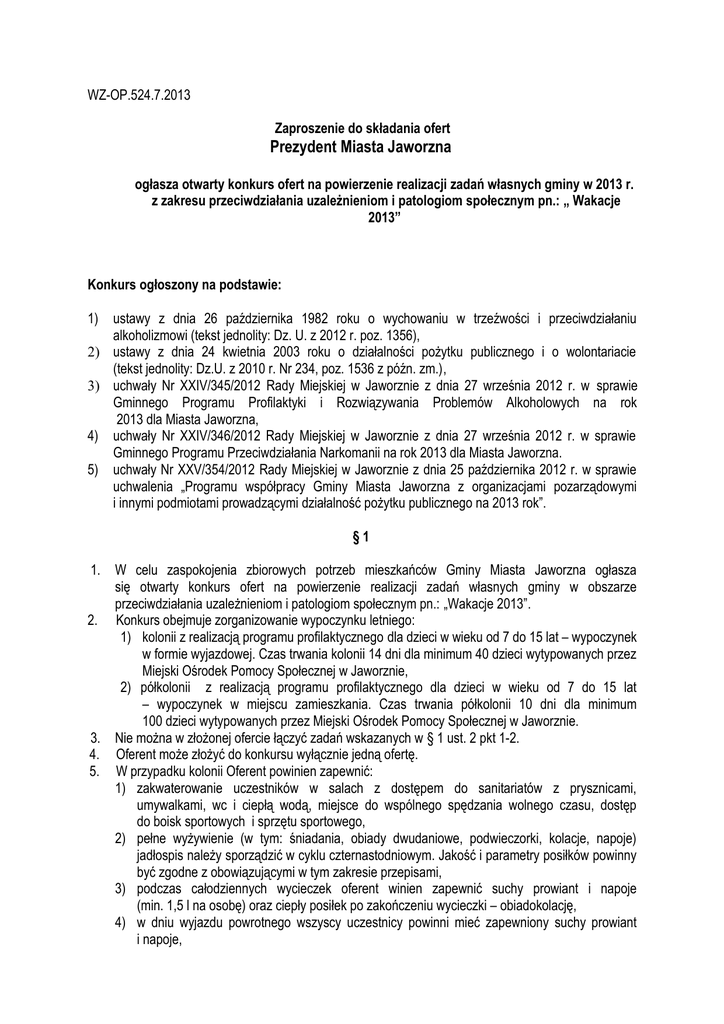 WZ-OP.524.7.2013 Zaproszenie do składania ofert Prezydent Miasta Jaworzna ogłasza otwarty konkurs ofert na powierzenie realizacji zadań własnych gminy w 2013 r. z zakresu przeciwdziałania uzależnieniom i patologiom społecznym pn.: „ Wakacje 2013” Konkurs ogłoszony na podstawie: 1) ustawy z dnia 26 października 1982 roku o wychowaniu w trzeźwości i przeciwdziałaniu alkoholizmowi (tekst jednolity: Dz. U. z 2012 r. poz. 1356), 2) ustawy z dnia 24 kwietnia 2003 roku o działalności pożytku publicznego i o wolontariacie (tekst jednolity: Dz.U. z 2010 r. Nr 234, poz. 1536 z późn. zm.), 3) uchwały Nr XXIV/345/2012 Rady Miejskiej w Jaworznie z dnia 27 września 2012 r. w sprawie Gminnego Programu Profilaktyki i Rozwiązywania Problemów Alkoholowych na rok 2013 dla Miasta Jaworzna, 4) uchwały Nr XXIV/346/2012 Rady Miejskiej w Jaworznie z dnia 27 września 2012 r. w sprawie Gminnego Programu Przeciwdziałania Narkomanii na rok 2013 dla Miasta Jaworzna. 5) uchwały Nr XXV/354/2012 Rady Miejskiej w Jaworznie z dnia 25 października 2012 r. w sprawie uchwalenia „Programu współpracy Gminy Miasta Jaworzna z organizacjami pozarządowymi i innymi podmiotami prowadzącymi działalność pożytku publicznego na 2013 rok”. §1 1. W celu zaspokojenia zbiorowych potrzeb mieszkańców Gminy Miasta Jaworzna ogłasza się otwarty konkurs ofert na powierzenie realizacji zadań własnych gminy w obszarze przeciwdziałania uzależnieniom i patologiom społecznym pn.: „Wakacje 2013”. 2. Konkurs obejmuje zorganizowanie wypoczynku letniego: 1) kolonii z realizacją programu profilaktycznego dla dzieci w wieku od 7 do 15 lat – wypoczynek w formie wyjazdowej. Czas trwania kolonii 14 dni dla minimum 40 dzieci wytypowanych przez Miejski Ośrodek Pomocy Społecznej w Jaworznie, 2) półkolonii z realizacją programu profilaktycznego dla dzieci w wieku od 7 do 15 lat – wypoczynek w miejscu zamieszkania. Czas trwania półkolonii 10 dni dla minimum 100 dzieci wytypowanych przez Miejski Ośrodek Pomocy Społecznej w Jaworznie. 3. Nie można w złożonej ofercie łączyć zadań wskazanych w § 1 ust. 2 pkt 1-2. 4. Oferent może złożyć do konkursu wyłącznie jedną ofertę. 5. W przypadku kolonii Oferent powinien zapewnić: 1) zakwaterowanie uczestników w salach z dostępem do sanitariatów z prysznicami, umywalkami, wc i ciepłą wodą, miejsce do wspólnego spędzania wolnego czasu, dostęp do boisk sportowych i sprzętu sportowego, 2) pełne wyżywienie (w tym: śniadania, obiady dwudaniowe, podwieczorki, kolacje, napoje) jadłospis należy sporządzić w cyklu czternastodniowym. Jakość i parametry posiłków powinny być zgodne z obowiązującymi w tym zakresie przepisami, 3) podczas całodziennych wycieczek oferent winien zapewnić suchy prowiant i napoje (min. 1,5 l na osobę) oraz ciepły posiłek po zakończeniu wycieczki – obiadokolację, 4) w dniu wyjazdu powrotnego wszyscy uczestnicy powinni mieć zapewniony suchy prowiant i napoje, 5) transport z siedziby Zamawiającego do miejsca wypoczynku i transport z miejsca wypoczynku do siedziby Zamawiającego, 6) opiekunów na czas dojazdu w ilości minimum jednego opiekuna na grupę piętnastoosobową, 7) kadrę posiadającą stosowne kwalifikacje i doświadczenie w zakresie organizowania wypoczynku dla dzieci i młodzieży, minimum jeden opiekun na grupę piętnastoosobową (w składzie kadry co najmniej jeden opiekun posiadający kwalifikacje upoważniające do realizacji programu profilaktycznego – osoba realizująca program profilaktyczny nie może pełnić funkcji wychowawcy), 8) realizacja programu profilaktycznego musi być prowadzona przez osoby z wykształceniem psychologicznym, pedagogicznym lub z przygotowaniem i popartym zaświadczeniami doświadczeniem do prowadzenia terapii dzieci i młodzieży, 9) ubezpieczenie uczestników kolonii od następstw nieszczęśliwych wypadków, 10) bezpieczne warunki wypoczynku i właściwą opiekę wychowawczą, pedagogiczną i medyczną. Wypoczynek musi być zorganizowany zgodnie z rozporządzeniem Ministra Edukacji Narodowej w sprawie warunków, jakie muszą spełniać organizatorzy wypoczynku dla dzieci i młodzieży szkolnej, a także zasad jego organizowania i nadzorowania, 11) program profilaktyczny należy rozpisać na każdy dzień odrębnie, 12) program turystyczno – kulturalny (wycieczki, zabawy, ogniska i inne formy rekreacji), 13) koszt przypadający na jednego uczestnika nie może być wyższy niż 1 200,00 zł. 6. W przypadku półkolonii Oferent powinien zapewnić: 1) 2 turnusy trwające min. 10 dni, 2) minimum 6 h zajęć dziennie, 3) wyżywienie przynajmniej w postaci drugiego śniadania, dwudaniowego obiadu, podwieczorek, napoje. Jakość i parametry posiłków powinny być zgodne z obowiązującymi w tym zakresie przepisami, 4) program turystyczno – kulturalny (w tym: zajęcia plastyczno – manualne, zajęcia sportowe i inne), 5) w przypadku 10 dniowych półkolonii przynajmniej 2 wycieczki jednodniowe krajoznawczo – turystyczne (w przypadku wycieczek 1 dniowych Oferent powinien zapewnić posiłek w formie suchego prowiantu oraz napoje), 6) kadrę posiadającą stosowne kwalifikacje i doświadczenie w zakresie organizowania wypoczynku dla dzieci i młodzieży, minimum jeden opiekun na grupę piętnastoosobową (w składzie kadry co najmniej jeden opiekun posiadający kwalifikacje upoważniające do realizacji programu profilaktycznego – osoba realizująca program nie może pełnić funkcji wychowawcy), 7) bezpieczne warunki wypoczynku i właściwą opiekę wychowawczą, pedagogiczną i medyczną. Wypoczynek musi być zorganizowany zgodnie z rozporządzeniem Ministra Edukacji Narodowej w sprawie warunków, jakie muszą spełniać organizatorzy wypoczynku dla dzieci i młodzieży szkolnej, a także zasad jego organizowania i nadzorowania, 8) program profilaktyczny należy rozpisać na każdy dzień odrębnie, 9) koszt przypadający na jednego uczestnika n