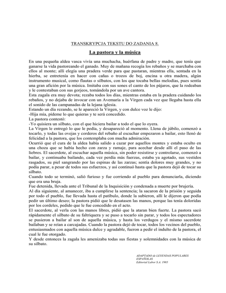TRANSKRYPCJA TEKSTU DO ZADANIA 8. La pastora y la música En una pequeña aldea vasca vivía una muchacha, huérfana de padre y madre, que tenía que ganarse la vida pastoreando el ganado. Muy de mañana recogía los rebaños y se marchaba con ellos al monte; allí elegía una pradera verde para que pastaran, mientras ella, sentada en la hierba, se entretenía en hacer con cañas o trozos de boj, encina u otra madera, algún instrumento musical, como flautas o silbatos, con los que tocaba bellas melodías, pues sentía una gran afición por la música. Imitaba con sus sones el canto de los pájaros, que la rodeaban y le contestaban con sus gorjeos, tomándola por un ave cantora. Esta zagala era muy devota; rezaba todos los días, mientras estaba en la pradera cuidando los rebaños, y no dejaba de invocar con un Avemaría a la Virgen cada vez que llegaba hasta ella el sonido de las campanadas de la lejana iglesia. Estando un día rezando, se le apareció la Virgen, y con dulce voz le dijo: -Hija mía, pídeme lo que quieras y te será concedido. La pastora contestó: -Yo quisiera un silbato, con el que hiciera bailar a todo el que lo oyera. La Virgen le entregó lo que le pedía, y desapareció al momento. Llena de júbilo, comenzó a tocarlo, y todas las ovejas y corderos del rebaño al escuchar empezaron a bailar, esto llenó de felicidad a la pastora, que los contemplaba con mucha admiración. Ocurrió que el cura de la aldea había salido a cazar por aquellos montes y estaba oculto en una choza que se había hecho con zarza y ramaje, para acechar desde allí el paso de las liebres. El sacerdote, al escuchar aquella música, sin poder resistirse y controlarse, comenzó a bailar, y continuaba bailando, cada vez perdía más fuerzas, estaba ya agotado, sus vestidos rasgados, su piel sangrando por las espinas de las zarzas; sentía dolores muy grandes, y no podía parar, a pesar de todos sus esfuerzos, y así continuó hasta que la pastora dejó de tocar su silbato. Cuando todo se terminó, salió furioso y fue corriendo al pueblo para denunciarla, diciendo que era una bruja. Fue detenida, llevada ante el Tribunal de la Inquisición y condenada a muerte por brujería. Al día siguiente, al amanecer, iba a cumplirse la sentencia; la sacaron de la prisión y seguida por todo el pueblo, fue llevada hasta el patíbulo, donde la subieron, allí le dijeron que podía pedir un último deseo; la pastora pidió que le desatasen las manos, porque las tenía doloridas por los cordeles, pedido que le fue concedido en el acto. El sacerdote, al verla con las manos libres, pidió que la ataran bien fuerte. La pastora sacó rápidamente el silbato de su faltriquera y se puso a tocarlo sin parar, y todos los espectadores se pusieron a bailar al son de aquella música, y hasta los verdugos y el mismo sacerdote bailaban y se reían a carcajadas. Cuando la pastora dejó de tocar, todos los vecinos del pueblo, entusiasmados con aquella música dulce y agradable, fueron a pedir el indulto de la pastora, el cual le fue otorgado. Y desde entonces la zagala les amenizaba todas sus fiestas y solemnidades con la música de su silbato. ADAPTADO de LEYENDAS POPULARES ESPAÑOLAS Editorial Labor S.A. 1985 TRANSKRYPCJA TEKSTU DO ZADANIA 9. La gripe, es una enfermedad infecciosa aguda, de la que muy rápida y fácilmente uno se puede contagiar. Esta enfermedad se presenta en forma de brotes epidémicos cada dos o cuatro años y puede aparecer con síntomas mínimos, semejantes al resfriado común, como la fiebre y la ronquera de la voz o con un comienzo brusco como: los escalofríos, la fiebre alta, el dolor de cabeza, los dolores musculares, la irritación de la garganta, el cansancio, la tos o la congestión de las vías respiratorias. La gripe evoluciona y si no hay complicaciones su curación puede durar de 3 a 5 días; generalmente es una enfermedad benigna, sin embargo causa una gran mortalidad en los grupos de alto riesgo como: los lactantes, mujeres gestantes, ancianos, enfermos del corazón, diabéticos, entre otros. La gripe tiene una trascendental importancia económica y sociolaboral. Desde el punto de vista económico, esta enfermedad representa un grave problema para la sociedad; si se estima que el 50% de los afectados puede estar en la edad laboral y con una media de baja de 7 días; es decir; que a las horas de trabajo que se pierden al año hay que sumar los costes de gastos médicos, farmacéuticos y la disminución de la productividad. La principal fuente de infección de esta epidemia son las mismas personas enfermas de gripe; ya que llevan en su sistema respiratorio una gran cantidad de este virus, el cual es expulsado para afuera en el momento de hablar, toser o al estornudar. La gripe no tiene un tratamiento específico por tratarse de un virus por infección; el paciente necesita reposo absoluto en una habitación templada, ingerir líquidos en abundancia para asegurar una hidratación correcta y una fluidez en las vías respiratorias. El tratamiento médico consiste en parar los síntomas, especialmente el de la fiebre, los dolores de cabeza y musculares. La aspirina, el paracetamol, la vitamina C entre otros, suelen ser los medicamentos más utilizados por su efecto analgésico y contra la fiebre. En cuanto a las recomendaciones para prevenir el contagio, es necesario utilizar un pañuelo (mejor desechable) al toser o estornudar. Los enfermos deben quedarse en casa para no contagiar a otras personas. Existen vacunas eficaces contra esta enfermedad que pueden proteger al organismo en un 60% y que alcanzan su máximo nivel de protección entre 3 y 6 semanas, por lo que se recomienda vacunarse más o menos en el mes de septiembre. Desgraciadamente las diferentes variaciones de este virus obligan a modificar dicha vacuna cada año. Adaptado de Euronews 1999 ARKUSZ IV Zadanie 8. max. 8 pkt (8 x 1 pkt) 8.1. 8.2. 8.3. 8.4. 8.5. 8.6. 8.7. 8.8. C. A. B. C. B. C. C. A. Zadanie 9. max. 7 pkt (7 x 1 pkt) 9