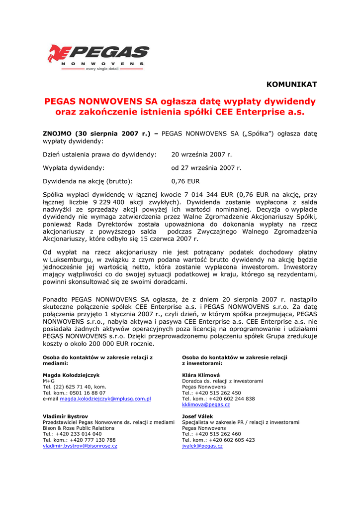KOMUNIKAT PEGAS NONWOVENS SA ogłasza datę wypłaty dywidendy oraz zakończenie istnienia spółki CEE Enterprise a.s. ZNOJMO (30 sierpnia 2007 r.) – PEGAS NONWOVENS SA („Spółka”) ogłasza datę wypłaty dywidendy: Dzień ustalenia prawa do dywidendy: 20 września 2007 r. Wypłata dywidendy: od 27 września 2007 r. Dywidenda na akcję (brutto): 0,76 EUR Spółka wypłaci dywidendę w łącznej kwocie 7 014 344 EUR (0,76 EUR na akcję, przy łącznej liczbie 9 229 400 akcji zwykłych). Dywidenda zostanie wypłacona z salda nadwyżki ze sprzedaży akcji powyżej ich wartości nominalnej. Decyzja o wypłacie dywidendy nie wymaga zatwierdzenia przez Walne Zgromadzenie Akcjonariuszy Spółki, ponieważ Rada Dyrektorów została upoważniona do dokonania wypłaty na rzecz akcjonariuszy z powyższego salda podczas Zwyczajnego Walnego Zgromadzenia Akcjonariuszy, które odbyło się 15 czerwca 2007 r. Od wypłat na rzecz akcjonariuszy nie jest potrącany podatek dochodowy płatny w Luksemburgu, w związku z czym podana wartość brutto dywidendy na akcję będzie jednocześnie jej wartością netto, która zostanie wypłacona inwestorom. Inwestorzy mający wątpliwości co do swojej sytuacji podatkowej w kraju, którego są rezydentami, powinni skonsultować się ze swoimi doradcami. Ponadto PEGAS NONWOVENS SA ogłasza, że z dniem 20 sierpnia 2007 r. nastąpiło skuteczne połączenie spółek CEE Enterprise a.s. i PEGAS NONWOVENS s.r.o. Za datę połączenia przyjęto 1 stycznia 2007 r., czyli dzień, w którym spółka przejmująca, PEGAS NONWOVENS s.r.o., nabyła aktywa i pasywa CEE Enterprise a.s. CEE Enterprise a.s. nie posiadała żadnych aktywów operacyjnych poza licencją na oprogramowanie i udziałami PEGAS NONWOVENS s.r.o. Dzięki przeprowadzonemu połączeniu spółek Grupa zredukuje koszty o około 200 000 EUR rocznie. Osoba do kontaktów w zakresie relacji z mediami: Osoba do kontaktów w zakresie relacji z inwestorami: Magda Kołodziejczyk M+G Tel. (22) 625 71 40, kom. Tel. kom.: 0501 16 88 07 e-mail [email protected] Klára Klímová Doradca ds. relacji z inwestorami Pegas Nonwovens Tel.: +420 515 262 450 Tel. kom.: +420 602 244 838 [email protected] Vladimír Bystrov Przedstawiciel Pegas Nonwovens ds. relacji z mediami Bison & Rose Public Relations Tel.: +420 233 014 040 Tel. kom.: +420 777 130 788 [email protected] Josef Válek Specjalista w zakresie PR / relacji z inwestorami Pegas Nonwovens Tel.: +420 515 262 460 Tel. kom.: +420 602 605 423 [email protected]
