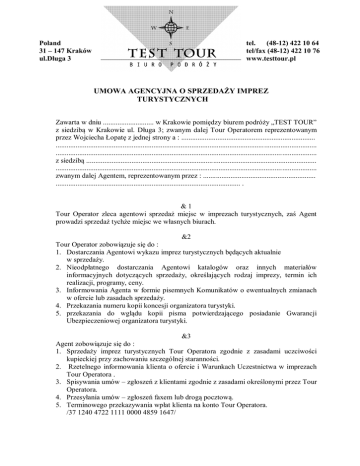 Poland 31 – 147 Kraków ul.Długa 3 tel. (48-12) 422 10 64 tel/fax (48-12) 422 10 76 www.testtour.pl UMOWA AGENCYJNA O SPRZEDAŻY IMPREZ TURYSTYCZNYCH Zawarta w dniu ............................ w Krakowie pomiędzy biurem podróży „TEST TOUR” z siedzibą w Krakowie ul. Długa 3; zwanym dalej Tour Operatorem reprezentowanym przez Wojciecha Łopatę z jednej strony a : .......................................................................... ................................................................................................................................................ ................................................................................................................................................ z siedzibą ............................................................................................................................... ................................................................................................................................................ zwanym dalej Agentem, reprezentowanym przez : .............................................................. ...................................................................................................... . &1 Tour Operator zleca agentowi sprzedaż miejsc w imprezach turystycznych, zaś Agent prowadzi sprzedaż tychże miejsc we własnych biurach. &2 Tour Operator zobowiązuje się do : 1. Dostarczania Agentowi wykazu imprez turystycznych będących aktualnie w sprzedaży. 2. Nieodpłatnego dostarczania Agentowi katalogów oraz innych materiałów informacyjnych dotyczących sprzedaży, określających rodzaj imprezy, termin ich realizacji, programy, ceny. 3. Informowania Agenta w formie pisemnych Komunikatów o ewentualnych zmianach w ofercie lub zasadach sprzedaży. 4. Przekazania numeru kopii koncesji organizatora turystyki. 5. przekazania do wglądu kopii pisma potwierdzającego posiadanie Gwarancji Ubezpieczeniowej organizatora turystyki. &3 Agent zobowiązuje się do : 1. Sprzedaży imprez turystycznych Tour Operatora zgodnie z zasadami uczciwości kupieckiej przy zachowaniu szczególnej staranności. 2. Rzetelnego informowania klienta o ofercie i Warunkach Uczestnictwa w imprezach Tour Operatora . 3. Spisywania umów – zgłoszeń z klientami zgodnie z zasadami określonymi przez Tour Operatora. 4. Przesyłania umów – zgłoszeń faxem lub drogą pocztową. 5. Terminowego przekazywania wpłat klienta na konto Tour Operatora. /37 1240 4722 1111 0000 4859 1647/ &4 1. Od cen imprez turystycznych Agent otrzymuje ustaloną prowizję, której wysokość określa komunikat prowizyjny stanowiący integralną część umowy. 2. Agent potrąca sobie prowizję od ostatniej wpłaty klienta i wystawia na jej wartość fakturę VAT . 3. Tour Operator od 7 dni od daty otrzymania ostatniej wpłaty wystawia klientowi fakturę VAT, przesyłając ją na adres Agenta. 4. Zamiar otrzymania faktury VAT przez klienta , Agent winien zgłosić pisemnie dokonując ostatniej wpłaty. 1. 2. 3. 4. &5 Agent zobowiązuje się do zapłaty należnej kwoty za imprezę turystyczną, pomniejszonej o należną sobie prowizję. Za dzień dokonania zapłaty uważa się datę uznania rachunku Tour Operatora. Tour Operator zastrzega sobie prawo anulacji zamówienia w przypadku braku zapłaty 30% wartości imprezy przez Agenta w ciągu 2 dni od daty dokonania rezerwacji, oraz w przypadku braku dopłaty do 100% na minimum 30 dni przed rozpoczęciem imprezy. Umowa – Zgłoszenie obowiązuje od momentu jej przyjęcia przez Tour Operatora i otrzymania 30% zaliczki. W przypadku rezerwacji na mniej niż 30 dni przed imprezą wymagane jest 100% wpłaty. &6 Brak określonych w &5 wpłat lub ich nieterminowość spowoduje nie dopuszczenie Klienta do udziału w imprezie. Wszelkie reklamacje i roszczenia obciążają wtedy Agenta. &7 Tour Operator oświadcza, że spełnia wymagania Ustawy z dnia 29 sierpnia 1997 r. o usługach turystycznych ( Dz. U. Nr 133, poz. 884, z późniejszymi zmianami) oraz decyzja Wojewody Małopolskiego nr 123 posiada zezwolenie na organizowanie imprez turystycznych. &8 1. Umowa niniejsza została zawarta na czas nieokreślony w dwóch jednobrzmiących egzemplarzach, po jednym dla każdej ze stron. 2. Z chwilą podpisania umowy tracą ważność umowy poprzednie. 3. Wszelkie zmiany umowy wymagają formy pisemnej pod rygorem nieważności. 4. w sprawach nieuregulowanych niniejszą umową znajdują zastosowanie odpowiednie przepisy Kodeksu Cywilnego. 5. Wszelkie spory mogące wyniknąć z realizacji niniejszej umowy rozstrzygane będą polubownie, a w przypadku nie dojścia do porozumienia, przez sąd właściwy dla siedziby Tour Operatora. &9 Tour Operator oświadcza, że jest płatnikiem podatku od towarów i usług VAT, posiada numer identyfikacji podatkowej NIP 676 – 101 – 11 – 67 i upoważnia Agenta do wystawiania faktur VAT bez jego podpisu. .................................................. AGENT