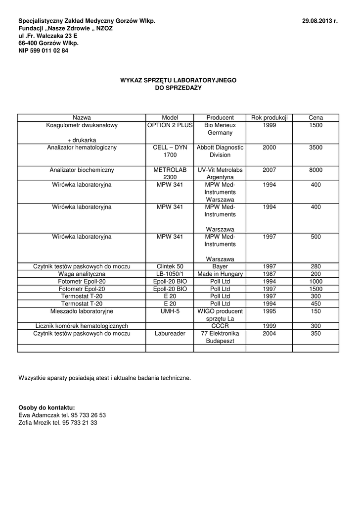 Specjalistyczny Zakład Medyczny Gorzów Wlkp. Fundacji „Nasze Zdrowie „ NZOZ ul .Fr. Walczaka 23 E 66-400 Gorzów Wlkp. NIP 599 011 02 84 29.08.2013 r. WYKAZ SPRZĘTU LABORATORYJNEGO DO SPRZEDAŻY Nazwa Koagulometr dwukanałowy Model OPTION 2 PLUS Producent Bio Merieux Germany Rok produkcji 1999 Cena 1500 CELL – DYN 1700 Abbott Diagnostic Division 2000 3500 8000 1994 400 Wirówka laboratoryjna MPW 341 UV-Vit Metrolabs Argentyna MPW MedInstruments Warszawa MPW MedInstruments 2007 Wirówka laboratoryjna METROLAB 2300 MPW 341 1994 400 Wirówka laboratoryjna MPW 341 1997 500 Czytnik testów paskowych do moczu Waga analityczna Fotometr Epoll-20 Fotometr Epol-20 Termostat T-20 Termostat T-20 Mieszadło laboratoryjne Clintek 50 LB-1050/1 Epoll-20 BIO Epoll-20 BIO E 20 E 20 UMH-5 1997 1987 1994 1997 1997 1994 1995 280 200 1000 1500 300 450 150 Licznik komórek hematologicznych Czytnik testów paskowych do moczu Labureader 1999 2004 300 350 + drukarka Analizator hematologiczny Analizator biochemiczny Wszystkie aparaty posiadają atest i aktualne badania techniczne. Osoby do kontaktu: Ewa Adamczak tel. 95 733 26 53 Zofia Mrozik tel. 95 733 21 33 Warszawa MPW MedInstruments Warszawa Bayer Made in Hungary Poll Ltd Poll Ltd Poll Ltd Poll Ltd WIGO producent sprzętu La CCCR 77 Elektronika Budapeszt