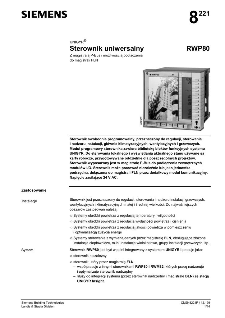 8 221 UNIGYR® Sterownik uniwersalny RWP80 Z magistralą P-Bus i możliwością podłączenia do magistrali FLN Sterownik swobodnie programowalny, przeznaczony do regulacji, sterowania i nadzoru instalacji, głównie klimatyzacyjnych, wentylacyjnych i grzewczych. Moduł programowy sterownika zawiera bibliotekę bloków funkcyjnych systemu UNIGYR. Do sterowania lokalnego i wyświetlania aktualnego stanu używane są karty robocze, przygotowywane oddzielnie dla poszczególnych projektów. Sterownik wyposażony jest w magistralę P-Bus do podłączenia zewnętrznych modułów I/O. Sterownik może pracować niezależnie lub jako jednostka podrzędna, dołączona do magistrali FLN przez dodatkowy moduł komunikacyjny. Napięcie zasilające 24 V AC. Zastosowanie Instalacje Sterownik jest przeznaczony do regulacji, sterowania i nadzoru instalacji grzewczych, wentylacyjnych i klimatyzacyjnych małej i średniej wielkości. Do najważniejszych obszarów zastosowań należą: • Systemy obróbki powietrza z regulacją temperatury i wilgotności • Systemy obróbki powietrza z regulacją wydajności powietrza i ciśnienia • Systemy obróbki powietrza z regulacją jakości powietrza w pomieszczeniu i optymalizacją zużycia energii • Systemy sterowania z wymianą danych przez magistralę FLN, obsługujące złożone instalacje ciepłownicze, m.in. instalacje wielokotłowe, grupy instalacji grzewczych, itp. System Sterownik RWP80 jest być w pełni integrowany z systemem UNIGYR i pracuje jako: • sterownik niezależny • sterownik, który przez magistralę FLN: – współpracuje z innymi sterownikami RWP80 i RWM82, których pracę nadzoruje i optymalizuje sterownik nadrzędny – służy do integracji systemu (przez sterownik nadrzędny i magistralę BLN) ze stacją UNIGYR Insight. Siemens Building Technologies Landis & Staefa Division CM2N8221P / 12.199 1/14 Przeznaczenie Sterownik przeznaczony głównie dla zastosowań grzewczych, wentylacyjnych i klimatyzacyjnych do sterowania: • wstępnie zaprojektowanych i gotowych rozwiązań standardowych instalacji HVAC • instalacji dostosowanych do potrzeb użytkownika • instalacji konstruowanych dla specyficznych zastosowań (hotele, służba zdrowia, przemysł farmaceutyczny, szkoły i in.). Funkcje Funkcje podstawowe Do najważniejszych funkcji należą: • realizacja aplikacji skonfigurowanej w module programowym • odczyt / zapis danych do/ z modułów I/O oraz kompaktowych modułów I/O przez magistralę procesową P-bus • zasilanie modułów I/O przez magistralę P-Bus • obsługa komunikacji z innymi urządzeniami sieci (przez moduł komunikacyjny) • obsługa lokalnego panelu operatorskiego Funkcje aplikacji Sam sterownik zapewnia tylko niezbędną infrastrukturę dla umieszczenia i przetwarzania funkcji systemowych i aplikacyjnych. Moduły umieszczane w sterowniku zawierają funkcje obsługi procesów instalacji i komunikacji na magistrali FLN. Informacje na ten temat znajdują się oddzielnych kartach katalogowych; patrz „Urządzenia współpracujące”. Komunikacja FLN Uwaga Zastosowanie opcjonalnego modułu komunikacyjnego umożliwia dołączanie sterowników RWP80 do magistrali FLN jako jednostek podrzędnych, których pracę koordynuje sterownik nadrzędny. Połączenie magistrali FLN przez sterownik nadrzędny z magistralą BLN znacznie rozszerza funkcje systemu, między innymi o: • przesyłanie wybranych wielkości procesowych do sterownika nadrzędnego i/ lub stacji UNIGYR Insight • optymalizację pracy systemu na podstawie przesyłanych wielkości procesowych, m.in. temperatury na zewnątrz, zapotrzebowania na ciepło, stanów alarmowych oraz wielkości sterujących, co ma na celu uzyskanie energooszczędnej instalacji. FLN: Jest siecią na poziomie systemu używaną głównie do regulacji i sterowania w oparciu o sterowniki do aplikacji standardowych. Szczegółowy opis sieci FLN znajduje się w karcie katalogowej 8026. Działanie magistral FLN oparte jest na protokole komunikacyjnym PROFIBUS, zgodnym z normą DIN 19 245. Funkcje operatorskie i wyświetlanie Lokalna obsługa sterownika, funkcje operatorskie i wyświetlania, a także sposób korzystania z książeczek użytkownika opisane są w punkcie „Konstrukcja sterownika”. Niezawodność funkcjonalna Opis reakcji sterownika z punktu widzenia niezawodności funkcjonowania i bezpieczeństwa systemu znajduje się w punkcie „Opis techniczny". Funkcje serwisowe i diagnostyczne • Złącze narzędziowe na płycie czołowej sterownika używane podczas uruchamiania, zmian konfiguracji i prac serwisowych • Karty serwisowe z instrukcjami dla użytkownika (zestaw serwisowy) • Karty serwisowe i diagnostyczne oraz instrukcje dla autoryzowanego personelu serwisowego CM2N8221P / 12.1999 2/14 Siemens Building Technologies Landis & Staefa Division Zestawienie typów Nr karty katalogowej Urządzenie Typ Sterownik Sterownik standardowy RWP80.001 8221 Moduły programowe • z pamięcią 32 KB na dane konfiguracyjne • z pamięcią 64 KB na dane konfiguracyjne AZA80.01-...* AZA80.02-...* 8262 8262 * Pełny numer określonego typu zawiera wersję systemu niezbędną przy zamawianiu, np. AZA80.01-070 dla wersji 7. Moduł komunikacyjny Moduł komunikacyjny dla magistrali FLN Dostawa Dostarczany sterownik jest przystosowany do montażu panelowego. Montaż naścienny w szafie sterowniczej wykonuje się bez stosowania dodatkowych akcesoriów. Moduł programowy oraz opcjonalny moduł komunikacyjny muszą być zamawiane oddzielnie. Akcesoria Poniżej podano wykaz akcesoriów, które można zamawiać stosownie do potrzeb. Informacje o akcesoriach serwisowych znajdują się w części „Konstrukcja sterownika”. Urządzenia współpracujące Moduły podstawowe I/O i moduły kompaktowe I/O Wskaźnik stanów Urządzenia magistrali FLN Siemens Building Technologies Landis & Staefa Division AZC80.10 Przewód narzędziowy Adapter do przewodu narzędziowego Zestaw serwisowy z kar