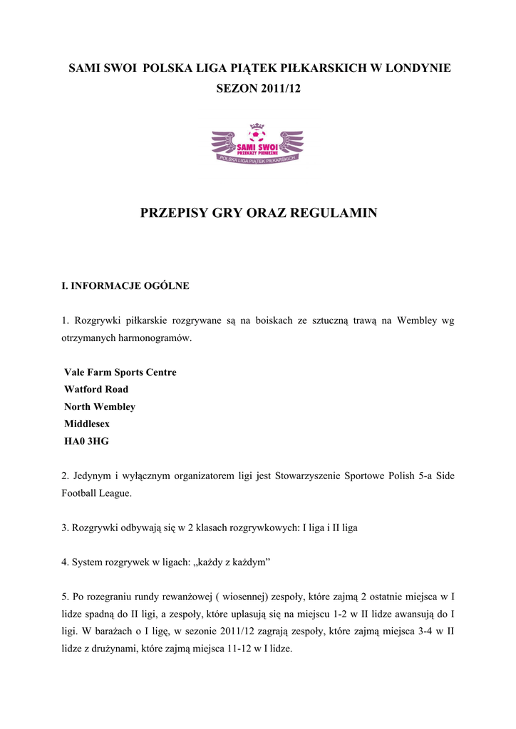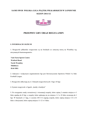SAMI SWOI POLSKA LIGA PIĄTEK PIŁKARSKICH W LONDYNIE SEZON 2011/12 PRZEPISY GRY ORAZ REGULAMIN I. INFORMACJE OGÓLNE 1. Rozgrywki piłkarskie rozgrywane są na boiskach ze sztuczną trawą na Wembley wg otrzymanych harmonogramów. Vale Farm Sports Centre Watford Road North Wembley Middlesex HA0 3HG 2. Jedynym i wyłącznym organizatorem ligi jest Stowarzyszenie Sportowe Polish 5-a Side Football League. 3. Rozgrywki odbywają się w 2 klasach rozgrywkowych: I liga i II liga 4. System rozgrywek w ligach: „każdy z każdym” 5. Po rozegraniu rundy rewanżowej ( wiosennej) zespoły, które zajmą 2 ostatnie miejsca w I lidze spadną do II ligi, a zespoły, które uplasują się na miejscu 1-2 w II lidze awansują do I ligi. W barażach o I ligę, w sezonie 2011/12 zagrają zespoły, które zajmą miejsca 3-4 w II lidze z drużynami, które zajmą miejsca 11-12 w I lidze. 6. Pierwszeństwo w grze w lidze w dalszych rundach mają uczestniczące drużyny po dokonaniu wpłaty wpisowego, pozostałe (nowe) zespoły rozpoczynają swój start-udział w miarę wolnych miejsc od najniższej ligi. 7. Wycofanie się z rozgrywek: a) jeżeli dana drużyna wycofa się z rozgrywek ( I i II Liga) w czasie trwania pierwszej rundy rozgrywek , to następuje anulowanie wszystkich dotychczasowych spotkań tego zespołu i rozgrywki toczą się z jedna mniej ekipą. b) jeżeli dana drużyna wycofa się z rozgrywek ( I i II Liga) w czasie trwania rundy rewanżowej ,wszystkie jej mecze w tej rundzie zostaną zweryfikowane jako walkower 5-0 dla drużyny przeciwnej (za wyjątkiem wycofania się drużyny w 3 ostatnich kolejkach rozgrywek – wtedy zostają zachowane wszystkie dotychczasowe wyniki) c) jeżeli dana drużyna wycofa się z rozgrywek w czasie trwania całego sezonu, automatycznie zastępuje ja nowa drużyna za zgoda Zarządu Ligi, wszystkie dotychczasowe punkty zostają zachowane . Pkt. Ten dotyczy tylko zespołów grających w II Lidze. d) zawodnicy z drużyny, która wycofała się z rozgrywek, nie mogą zostać dopisani do innego zespołu do końca sezonu e) wycofanie się drużyny po zgłoszeniu, nie zwalnia drużyny z wpłacenia kwoty wpisowego f) wycofanie się z meczu w rozgrywkach Pucharu Ligi będzie traktowane jako walkower i podlega karze w wysokości Ł50 8. Drużyna rozpoczynająca rozgrywki w rundzie jesiennej, automatycznie wyraża zgodę na udział w rundzie wiosennej, czyli zgłasza swój udział na cały sezon. 9. Odpowiedzialny za wpłaty wpisowego jest podany na zgłoszeniu pisemnym kapitan / przedstawiciel drużyny. Wszystkie warunki płatności za poszczególne rundy przedstawione będą na zgłoszeniach pisemnych. 10. Nie wpłacenie wpisowego przed sezonem ligowym lub w wyznaczonym przez organizatora terminie oznacza nie dopuszczenie drużyny do rozgrywek. 11. Koszt 1 i 2 rundy ustalony został na kwotę po £350 za każdą. Ogólnie koszt całego sezonu ligowego to £700 . Termin wpłaty 1 raty mija 06.08.2011. Drugą część wpisowego należy wpłacić do 18.09.2011 12. Wszelkie informacje o lidze publikowane będą w sezonie 2011/12 na: - oficjalnej stronie internetowej ligi: www.polskaliga5.co.uk - w lokalnej prasie: Goniec Polski, Nowy Czas - polonijnym portalu sportowym www.polsport.co.uk 13. Organizator nie ponosi kosztów związanych z wyrządzeniem szkód na terenie obiektu z winy uczestników ligi. 14. Za wyrządzone szkody odpowiada sprawca. 15. Drużyny oraz sędziowie piłkarscy zobowiązani są do ubezpieczenia się od tzw. nieszczęśliwych wypadków. Organizator może pomóc każdej z drużyn ze znalezieniem firmy ubezpieczającej. 16. Zespoły lub też pojedyncze osoby działające na szkodę, ligi oraz organizatora mogą zostać wykluczone z rozgrywek ligowych bez możliwości odwołania się od decyzji wydanej przez Zarząd ligi. II. ZAWODY SPORTOWE: 1. Czas gry: 2x20 minut. Z maksymalnie 3 minutową przerwą. 2. Zespoły występują w pięcioosobowych składach (bramkarz + czterech zawodników w polu) 3. Liczba zawodników uczestniczących w meczu 12 osób (5 graczy i 7 rezerwowych) 4. Punktacja meczowa to 3 pkt zwycięstwo, 1 pkt remis, 0 pkt porażka 5. Zasady dotyczące klasyfikacji końcowej: - drużyna, która zdobyła najwięcej punktów w całym sezonie. - w przypadku uzyskania równej liczby punktów przez dwie lub więcej drużyn, o zajętym miejscu decydują: - przy dwóch zespołach: a. liczba zdobytych punktów w spotkaniach między tymi drużynami b. przy równej liczbie punktów korzystniejsza różnica między zdobytymi i utraconymi bramkami w spotkaniach tych drużyn, c. przy dalszej równości, większa liczba bramek zdobytych we wszystkich spotkaniach z całego cyklu, d. wyższe miejsce w rozgrywkach ligowych w sezonie 2010/11. - przy więcej niż dwóch zespołach: a. liczba zdobytych punktów w spotkaniach między tymi drużynami, b. przy równej liczbie punktów korzystniejsza różnica między zdobytymi i utraconymi bramkami w spotkaniach tych drużyn, c. przy dalszej równości, korzystniejsza różnica bramek we wszystkich spotkaniach z całego cyklu rozgrywek, d. przy dalszej równości, większa liczba bramek zdobytych we wszystkich spotkaniach z całego cyklu, e. wyższe miejsce w rozgrywkach ligowych w sezonie 2010/11. 6. Gra może być rozpoczęta w sytuacji, gdy drużyna liczy nie mniej niż czterech zawodników. 7. Drużyna ma prawo (za pośrednictwem kapitana) w meczu do jednej przerwy na żądanie. Czas trwania przerwy nie może przekroczyć 1 minuty. Drużyna może zażądać czasu wtedy tylko jeśli piłka jest w jej posiadaniu. III. ZMIANY 1. Ilość zmian tzw. ,,hokejowych - zawodników z pola podczas trwania zawodów jest nieograniczona i nie wymaga przerwy w grze - Zawodnik, który został zmieniony może powtórnie wrócić na boisko podczas kolejnej zmiany. Zmiana bramkarza może być dokonana tylko w przypadku, kiedy piłka nie jest w grze i za zgodą sędziego prowadzącego zawody. 2. Zmiana tzw. hokejowa ma miejsce wt