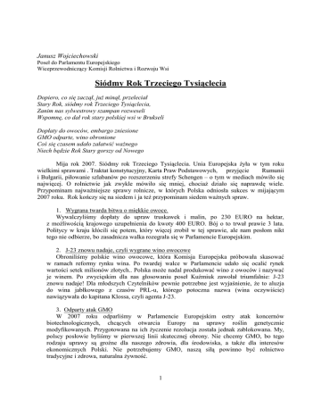 Janusz Wojciechowski Poseł do Parlamentu Europejskiego Wiceprzewodniczący Komisji Rolnictwa i Rozwoju Wsi Siódmy Rok Trzeciego Tysiąclecia Dopiero, co się zaczął, juŜ minął, przeleciał Stary Rok, siódmy rok Trzeciego Tysiąclecia, Zanim nas sylwestrowy szampan rozweseli Wspomnę, co dał rok stary polskiej wsi w Brukseli Dopłaty do owoców, embargo zniesione GMO odparte, wino obronione Coś się czasem udało załatwić waŜnego Niech będzie Rok Stary gorszy od Nowego Mija rok 2007. Siódmy rok Trzeciego Tysiąclecia. Unia Europejska Ŝyła w tym roku wielkimi sprawami . Traktat konstytucyjny, Karta Praw Podstawowych, przyjęcie Rumunii i Bułgarii, piłowanie szlabanów po rozszerzeniu strefy Schengen – o tym w mediach mówiło się najwięcej. O rolnictwie jak zwykle mówiło się mniej, chociaŜ działo się naprawdę wiele. Przypominam najwaŜniejsze sprawy rolnicze, w których Polska odniosła sukces w mijającym 2007 roku. Rok kończy się na siedem i ja teŜ przypominam siedem waŜnych spraw. 1. Wygrana twarda bitwa o miękkie owoce. Wywalczyliśmy dopłaty do upraw truskawek i malin, po 230 EURO na hektar, z moŜliwością krajowego uzupełnienia do kwoty 400 EURO. Bój o to trwał prawie 3 lata. Politycy w kraju kłócili się potem, który więcej zrobił w tej sprawie, ale nam posłom nikt tego nie odbierze, bo zasadnicza walka rozegrała się w Parlamencie Europejskim. 2. J-23 znowu nadaje, czyli wygrane wino owocowe Obroniliśmy polskie wino owocowe, która Komisja Europejska próbowała skasować w ramach reformy rynku wina. Po twardej walce w Parlamencie udało się ocalić rynek wartości setek milionów złotych.. Polska moŜe nadal produkować wino z owoców i nazywać je winem. Po zwycięskim dla nas głosowaniu poseł Kuźmiuk zawołał triumfalnie: J-23 znowu nadaje! Dla młodszych Czytelników pewnie potrzebne jest wyjaśnienie, Ŝe to aluzja do wina jabłkowego z czasów PRL-u, którego potoczna nazwa (wina oczywiście) nawiązywała do kapitana Klossa, czyli agenta J-23. 3. Odparty atak GMO W 2007 roku odparliśmy w Parlamencie Europejskim ostry atak koncernów biotechnologicznych, chcących otwarcia Europy na uprawy roślin genetycznie modyfikowanych. Przygotowana na ich Ŝyczenie rezolucja została jednak zablokowana. My, polscy posłowie byliśmy w pierwszej linii skutecznej obrony. Nie chcemy GMO, bo tego rodzaju uprawy są groźne dla naszego zdrowia, dla środowiska, a takŜe dla interesów ekonomicznych Polski. Nie potrzebujemy GMO, naszą siłą powinno być rolnictwo tradycyjne i zdrowa, naturalna Ŝywność. 1 4. Polskie mięso europejskie Ostatnie dni roku przyniosły dobrą wiadomość w postaci zniesienia (niezupełnego) rosyjskiego embarga na polskie mięso. Mam krytyczną ocenę sposobu oraz ceny tego zwycięstwa, ale fakt zniesienia embarga sam w sobie jest pozytywny. Pozytywny wynik był moŜliwy dzięki temu, Ŝe od 2 lat w Parlamencie Europejski9m prowadziliśmy systematyczny „ostrzał artyleryjski” w tej sprawie. Naszym sukcesem w Parlamencie było przeniesienie sporu polsko-rosyjskiego na forum europejskie i uczynienie problemu polskiego problemem całej Unii. 5. Trzeba chronić rolnictwo, bo Ŝywność droŜeje W ekspresowym trybie Parlament Europejski uchwalił w minionym roku bardzo waŜną rezolucję w sprawie wzrostu cen Ŝywności. śywność droŜeje, a dochody rolników nie rosną. To musi być zbadane zarówno przez Komisję Europejską jak i przez państwa członkowskie. Zbadać trzeba między innymi działalność wielkich sieci handlowych, co do których istnieje podejrzenie działania na szkodę dostawców. Rezolucja Parlamentu moŜe być przełomowa dla przyszłości Wspólnej Polityki Rolnej. Okazuje się, Ŝe prowadzona w ostatnich latach polityka wobec rolnictwa prowadzi wprost do utraty bezpieczeństwa Ŝywnościowego Europy. 6. Dobrostan zwierząt Parlament przyjął w mijającym roku Plan działania w zakresie dobrostanu zwierząt. Przewiduje on wyŜsze standardy traktowania zwierząt w hodowli, transporcie, zakładach przetwórczych, przewiduje teŜ wzmocnienie działań ochronnych wobec zwierząt domowych oraz dzikich. Ja się cieszę z przyjęcia mojej poprawki – Ŝeby europejskie normy dobrostanu zwierząt były bezwzględnie egzekwowane od wszystkich, którzy chcą eksportować swoje produkty zwierzęce na europejski rynek. Konkurencja tak, ale równa. Nie moŜe być tak, Ŝe my płacimy koszty wysokich standardów, a pozaeuropejska konkurencja jest od tego wolna. 7. Zakaz importu futer z psów i kotów Wywalczyliśmy w Parlamencie Europejskim zakaz importu do Unii wszelkich wyrobów z futer psich i kocich i bardzo się z tego cieszę. Nasza europejska cywilizacja i kultura nie dopuszcza zabijania psów i kotów na mięso czy skóry. Inni muszą tę naszą normę cywilizacyjną uszanować. Ten zakaz ma nie tylko moralne i humanitarne znaczenie. Jest to precedens wskazujący drogę do ochrony tzw. wartości niehandlowych. W handlu światowym. Nie moŜe być tak, Ŝe kto chce moŜe przywozić do Europy wszystko, co chce. Mamy prawo i obowiązek chronić nasz rynek i nasze wartości. W minionym roku wiele razy pisałem o europejskich sprawach rolniczych w minorowym nastroju. Martwiłem się, wraz z wieloma Czytelnikami, Ŝe rolnictwo w Unii Europejskiej jest lekcewaŜone i Ŝe sprawy rolnicze idą w złym kierunku. I martwię się nadal. Tych kilka załatwionych spraw daje jednak nadzieję na to, Ŝe polityczne podejście do rolnictwa zacznie się poprawiać. Pracujemy nad tym nieustannie. W sumie był rok dobry. A w kaŜdym razie nie był beznadziejny. Pozdrawiam serdecznie! JW 2