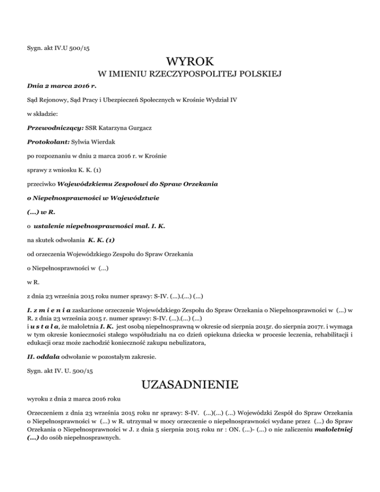 Sygn. akt IV.U 500/15 WYROK W IMIENIU RZECZYPOSPOLITEJ POLSKIEJ Dnia 2 marca 2016 r. Sąd Rejonowy, Sąd Pracy i Ubezpieczeń Społecznych w Krośnie Wydział IV w składzie: Przewodniczący: SSR Katarzyna Gurgacz Protokolant: Sylwia Wierdak po rozpoznaniu w dniu 2 marca 2016 r. w Krośnie sprawy z wniosku K. K. (1) przeciwko Wojewódzkiemu Zespołowi do Spraw Orzekania o Niepełnosprawności w Województwie (...) w R. o ustalenie niepełnosprawności mał. I. K. na skutek odwołania K. K. (1) od orzeczenia Wojewódzkiego Zespołu do Spraw Orzekania o Niepełnosprawności w (...) w R. z dnia 23 września 2015 roku numer sprawy: S-IV. (...).(...) (...) I. z m i e n i a zaskarżone orzeczenie Wojewódzkiego Zespołu do Spraw Orzekania o Niepełnosprawności w (...) w R. z dnia 23 września 2015 r. numer sprawy: S-IV. (...).(...) (...) i u s t a l a, że małoletnia I. K. jest osobą niepełnosprawną w okresie od sierpnia 2015r. do sierpnia 2017r. i wymaga w tym okresie konieczności stałego współudziału na co dzień opiekuna dziecka w procesie leczenia, rehabilitacji i edukacji oraz może zachodzić konieczność zakupu nebulizatora, II. oddala odwołanie w pozostałym zakresie. Sygn. akt IV. U. 500/15 UZASADNIENIE wyroku z dnia 2 marca 2016 roku Orzeczeniem z dnia 23 września 2015 roku nr sprawy: S-IV. (...)(...) (...) Wojewódzki Zespół do Spraw Orzekania o Niepełnosprawności w (...) w R. utrzymał w mocy orzeczenie o niepełnosprawności wydane przez (...) do Spraw Orzekania o Niepełnosprawności w J. z dnia 5 sierpnia 2015 roku nr : ON. (...)- (...) o nie zaliczeniu małoletniej (...) do osób niepełnosprawnych. W uzasadnieniu Wojewódzki Zespół podał, że stan zdrowia małoletniej I. K. nie uzasadnia zaliczenia jej do osób niepełnosprawnych. Powyższe ustalenia zostały oparte na badaniu fizykalnym oraz analizie dokumentacji medycznej i specjalistycznej. Przedmiotowe orzeczenie wnioskodawczyni K. K. (1) zaskarżyła i wniosła o zmianę zaskarżonego orzeczenia poprzez zaliczenie małoletniej I. K. do osób niepełnosprawnych. Dalej wnioskodawczyni podała, że nie zgadza się ze stanowiskiem Wojewódzkiego Zespołu w R., które uważa za krzywdzące i nie zgodne z faktycznym stanem zdrowia małoletniej I. K.. Odpowiadając na odwołanie Wojewódzki Zespół do Spraw Orzekania o Niepełnosprawności w R. podał, że utrzymał w mocy zaskarżone orzeczenie (...) co do ustalonej niepełnosprawności małoletniej I. K. po ponownej analizie całości dokumentacji zgromadzonej na użytek postępowania orzeczniczego. W wyniku przeprowadzonego postępowania Sąd Pracy i Ubezpieczeń Społecznych dokonał następujących ustaleń: Wnioskodawca K. K. (3) złożył w dniu 1 lipca 2015 roku wniosek o wydanie orzeczenia o niepełnosprawności małoletniej I. K., podając iż ustalenie niepełnosprawności jest jej niezbędne w celu ubiegania się prawo do zasiłku pielęgnacyjnego i świadczenia pielęgnacyjnego. dowód: wniosek z dnia 01.07.2015 roku (...) do Spraw Orzekania o Niepełnosprawności w J. decyzją podjętą przez skład orzekający na posiedzeniu w dniu 5 sierpnia 2015 roku nie zaliczył małoletniej I. K. do osób niepełnosprawnych. dowód : orzeczenie z dnia 05.08.2015 roku Z przedmiotowym orzeczeniem wnioskodawca K. K. (3) nie pogodził się składając odwołanie do organu II instancji, zarzucając, że orzeczenie jest krzywdzące albowiem stan zdrowia małoletniej I. K. kwalifikuje ją do zaliczenia do osób niepełnosprawnych. dowód : odwołanie z dnia 24.08.2015roku, Na posiedzeniu w dniu 23 września 2015 roku Wojewódzki Zespół w R. rozpatrzył odwołanie od orzeczenia organu I instancji i na podstawie zgromadzonej dokumentacji medycznej i specjalistycznej, badań i wywiadów utrzymał w mocy decyzję wydaną przez (...) do Spraw Orzekania o Niepełnosprawności w J. z dnia 5 sierpnia 2015 roku. Od przedmiotowego orzeczenia wnioskodawczyni złożyła odwołanie do Sądu Pracy i Ubezpieczeń Społecznych. Powołani przez Sąd biegli lekarze sądowi 1) specjalista z zakresu chorób płuc i alergologii w wydanej opinii lekarskiej z dnia 7 grudnia 2015 roku stwierdził u małoletniej I. K. alergiczny nieżyt spojówek, alergiczny nieżyt nosa, astmę oskrzelową atopową z dominacją postaci kaszlowej- zespół (...), atopowe zapalenie skóry, alergię pokarmową i wadę postawy. Zdaniem biegłego powyższe schorzenia powodują, że małoletnia I. K. jest osobą niepełnosprawną i wymaga konieczności stałego współudziału na co dzień opiekuna dziecka w procesie leczenia, rehabilitacji i edukacji, natomiast nie wymaga stałej lub długotrwałej opieki lub pomocy innej osoby w związku ze znacznie ograniczoną możliwością samodzielnej egzystencji. 2) specjalista za zakresu pediatrii w wydanej opinii lekarskiej z dnia 30 grudnia 2015 roku stwierdził u małoletniej I. K. atopowe zapalenie skóry o ciężkim przebiegu, alergiczny nieżyt nosa oraz podejrzenie astmy oskrzelowej. Zdaniem biegłego powyższe schorzenia powodują niepełnosprawność i konieczność stałego współudziału na co dzień opiekuna dziecka w procesie leczenia, rehabilitacji i edukacji, natomiast nie wymaga stałej lub długotrwałej opieki lub pomocy innej osoby w związku ze znacznie ograniczoną możliwością samodzielnej egzystencji. Powyższy stan faktyczny Sąd ustalił na podstawie akt Wojewódzkiego Zespołu w R. oraz opinii biegłych z dnia 7 grudnia 2015 roku i 30 grudnia 2015 roku. Tym dowodom Sąd dał wiarę albowiem nie zachodzą pomiędzy nimi sprzeczności, są logiczne, spójne i wzajemnie się uzupełniają. Sąd zważył co następuje: Zgodnie z art. 4a ust. 1 ustawy z dnia 27 sierpnia 1997 roku o rehabilitacji zawodowej i społecznej oraz zatrudnieniu osób niepełnosprawnych /Dz. U. Nr 123 poz.776 ze zm./ - osoby, które nie ukończyły 16 roku życia zaliczane są do osób niepełnosprawnych, jeżeli mają naruszoną sprawność fizyczną i psychiczną 