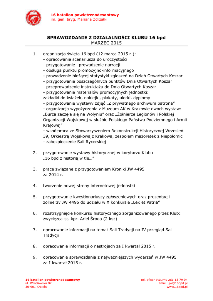 16 batalion powietrznodesantowy im. gen. bryg. Mariana Zdrzałki SPRAWOZDANIE Z DZIAŁALNOŚCI KLUBU 16 bpd MARZEC 2015 1. organizacja święta 16 bpd (12 marca 2015 r.): - opracowanie scenariusza do uroczystości - przygotowanie i prowadzenie narracji - obsługa punktu promocyjno-informacyjnego - prowadzenie bieżącej statystyki zgłoszeń na Dzień Otwartych Koszar - przygotowanie poszczególnych punktów Dnia Otwartych Koszar - przeprowadzenie instruktażu do Dnia Otwartych Koszar - przygotowanie materiałów promocyjnych jednostki: zakładki do książek, naklejki, plakaty, ulotki, dyplomy - przygotowanie wystawy zdjęć „Z prywatnego archiwum patrona” - organizacja wypożyczenia z Muzeum AK w Krakowie dwóch wystaw: „Burza zaczęła się na Wołyniu” oraz „Żołnierze Legionów i Polskiej Organizacji Wojskowej w służbie Polskiego Państwa Podziemnego i Armii Krajowej” - współpraca ze Stowarzyszeniem Rekonstrukcji Historycznej Wrzesień 39, Orkiestrą Wojskową z Krakowa, zespołem mażoretek z Niepołomic - zabezpieczenie Sali Rycerskiej 2. przygotowanie wystawy historycznej w korytarzu Klubu „16 bpd z historią w tle…” 3. prace związane z przygotowaniem Kroniki JW 4495 za 2014 r. 4. tworzenie nowej strony internetowej jednostki 5. przygotowanie kwestionariuszy zgłoszeniowych oraz prezentacji żołnierzy JW 4495 do udziału w X konkursie „Lex et Patria” 6. rozstrzygnięcie konkursu historycznego zorganizowanego przez Klub: zwycięzca-st. kpr. Ariel Środa (2 ksz) 7. opracowanie informacji na temat Sali Tradycji na IV przegląd Sal Tradycji 8. opracowanie informacji o nastrojach za I kwartał 2015 r. 9. opracowanie sprawozdania z najważniejszych wydarzeń w JW 4495 za I kwartał 2015 r. 16 batalion powietrznodesantowy ul. Wrocławska 82 30-901 Kraków tel. oficer dyżurny 261 13 79 04 email: [email protected] www.16bpd.pl 16 batalion powietrznodesantowy im. gen. bryg. Mariana Zdrzałki 10. organizacja kartek wielkanocnych oraz zaproszeń na wielkanocne rozprowadzenie 11. przygotowanie zaproszeń, scenariusza oraz narracji na uroczystość przekazania obowiązków Dowódcy 16 bpd 12. oprawa fotograficzna podczas: - uroczystości upamiętniającej żołnierzy tureckich poległych na ziemiach polskich (19 marca 2015 r., Cmentarz Rakowicki) - ślubowania Kadetów Liceum Akademickiego z Łysej Góry przy grobie Kadeta Karola Chodkiewicza (19 marca 2015 r., Cmentarz Rakowicki) - warsztatów 6 BPD z 173 IBCT (A) z USA (26 marca 2015 r.) - pozorowanego naruszenia szczelności koszar (26 marca 2015 r.) 13. przygotowanie i obsługa PKI (19 marca 2015r.) 14. przygotowanie dekoracji na potrzeby wielkanocnego rozprowadzenia (31 marca 2015 r.) 15. prowadzenie bieżącej statystyki zgłoszeń na Dzień Otwartych Koszar (22 maja 2015 r.) przedsięwzięcia stałe: 1. opracowanie kolejnych (dwóch) numerów gazetki batalionowej „Głos Jednostki” w wersji papierowej i online (10 i 23 marca 2015 r.) 2. organizacja Sali Rycerskiej na potrzeby spotkań, szkoleń, wizytacji 3. utrzymywanie kontaktów z żoną patrona - p. Anną Zdrzałką 4. przygotowanie i dystrybucja plakatów informujących o różnego rodzaju wydarzeniach kulturalnych (konkursy, przeglądy etc.) 5. aktualizacja strony internetowej 16 bpd, profilu na FB 6. aktualizacja informacji w gablocie: „Z życia batalionu” 7. obsługa poczty internetowej JW 4495 16 batalion powietrznodesantowy ul. Wrocławska 82 30-901 Kraków tel. oficer dyżurny 261 13 79 04 email: [email protected] www.16bpd.pl