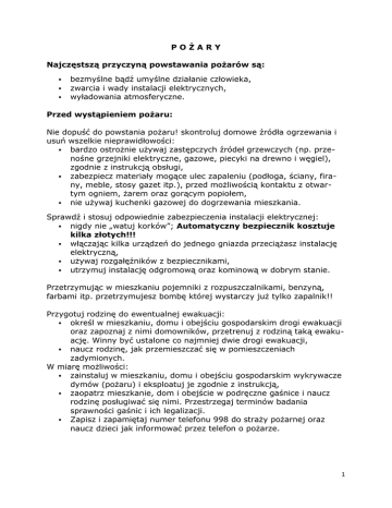 POŻARY Najczęstszą przyczyną powstawania pożarów są: bezmyślne bądź umyślne działanie człowieka, zwarcia i wady instalacji elektrycznych, wyładowania atmosferyczne. Przed wystąpieniem pożaru: Nie dopuść do powstania pożaru! skontroluj domowe źródła ogrzewania i usuń wszelkie nieprawidłowości: bardzo ostrożnie używaj zastępczych źródeł grzewczych (np. przenośne grzejniki elektryczne, gazowe, piecyki na drewno i węgiel), zgodnie z instrukcją obsługi, zabezpiecz materiały mogące ulec zapaleniu (podłoga, ściany, firany, meble, stosy gazet itp.), przed możliwością kontaktu z otwartym ogniem, żarem oraz gorącym popiołem, nie używaj kuchenki gazowej do dogrzewania mieszkania. Sprawdź i stosuj odpowiednie zabezpieczenia instalacji elektrycznej: nigdy nie „watuj korków”; Automatyczny bezpiecznik kosztuje kilka złotych!!! włączając kilka urządzeń do jednego gniazda przeciążasz instalację elektryczną, używaj rozgałęźników z bezpiecznikami, utrzymuj instalację odgromową oraz kominową w dobrym stanie. Przetrzymując w mieszkaniu pojemniki z rozpuszczalnikami, benzyną, farbami itp. przetrzymujesz bombę której wystarczy już tylko zapalnik!! Przygotuj rodzinę do ewentualnej ewakuacji: określ w mieszkaniu, domu i obejściu gospodarskim drogi ewakuacji oraz zapoznaj z nimi domowników, przetrenuj z rodziną taką ewakuację. Winny być ustalone co najmniej dwie drogi ewakuacji, naucz rodzinę, jak przemieszczać się w pomieszczeniach zadymionych. W miarę możliwości: zainstaluj w mieszkaniu, domu i obejściu gospodarskim wykrywacze dymów (pożaru) i eksploatuj je zgodnie z instrukcją, zaopatrz mieszkanie, dom i obejście w podręczne gaśnice i naucz rodzinę posługiwać się nimi. Przestrzegaj terminów badania sprawności gaśnic i ich legalizacji. Zapisz i zapamiętaj numer telefonu 998 do straży pożarnej oraz naucz dzieci jak informować przez telefon o pożarze. 1 W razie pożaru Jeśli zauważyłeś pożar to: Masz obowiązek prawny i moralny powiadomić o tym osoby zagrożone, straż pożarną lub inne służby ratownicze. Użyj prostych sposobów by ugasić pożar w zarodku - gaśnica, woda, koc gaśniczy: jeśli ubranie pali się na Tobie - zatrzymaj się, połóż na ziemi i obracaj do chwili zduszenia ognia, ucieczka spowoduje tylko zwiększenie płomienia, jeśli pali się tłuszcz w naczyniu kuchennym - ugaś go solą kuchenną lub po prostu nakryj szczelną pokrywką. Nie gaś urządzeń elektrycznych wodą - mogą być pod napięciem, postaraj się odłączyć zasilanie elektryczne. Nie próbuj gasić ognia, którego nie jesteś w stanie opanować, wyprowadź wszystkie osoby zagrożone w bezpieczne miejsce i w razie potrzeby udziel pierwszej pomocy. Gdyby pożar i swąd dymu obudził Cię ze snu - zbadaj, czy drzwi są ciepłe, jeżeli tak to nie otwieraj ich lecz użyj innych dróg by opuścić pomieszczenie (np. przez okno, o ile jest to możliwe) lub usilnie wzywaj pomocy, wymachując przez okno białym obrusem, prześcieradłem jeśli musisz wyjść przez pomieszczenia zadymione to zakryj usta i nos gęstą tkaniną, okryj się czymś trudnozapalnym i przemieszczaj tuż przy podłodze - dym i gorące powietrze unosi się do góry, a dołem powietrze jest bardziej czyste i chłodne. Bądź przygotowany! Dym drażni oczy. Opuszczając mieszkanie zabierz ze sobą wszystkich domowników - dzieci potrafią chować się przed ogniem w miejscach, z których ich nie widać: w szafie, pod łóżkiem, pod pościelą itp. Po pożarze Jeżeli zamierzasz wejść do budynku po pożarze powinieneś: upewnić się, czy właściwe służby (władze, straż pożarna) stwierdziły, że budynek jest bezpieczny, uważać na oznaki dymu i gorąca, nie włączać instalacji elektrycznej w budynku (pomieszczeniu) po pożarze przed jej sprawdzeniem przez elektryka, jeśli został wyłączony główny wyłącznik gazu, odcinający dopływ gazu z sieci zasilającej do budynku - to w razie ponownego jego włączenia, wezwij upoważnionego pracownika technicznego administracji obiektu oraz służbę gazowniczą, zachować czujność i uwagę, gdyż po pożarze elementy konstrukcyjne budynku (zabudowań) mogą być osłabione (np. dachy i stropy) i mogą wymagać naprawy. 2 Jeśli fachowcy (inspektor budowlany) stwierdzą, że budynek po pożarze jest niebezpieczny, należy opuścić dom: o konieczności opuszczenia domu powiadom policję, aby wzięła go i pozostawione mienie pod ochronę, zabierz ze sobą dowód tożsamości i inne ważne dokumenty, niezbędne i cenne przedmioty (okulary, lekarstwa, polisy ubezpieczeniowe, pieniądze, biżuterię). Skontaktuj się z firmą ubezpieczeniową w przypadku, gdy twoje mieszkanie, twój dom, zabudowania gospodarcze i pozostałe mienie ubezpieczyłeś od pożaru. Wyrzuć produkty żywnościowe, napoje i lekarstwa, które były narażone na działanie wysokiej temperatury, dymu i płomieni. Dotyczy to również zawartości lodówki i zamrażarki. Nie wolno też ponownie zamrażać rozmrożonej żywności. Jeśli sejf lub metalowa skrzynia uległy oddziaływaniu pożaru, nie próbuj ich otwierać. W ich wnętrzu przez długi czas (wiele godzin) może utrzymywać się wysoka temperatura. Jeśli otworzysz drzwi sejfu lub skrzyni przed wychłodzeniem, powietrze z zewnątrz w połączeniu z wysoką temperaturą wnętrza sejfu (skrzyni) może spowodować zapalenie się zawartości. 3
