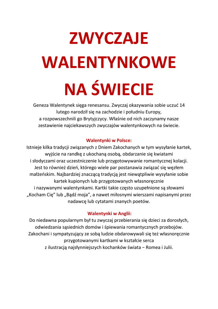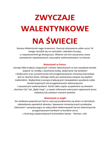 ZWYCZAJE WALENTYNKOWE NA ŚWIECIE Geneza Walentynek sięga renesansu. Zwyczaj okazywania sobie uczuć 14 lutego narodził się na zachodzie i południu Europy, a rozpowszechnili go Brytyjczycy. Właśnie od nich zaczynamy nasze zestawienie najciekawszych zwyczajów walentynkowych na świecie. Walentynki w Polsce: Istnieje kilka tradycji związanych z Dniem Zakochanych w tym wysyłanie kartek, wyjście na randkę z ukochaną osobą, obdarzanie się kwiatami i słodyczami oraz uczestniczenie lub przygotowywanie romantycznej kolacji. Jest to również dzień, którego wiele par postanawia związać się węzłem małżeńskim. Najbardziej znaczącą tradycją jest niewątpliwie wysyłanie sobie kartek kupionych lub przygotowanych własnoręcznie i nazywanymi walentynkami. Kartki takie często uzupełnione są słowami „Kocham Cię” lub „Bądź moja”, a nawet miłosnymi wierszami napisanymi przez nadawcę lub cytatami znanych poetów. Walentynki w Anglii: Do niedawna popularnym był tu zwyczaj przebierania się dzieci za dorosłych, odwiedzania sąsiednich domów i śpiewania romantycznych przebojów. Zakochani i sympatyzujący ze sobą ludzie obdarowywali się też własnoręcznie przygotowanymi kartkami w kształcie serca z ilustracją najsłynniejszych kochanków świata − Romea i Julii. Walentynki w Stanach Zjednoczonych: Dziś Walentynki za oceanem obchodzone są bardzo hucznie i na kartkach czy liścikach miłosnych świętowanie się nie kończy. Miasta toną w czerwonych serduszkach, szkoły organizują lekcje tematyczne i zabawy dla dzieci, dorośli (także znajomi i członkowie rodziny) obdarowują się prezentami, zakochani kończą dzień romantyczną kolacją bądź maratonem filmów romantycznych. Walentynki w Czechach: Walentynki w Czechach obchodzi się dwa razy w roku, 14 lutego i 1 maja. W tych dniach oblężenie przeżywa most Karola w Pradze, będący kultowym miejscem zakochanych. Aby miłość przetrwała, trzeba zawiesić na nim kłódkę. Walentynki w Danii: Święto zakochanych ma swoich zwolenników równie w Danii. Dawniej przesyłano sobie przezroczyste bibułki, na których pod światłem można było odczytać imię bądź rozpoznać twarz ukochanego. Obecnie popularnym zwyczajem jest wysyłanie gaekkebrev, czyli dowcipnego listu, pisanego samodzielnie przez panów, często rymem i z humorem, ale bez podpisu. Dziewczyna, która odgadnie imię adoratora zostanie obdarowana dodatkowymi słodkościami na Wielkanoc. Walentynki w Chinach: Chińskie Walentynki nazywane są „nocą siedmiu” i zgodnie z naszym kalendarzem obchodzi się je w połowie sierpnia. Związana z nimi jest pewna starożytna legenda o miłości śmiertelnika i jednej z siedmiu niebiańskich sióstr. Rozzłoszczona bogini niebios ukarała zakochanych, malując spinką do włosów linie na niebie (Drogę Mleczną), która na zawsze rozdzieliła parę. W związku z tym Chinki tego dnia udają się nad rzekę i kładą na wodzie igły − jeśli nie zatoną, oznacza to, że dziewczyna gotowa jest do zamążpójścia. Walentynki w Japonii: Japoński zwyczaj walentynkowy jest nieco inny niż w pozostałych rejonach świata. Tutaj to panie obdarowują słodyczami panów i to nie tylko swoich ukochanych − podarunki wręczają również znajomym i żonatym mężczyznom. Aby odróżnić intencje prezentującej kobiety, czekoladki podzielono na „giri-choko”, czyli „dla kolegów”, „honmei-choko” − „dla ukochanego". Na szczęście miesiąc później w Japonii obchodzony jest „Biały Dzień”, w którym to panie otrzymują słodycze i podarunki od panów. Myślę, że większość zwyczajów z innych stron świata przypadła Wam do gustu i być może któryś z nich chętnie zrealizujecie! Życzę udanego świętą Świętego Walentego! Paulina Szkafarak :)