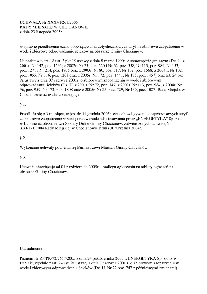UCHWAŁA Nr XXXVI/261/2005 RADY MIEJSKIEJ W CHOCIANOWIE z dnia 23 listopada 2005r. w sprawie przedłużenia czasu obowiązywania dotychczasowych taryf na zbiorowe zaopatrzenie w wodę i zbiorowe odprowadzanie ścieków na obszarze Gminy Chocianów. Na podstawie art. 18 ust. 2 pkt 15 ustawy z dnia 8 marca 1990r. o samorządzie gminnym (Dz. U. z 2001r. Nr 142, poz. 1591; z 2002r. Nr 23, poz. 220 i Nr 62, poz. 558, Nr 113, poz. 984, Nr 153, poz. 1271 i Nr 214, poz. 1806 oraz z 2003r. Nr 80, poz. 717, Nr 162, poz. 1568, z 2004 r. Nr 102, poz. 1055, Nr 116, poz. 1203 oraz z 2005r. Nr 172, poz. 1441, Nr 175, poz. 1457) oraz art. 24 pkt 9a ustawy z dnia 07 czerwca 2001r. o zbiorowym zaopatrzeniu w wodę i zbiorowym odprowadzaniu ścieków (Dz. U. z 2001r. Nr 72, poz. 747, z 2002r. Nr 113, poz. 984; z 2004r. Nr 96, poz. 959; Nr 173, poz. 1808 oraz z 2005r. Nr 85, poz. 729, Nr 130, poz. 1087) Rada Miejska w Chocianowie uchwala, co następuje : § 1. Przedłuża się o 3 miesiące, to jest do 31 grudnia 2005r. czas obowiązywania dotychczasowych taryf za zbiorowe zaopatrzenie w wodę oraz warunki ich stosowania przez „ENERGETYKA” Sp. z o.o. w Lubinie na obszarze wsi Szklary Dolne Gminy Chocianów, zatwierdzonych uchwałą Nr XXI/171/2004 Rady Miejskiej w Chocianowie z dnia 30 września 2004r. § 2. Wykonanie uchwały powierza się Burmistrzowi Miasta i Gminy Chocianów. § 3. Uchwała obowiązuje od 01 października 2005r. i podlega ogłoszeniu na tablicy ogłoszeń na obszarze Gminy Chocianów. Uzasadnienie Pismem Nr ZP/PK/72/7657/2005 z dnia 24 października 2005 r. ENERGETYKA Sp. z o.o. w Lubinie, zgodnie z art. 24 ust. 9a ustawy z dnia 7 czerwca 2001 r. o zbiorowym zaopatrzeniu w wodę i zbiorowym odprowadzaniu ścieków (Dz. U. Nr 72 poz. 747 z późniejszymi zmianami), wystąpiło do z wnioskiem o przedłużenie czasu obowiązywania dotychczasowych taryf za zbiorowe zaopatrzenie w wodę i zbiorowe odprowadzanie ścieków. Podstawowym zadaniem, jakie realizuje ENERGETYKA Sp. z o.o. w Lubinie jest uzdatnianie pobranej wody surowej i dostarczanie odbiorcom wody pitnej o jakości zgodnej z normami polskimi oraz Unii Europejskiej oraz odbiór od nich ścieków i skuteczne ich oczyszczanie. W ramach tych zadań realizowane są: - stała poprawa jakości dostarczanej wody pitnej, dzięki unowocześnianiu technologii i sposobów jej uzdatniania, - usprawnianie funkcjonowania posiadanej infrastruktury wodociągowej i kanalizacyjnej, - poszerzanie zasięgu terytorialnego obsługiwanego przez Spółkę, poprzez rozbudowę sieci wodociągowej i kanalizacyjnej na obszarze siedmiu gmin , Zbiorowe zaopatrzenie w wodę i zbiorowe odprowadzenie ścieków świadczone jest jednocześnie dla odbiorców usług zlokalizowanych na obszarze siedmiu gmin, w oparciu o takie same zasady technologiczne jak i techniczne, zgodnie z udzielonymi przez Gminy pozwoleniami. Spółka od początku, w taryfach dla wody i odprowadzania ścieków stosuje dla wyodrębnionych grup odbiorców taryfowych równe ceny we wszystkich gminach. Taryfy cen i stawek opłat za zbiorowe zaopatrzenie w wodę oraz warunki ich stosowania przez ENERGETYKĘ Sp. z o.o. w Lubinie na obszarze wsi Szklary Dolne zgodnie z Uchwałą Nr XXI/171/2004 Rady Miejskiej w Chocianowie z dnia 30 września 2004r. obowiązywały przez okres 1 roku tj. od dnia 01.10.2004r. do 30.09.2005r. Przedłużenie obowiązywania taryf o 3 miesiące tj. do 31 grudnia 2005r. umożliwi ENERGETYKA Sp. z o.o. w Lubinie wprowadzenie taryf w jednym terminie na terenie wszystkich siedmiu Gmin. Rozpatrując wniosek ENERGETYKI Sp. z o.o. w Lubinie o przedłużenie czasu obowiązywania dotychczasowych taryf za zbiorowe zaopatrzenie w wodę, złożony 27 października 2005r. w momencie, gdy taryfy przyjęte uchwałą Nr XXI/171/2004 Rady Miejskiej w Chocianowie z dnia 30 września 2004r. już nie obowiązywały, uwzględniłem bark ujemnych skutków dla komunalnych i indywidualnych odbiorców wody na terenie obszarze wsi Szklary Dolne, stopień zawinienia oraz dotychczasową działalność Spółki. W celu ustalenia szkodliwości czynu jakiego dopuściła się ENERGETYKA Sp. z o.o. w Lubinie w stosunku do stosowania taryf cen i opłat za zbiorowe zaopatrzenie w wodę na terenie Gminy Chocianów i stopnia zawinienia, w dniu 07 października 2005r. wszczęte zostało postępowanie, które zakończyło się rozprawą administracyjną w dniu 17 listopada 2005r.