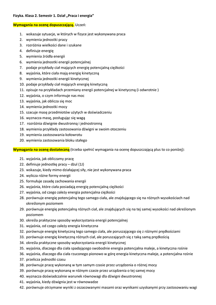 Fizyka. Klasa 2. Semestr 1. Dział „Praca i energia” Wymagania na