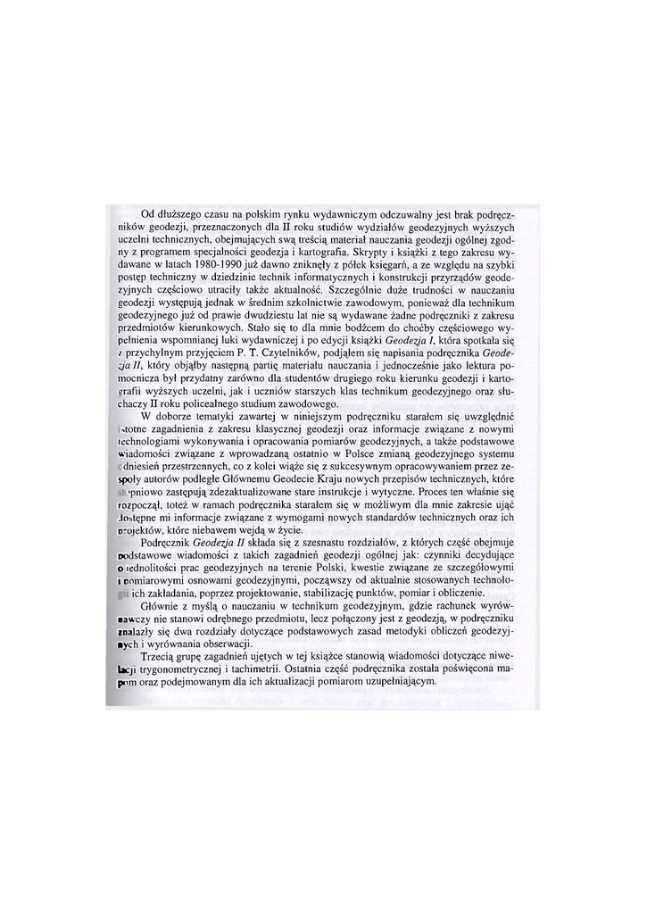 Od dłuższego czasu na polskim rynku wydawniczym odczuwalny jest brak podręczników geodezji, przeznaczonych dla II roku studiów wydziałów geodezyjnych wyższych uczelni technicznych, obejmujących swą treścią materiał nauczania geodezji ogólnej zgodny z programem specjalności geodezja i kartografia. Skrypty i książki z tego zakresu wydawane w latach 1980-1990 już dawno zniknęły z półek księgarń, a ze względu na szybki postęp techniczny w dziedzinie technik informatycznych i konstrukcji przyrządów geodezyjnych częściowo utraciły także aktualność. Szczególnie duże trudności w nauczaniu geodezji występują jednak w średnim szkolnictwie zawodowym, ponieważ dla technikum geodezyjnego już od prawie dwudziestu lat nie są wydawane żadne podręczniki z zakresu przedmiotów kierunkowych. Stało się to dla mnie bodźcem do choćby częściowego wypełnienia wspomnianej luki wydawniczej i po edycji książki Geodezja /, która spotkała się / przychylnym przyjęciem P. T. Czytelników, podjąłem się napisania podręcznika Geodezja II, który objąłby następną partię materiału nauczania i jednocześnie jako lektura pomocnicza był przydatny zarówno dla studentów drugiego roku kierunku geodezji i kartografii wyższych uczelni, jak i uczniów starszych klas technikum geodezyjnego oraz słuchaczy II roku policealnego studium zawodowego. W doborze tematyki zawartej w niniejszym podręczniku starałem się uwzględnić >totne zagadnienia z zakresu klasycznej geodezji oraz informacje związane z nowymi :jchnologiami wykonywania i opracowania pomiarów geodezyjnych, a także podstawowe wiadomości związane z wprowadzaną ostatnio w Polsce zmianą geodezyjnego systemu dniesień przestrzennych, co z kolei wiąże się z sukcesywnym opracowywaniem przez zespoły autorów podległe Głównemu Geodecie Kraju nowych przepisów technicznych, które -pniowo zastępują zdezaktualizowane stare instrukcje i wytyczne. Proces ten właśnie się rozpoczął, toteż w ramach podręcznika starałem się w możliwym dla mnie zakresie ująć .io>tępne mi informacje związane z wymogami nowych standardów technicznych oraz ich r-ojektów, które niebawem wejdą w życie. Podręcznik Geodezja II składa się z szesnastu rozdziałów, z których część obejmuje o d s t a w o w e wiadomości z takich zagadnień geodezji ogólnej jak: czynniki decydujące 0 jednolitości prac geodezyjnych na terenie Polski, kwestie związane ze szczegółowymi 1 pomiarowymi osnowami geodezyjnymi, począwszy od aktualnie stosowanych technoloich zakładania, poprzez projektowanie, stabilizację punktów, pomiar i obliczenie. Głównie z myślą o nauczaniu w technikum geodezyjnym, gdzie rachunek wyrównawczy nie stanowi odrębnego przedmiotu, lecz połączony jest z geodezją, w podręczniku znalazły się dwa rozdziały dotyczące podstawowych zasad metodyki obliczeń geodezyj•ych i wyrównania obserwacji. Trzecią grupę zagadnień ujętych w tej książce stanowią wiadomości dotyczące niwelacji trygonometrycznej i tachimetrii. Ostatnia część podręcznika została poświęcona mapom oraz podejmowanym dla ich aktualizacji pomiarom uzupełniającym. Autorem podrozdziału 2.7. pt. Zastosowanie sieci modularnych do zakładania osnów pomiarowych jest dr inż. Tadeusz Gargula, mój Kolega z Katedry Geodezji A.R. w Krakowie, zaś podrozdziału 15.10, dotyczącego programu komputerowego „Mapa Kontekstowa - MK2000", przeznaczonego do sporządzenia mapy numerycznej, jest jego twórca i zarazem także pracownik naszej Katedry - mgr inż. Mariusz Zygmunt. Obydwu Kolegom za istotne wzbogacenie treści niniejszej książki składam tą drogą wyrazy mojej wdzięczności. Pragnę również w tym miejscu złożyć najserdeczniejsze podziękowania Panom Profesorom z Akademii Górniczo-Hutniczej w Krakowie: p. prof. Józefowi Beluchowi oraz p. prof. Jackowi Szewczykowi za życzliwą ocenę, cenne korekty i wskazówki dotyczące udoskonalenia wiadomości zawartych w tego podręcznika. Szanownych Czytelników zapraszam również do odwiedzania mojej strony internetowej : http://www.ar.krakow.pl/~aiaqielski/, gdzie będę się starał umieszczać przydatne informacje i pliki do pobrania dla osób studiujących geodezję. Andrzej Jagielski Uwagi do wydania II Po czterech latach, które upłynęły od ukazania się pierwszego wydania książki Geodezja II zaszła potrzeba wprowadzenia pewnych zmian i uzupełnień treści, wynikających przede wszystkim z postępu technicznego, przejawiającego się głównie poprzez modernizację przyrządów do pomiarów bezpośrednich, rozbudowy systemów informatycznych i technik pozycjonowania satelitarnego. Porównane obydwu wydań wskazuje na znaczne poszerzenie treści rozdziałów związanych z głównymi nurtami rozwojowymi współczesnej geodezji, dotyczącymi unowocześnienia instrumentów typu total station, niwelatorów kodowych, pomiarów GPS oraz systemów informacji przestrzennej. Sporo miejsca poświęcono opartej na platformie Bentley MicroStation nakładce geodezyjnej MK 2005, będącej niezwykle przyjaznym dla geodety-praktyka narzędziem, przeznaczonym w głównej mierze do tworzenia map numerycznych. Za nieodpłatne udostępnienie na moją prośbę pełnej wersji tego programu składam podziękowanie kierownictwu firmy GeoDeZy z Krakowa, a szczególnie pani mgr inż. Agnieszce Tkocz za wnikliwą korektę rozdziału 16 i napisanie ust. 16.2.8. Niestety prośba o współpracę, dotycząca omawianego dość obszernie w I wydaniu programu G EON ET®, adresowana do dystrybutora rzeszowskiej firmy AlgoRes-soft, nie doczekała się odpowiedzi, stąd w wydaniu II niniejszej książki brak informacji o aktualnej wersji tego programu. Dla zainteresowanych P.T. Czytelników są one łatwo dostępne na rozbudowanej stronie internetowej wspomnianej firmy. Andrzej Kraków; październik 2007 r. Jagielski Spis treści 3 SPIS TREŚCI: Przedmowa 9 Rozdział 1: Podst