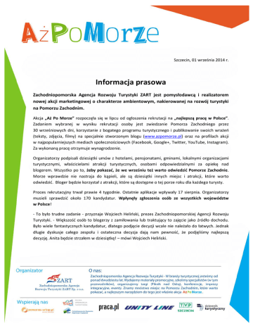 Szczecin, 01 września 2014 r. Informacja prasowa Zachodniopomorska Agencja Rozwoju Turystyki ZART jest pomysłodawcą i realizatorem nowej akcji marketingowej o charakterze ambientowym, nakierowanej na rozwój turystyki na Pomorzu Zachodnim. Akcja „Aż Po Morze” rozpoczęła się w lipcu od ogłoszenia rekrutacji na „najlepszą pracę w Polsce”. Zadaniem wybranej w wyniku rekrutacji osoby jest zwiedzanie Pomorza Zachodniego przez 30 wrześniowych dni, korzystanie z bogatego programu turystycznego i publikowanie swoich wrażeń (teksty, zdjęcia, filmy) na specjalnie stworzonym blogu (www.azpomorze.pl) oraz na profilach akcji w najpopularniejszych mediach społecznościowych (Facebook, Google+, Twitter, YouTube, Instagram). Za wykonaną pracę otrzymuje wynagrodzenie. Organizatorzy podpisali dziesiątki umów z hotelami, pensjonatami, gminami, lokalnymi organizacjami turystycznymi, właścicielami atrakcji turystycznych, osobami odpowiedzialnymi za opiekę nad blogerem. Wszystko po to, żeby pokazać, że we wrześniu też warto odwiedzić Pomorze Zachodnie. Morze wprawdzie nie nastraja do kąpieli, ale są dziesiątki innych miejsc i atrakcji, które warto odwiedzić. Bloger będzie korzystał z atrakcji, które są dostępne o tej porze roku dla każdego turysty. Proces rekrutacyjny trwał prawie 4 tygodnie. Ostatnie aplikacje wpływały 17 sierpnia. Organizatorzy musieli sprawdzić około 170 kandydatur. Wpłynęły zgłoszenia osób ze wszystkich województw w Polsce! - To było trudne zadanie - przyznaje Wojciech Heliński, prezes Zachodniopomorskiej Agencji Rozwoju Turystyki. - Większość osób to blogerzy z zamiłowania lub traktujący to zajęcie jako źródło dochodu. Było wiele fantastycznych kandydatur, dlatego podjęcie decyzji wcale nie należało do łatwych. Jednak długie dyskusje całego zespołu i ostateczna decyzja dają nam pewność, że podjęliśmy najlepszą decyzję. Anita będzie strzałem w dziesiątkę! – mówi Wojciech Heliński. Anita Demianowicz - to osoba, która została wybrana przez rekruterów. Mieszka na stałe w Gdańsku. Prowadzi blog podróżniczy Banita – www.banita.travel.pl, współpracuje z Wirtualną Polską i magazynami poświęconymi podróżowaniu. W 2012 roku jej blog otrzymał specjalne wyróżnienie w ramach konkursu Blog Roku 2012, organizowanego przez Onet.pl W tym roku organizuje także imprezę pn. „Trampki”, czyli Spotkanie Podróżujących Kobiet. Podróżowała po Ameryce Środkowej i Północnej, Azji i Europie. - Mogę dyplomatycznie powiedzieć, że średnio znam ten region. Ale czas to zmienić - mówi Anita Demianowicz. - Nasza Polska jest piękna, ale na jej zwiedzanie po prostu brakuje mi czasu. Wybierałam bardziej egzotyczne kierunki. Znam trochę województwo pomorskie i małopolskie. Ostatnio byłam też w rowerowej podróży wzdłuż wschodniej granicy. Było pięknie. Po prostu warto poznawać Polskę i to właśnie zrobię - dodaje. Organizatorzy celowo wybrali osobę, która zwiedziła kawał świata, a nie odwiedzała wcześniej Pomorza Zachodniego. - Stawiamy sobie i naszemu regionowi bardzo wysoko poprzeczkę. Po prostu wiemy, że turystycznie jesteśmy atrakcyjnym regionem. Wymyśliliśmy tę akcję po to, żeby to udowodnić – tłumaczy Heliński. Blogerka „Aż Po Morze” ma za sobą różne przygody. Jednym z najbardziej ekstremalnych był zjazd na desce po wulkanie w Nikaragui. - Widziałam już plan, który został dla mnie przygotowany w ramach akcji „Aż Po Morze” i będą tam rzeczy, których w swoim życiu jeszcze nie próbowałam - zapewnia. Akcja rozpoczyna się 1 września w Szczecinie. Obserwować ją można m.in. na blogu www.azpomorze.pl oraz na portalach społecznościowych. Koniec akcji zaplanowany jest na 30 września, gdzie podczas konferencji zorganizowanej przy okazji Światowego Dnia Turystyki będzie okazja spotkania z Blogerką w hotelu Radisson Blu w Szczecinie, wysłuchania jej relacji z podróży i zapytania o szczegóły podczas specjalnej konferencji prasowej. Cele akcji „Aż Po Morze” - przedłużenie sezonu turystycznego na Pomorzu Zachodnim, - popularyzacja zachodniopomorskich produktów turystycznych - kreowanie pomysłów na nowe produkty turystyczne i pakiety produktowe - integracja branży turystycznej, lokalnych organizacji turystycznych i samorządów przy realizacji wspólnego celu marketingowego - wzmocnienie pozycji regionu w mediach elektronicznych Rozmowa z Anitą Demianowicz blogerką „Aż Po Morze” przed rozpoczęciem akcji: Jak możemy ciebie przedstawić? Jako blogerkę, bo prowadzenie bloga jest twoim sposobem na życie czy inaczej rozłożyłabyś akcenty? - Nie zajmuje się tylko prowadzeniem bloga. Współpracuje jako redaktor z Wirtualną Polską, piszę też teksty do podróżniczych magazynów. Nie uznaje się blogerem. Piszę. O tym co widzę, poznaję. Zwiedziłaś kawał świata, a mimo tego aplikowałaś do akcji „Aż Po Morze”, żeby w 30 dni poznać Pomorze Zachodnie. Powód? - Nasza Polska jest piękna, ale na jej zwiedzanie po prostu brakuje mi czasu. Wybierałam bardziej egzotyczne kierunki. Znam trochę województwo pomorskie i małopolskie. Ostatnio byłam też w rowerowej podróży wzdłuż wschodniej granicy. Było pięknie. Po prostu warto poznawać Polskę i to właśnie zrobię. Jakie masz oczekiwania w związku z tą akcją? - Od początku wiedziałam, że to nie będzie tylko dobra zabawa, jak reklamowaliście w mediach i ogłoszeniu o pracę. (Śmiech) Prowadzę blog i portale społecznościowe od dwóch lat i wiem, że to ciężka praca. Zabawa też będzie, więc nie mogłam odpuścić sobie takiej przygody. A jest jakaś atrakcja na tym świecie, której nie spróbowałaś? Podczas jednej z rozmów mówiłaś nam, że zjeżdżałaś na desce po wulkanie w Nikaragui. - Jest! Przesłaliście mi plan z opisem pierwszych dni, a tam jest lot paralotnią. Poza tym podróżowanie wiąże się z poznawanie