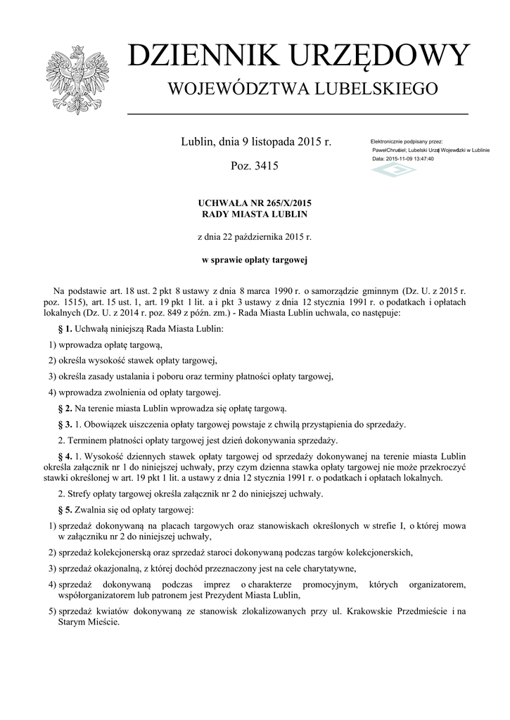 DZIENNIK URZĘDOWY WOJEWÓDZTWA LUBELSKIEGO Lublin, dnia 9 listopada 2015 r. Elektronicznie podpisany przez: Paweł Chruściel; Lubelski Urząd Wojewódzki w Lublinie Poz. 3415 Data: 2015-11-09 13:47:40 UCHWAŁA NR 265/X/2015 RADY MIASTA LUBLIN z dnia 22 października 2015 r. w sprawie opłaty targowej Na podstawie art. 18 ust. 2 pkt 8 ustawy z dnia 8 marca 1990 r. o samorządzie gminnym (Dz. U. z 2015 r. poz. 1515), art. 15 ust. 1, art. 19 pkt 1 lit. a i pkt 3 ustawy z dnia 12 stycznia 1991 r. o podatkach i opłatach lokalnych (Dz. U. z 2014 r. poz. 849 z późn. zm.) - Rada Miasta Lublin uchwala, co następuje: § 1. Uchwałą niniejszą Rada Miasta Lublin: 1) wprowadza opłatę targową, 2) określa wysokość stawek opłaty targowej, 3) określa zasady ustalania i poboru oraz terminy płatności opłaty targowej, 4) wprowadza zwolnienia od opłaty targowej. § 2. Na terenie miasta Lublin wprowadza się opłatę targową. § 3. 1. Obowiązek uiszczenia opłaty targowej powstaje z chwilą przystąpienia do sprzedaży. 2. Terminem płatności opłaty targowej jest dzień dokonywania sprzedaży. § 4. 1. Wysokość dziennych stawek opłaty targowej od sprzedaży dokonywanej na terenie miasta Lublin określa załącznik nr 1 do niniejszej uchwały, przy czym dzienna stawka opłaty targowej nie może przekroczyć stawki określonej w art. 19 pkt 1 lit. a ustawy z dnia 12 stycznia 1991 r. o podatkach i opłatach lokalnych. 2. Strefy opłaty targowej określa załącznik nr 2 do niniejszej uchwały. § 5. Zwalnia się od opłaty targowej: 1) sprzedaż dokonywaną na placach targowych oraz stanowiskach określonych w strefie I, o której mowa w załączniku nr 2 do niniejszej uchwały, 2) sprzedaż kolekcjonerską oraz sprzedaż staroci dokonywaną podczas targów kolekcjonerskich, 3) sprzedaż okazjonalną, z której dochód przeznaczony jest na cele charytatywne, 4) sprzedaż dokonywaną podczas imprez o charakterze promocyjnym, współorganizatorem lub patronem jest Prezydent Miasta Lublin, których organizatorem, 5) sprzedaż kwiatów dokonywaną ze stanowisk zlokalizowanych przy ul. Krakowskie Przedmieście i na Starym Mieście. Dziennik Urzędowy Województwa Lubelskiego –2– Poz. 3415 _______________________________________________________________________________________________________________ § 6. Z dniem wejścia w życie niniejszej uchwały traci moc uchwała nr 255/XV/2011 Rady Miasta Lublin z dnia 24 listopada 2011 r. w sprawie określenia zasad ustalania i poboru oraz terminu płatności i wysokości dziennych stawek opłaty targowej (Dz. Urz. Woj. Lubelskiego z 24 stycznia 2012 r. poz. 432, Dz. Urz. Woj. Lubelskiego z 16 lutego 2012 r. poz. 947, Dz. Urz. Woj. Lubelskiego z 28 października 2013 r. poz. 4293, Dz. Urz. Woj. Lubelskiego z 31 stycznia 2014 r. poz. 476). § 7. Wykonanie uchwały powierza się Prezydentowi Miasta Lublin. § 8. Uchwała podlega ogłoszeniu w Dzienniku Urzędowym Województwa Lubelskiego i wchodzi w życie z dniem 1 stycznia 2016 roku. z up. Przewodniczącego Rady Miasta Lublin Wiceprzewodniczący Rady Miasta Lublin Jarosław Pakuła Dziennik Urzędowy Województwa Lubelskiego –3– Poz. 3415 _______________________________________________________________________________________________________________ Załącznik nr 1 do uchwały nr 265/X/2015 Rady Miasta Lublin z dnia 22 października 2015 r. DZIENNE STAWKI OPŁATY TARGOWEJ Strefa I Strefa II Strefa III Strefa IV Strefa V 1. Sprzedaż ze stanowiska zajmującego powierzchnię do 1 m2 włącznie 5,00 zł 430,00 zł 70,00 zł 35,00 zł 20,00 zł 2. Sprzedaż ze stanowiska zajmującego powierzchnię powyżej 1 m2 do 5 m2 włącznie 10,00 zł 500,00 zł 150,00 zł 70,00 zł 35,00 zł 3. Sprzedaż ze stanowiska zajmującego powierzchnię powyżej 5 m2 do 10 m2 włącznie 15,00 zł 570,00 zł 200,00 zł 100,00 zł 45,00 zł 4. Sprzedaż ze stanowiska zajmującego powierzchnię powyżej 10 m2 do 15 m2 włącznie 25,00 zł 650,00 zł 360,00 zł 180,00 zł 70,00 zł 5,00 zł 40,00 zł 30,00 zł 20,00 zł 15,00 zł Lp. Przedmiot opłaty targowej - za każde następne rozpoczęte 5 m 2 powierzchni stanowiska – przez stanowisko należy rozumieć sprzedaż z ziemi, stolika, straganu, namiotu, przyczepy, samochodu itp., – pod pojęciem zajętej powierzchni należy rozumieć cały obszar będący do dyspozycji sprzedającego, na którym prowadzona jest sprzedaż, w tym powierzchnię zajętą na ekspozycję towaru oraz przez przedmioty pozostające na stanowisku, a także miejsce zajmowane przez samego sprzedającego, po którym się porusza dokonując sprzedaży, – powierzchnię wyraża się w m2 ustalonych jako iloczyn długości i szerokości całego stanowiska. Przy ustaleniu długości i szerokości bierze się pod uwagę najdalej wysunięty element przedmiotów należących do sprzedającego, w tym również markizy, parasole, wieszaki, wysięgniki itp. Dziennik Urzędowy Województwa Lubelskiego –4– Poz. 3415 _______________________________________________________________________________________________________________ Załącznik nr 2 do uchwały nr 265/X/2015 Rady Miasta Lublin z dnia 22 października 2015 r. STREFY OPŁATY TARGOWEJ STREFA I II MIEJSCE DOKONYWANIA SPRZEDAŻY 1) 2) 3) 4) 5) 6) 7) 8) 9) 10) 11) 12) 13) 14) 15) 16) 17) 18) plac targowy przy Al. Tysiąclecia, plac targowy przy ul. Krańcowej 106, plac targowy przy Al. Unii Lubelskiej, plac targowy przy ul. Żelazowej Woli 1, plac targowy przy ul. Braci Wieniawskich, plac targowy przy ul. Ruskiej 4-6, plac targowy na wydzielonej części działki przy ul. Ruskiej 5a, plac targowy przy ul. Pocztowej 2, plac targowy przy ul. Gospodarczej 5b, plac targowy przy ul. Wileńskiej 21, plac targowy przy ul. Ignacego Jana Paderewskiego, plac targowy przy ul. Jutrzenki 2, plac targowy przy ul. Franciszka Kleeberga 12a, plac targowy przy ul. Leona Kruczkowskiego / róg ul. Jacka Przybylskiego, plac targowy przy ul. Nałkowskich 126, plac targ