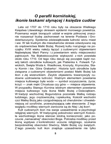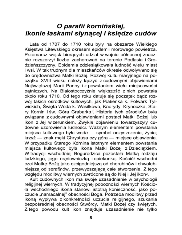 O parafii kornińskiej, ikonie łaskami słynącej i księdze cudów Lata od 1707 do 1710 roku były na obszarze Wielkiego Księstwa Litewskiego okresem epidemii morowego powietrza. Przemarsz wojsk biorących udział w wojnie północnej znacznie rozszerzył liczbę zachorowań na terenie Podlasia i Grodzieńszczyzny. Epidemia zdziesiątkowała ludność wielu miast i wsi. W tak trudnym dla mieszkańców okresie odwoływano się do orędownictwa Matki BoŜej. Rozwój kultu maryjnego na początku XVIII wieku naleŜy łączyć z cudownymi objawieniami Najświętszej Marii Panny i z powstaniem wielu miejscowości pątniczych. Na Białostocczyźnie większość z nich powstała około roku 1710. Od tego roku datuje się początek bądź rozwój takich ośrodków kultowych, jak Piatienka k. Folwark Tylwickich, Święta Woda k. Wasilkowa, Knorydy, Krynoczka, Stary Kornin i św. Góra Grabarka1. Historia tych ośrodków była związana z cudownymi objawieniami postaci Matki BoŜej lub ikon z Jej wizerunkiem. Zwykle objawieniu towarzyszyły cudowne uzdrowienia ludności. WaŜnym elementem powstania miejsca kultowego była woda — symbol oczyszczenia, Ŝycia; krzyŜ — znak męki Chrystusa czy góra — miejsce objawienia. W przypadku Starego Kornina istotnym elementem powstania miejsca kultowego była ikona Matki BoŜej z Dzieciątkiem. W tradycji wschodniej Bogurodzica pozostała Matką rodzaju ludzkiego, jego orędowniczką i opiekunką. Kościół wschodni czci Matkę BoŜą jako czcigodniejszą od cherubinów i chwalebniejszą od serafinów, przewyŜszającą całe stworzenie. Z tego względu modlitwy wiernych zwrócone są do Niej i Jej ikon2. Kult cudownych ikon ma swoje uzasadnienie w psychologii religijnej wiernych. W tradycyjnej poboŜności wiernych Kościoła wschodniego ikona stanowi istotną konieczność, jako poczucie „namacalnej” obecności Boga. Potrzeba modlitwy przed ikoną wypływa z konkretności uczucia religijnego, szukania bezpośredniej obecności Stwórcy, Matki BoŜej czy świętych. Z tego powodu kult ikon znajduje uzasadnienie nie tylko 5 w treści wyobraŜanych na ikonach wydarzeniach i postaciach, lecz takŜe w wierze w ich obecność, którą Cerkiew daje poprzez poświęcone ikony. Poświęcenie ikony, według Sergiusza Bułgakowa, daje „więź między praobrazem i obrazem, między wyobraŜeniem i wyobraŜanym (...). Na mocy tej pełnej obecności łaski, poprzez ikonę moŜe być okazana pomoc, jakby przez wyobraŜonych na niej, i w tym sensie kaŜda poświęcona ikona jest ikoną cudowną. JednakŜe jako cudowna, czyli czyniąca cuda we właściwym znaczeniu tego słowa, czczone są te ikony, które przejawiły swoją cudowną moc w sposób bardzo jasny i dostępny”3. Wśród cudownych obrazów najwięcej jest ikon z wizerunkami Matki BoŜej. Zgodnie z wiarą Kościoła opiece Matki BoŜej powierzona została cała ludność. Bogurodzica objawia się światu w cudownych ikonach, jako odczuwalny ślad Jej obecności na ziemi. Charakterystyczną cechą religijności na ziemiach Korony i Wielkiego Księstwa Litewskiego w drugiej połowie XVII i pierwszej połowie XVIII wieku był rozwój kultu maryjnego. Rozwijał się on w okresie wojen, klęsk elementarnych i zagroŜeń wewnętrznych kraju. Kult cudownych obrazów łączył się głęboką religijnością społeczeństwa ostentacyjnie manifestującego swoją poboŜność. Wzrastało znaczenie miejsc pielgrzymkowych i rola sanktuariów w Ŝyciu Kościoła z cudownymi obrazami lub ikonami. Wielka popularność kultu cudownych ikon Matki BoŜej występowała w równym stopniu na ziemiach ruskich i polskich Rzeczypospolitej. Najbardziej znane słynące łaskami ikony były w ośrodkach klasztornych: śyrowicach, Poczajowie czy Częstochowie4. Obok znanych ośrodków kultowych powstawały nowe o znaczeniu lokalnym bądź regionalnym. Kult maryjny tego typu szczególnie rozwinął się w okresie konfederacji barskiej. Objął on szerokie masy społeczności ruskiej i polskiej. Kult maryjny wyraŜający się w oddawaniu czci cudownym ikonom pozostawał głównie jako kult Opiekunki, broniącej ludność od wszelkich nieszczęść. Taki właśnie charakter mają kulty typowo lokalne. Jednym z takich miejsc pątniczych była cerkiew w Starym Korninie z cudowną ikoną Matki BoŜej. Większość prawosławnych ośrodków kultowych nie posiadają własnych rejestracji doznawanych przez wiernych przed 6 ikoną cudów. Księgi cudów, tak charakterystyczne dla łacińskich i unickich miejsc kultowych, stanowią trwały pisany ślad zjawiska. Opierając się na przekazach historycznych moŜna prześledzić formy kultu jednostkowego i masowego. W kaŜdej z tych form wyraŜają się postawy religijne róŜnych środowisk wiernych. Kult indywidualny ma swoje oparcie w kulcie masowym i stanowi jego jednostkową interpretację. Księga cudów ze Starego Kornina naleŜy do wyjątkowych źródeł do dziejów postaw religijnych w Kościele wschodnim. Zanim przejdziemy do omówienia tego źródła, naleŜy przybliŜyć dzieje parafii kornińskiej do połowy XVIII wieku i przedstawić okoliczności towarzyszące pojawieniu się cudownej ikony Matki BoŜej. *** Obszar wschodniej Białostocczyzny w znacznym stopniu był zamieszkały przez ludność białoruską wyznania prawosławnego. W XVI wieku na terenie województwa podlaskiego oraz zachodniej części województwa trockiego i brzeskiego funkcjonowało ponad 146 parafii prawosławnych5. Większość z nich na początku XVIII wieku przeszła na unię. Przy prawosławiu do końca istnienia Rzeczypospolitej pozostały ośrodki klasztorne w Bielsku, Drohiczynie i Zabłudowie. Los tych ośrodków został szeroko omówiony w literaturze historycznej6. Miejscowość Stary Kornin powstała przed 1570 rokiem, kiedy dworzanin królewski Ostafi Chalecki załoŜył kilka wsi na południe od rzeki Narew: Witułtowo (dziś Witowo), Stok (Istok), Koryciska (Korycisk), Mochnate, Morze, Be