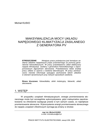 Michał KUSIO MAKSYMALIZACJA MOCY UKŁADU NAPĘDOWEGO KLIMATYZACJI ZASILANEGO Z GENERATORA PV STRESZCZENIE Niniejsza praca poświęcona jest tematyce zasilania układów napędowych prądu przemiennego za pomocą generatorów fotowoltaicznych. W pracy przedstawiono układ elektryczny napędu klimatyzacji zasilany z generatora fotowoltaicznego z zaproponowanym algorytmem sterowania. Przedstawiono takŜe analizę pracy układu w oparciu o badania laboratoryjne. W pracy zamieszczono równieŜ informacje opisujące zachowanie takich układów w stanach dynamicznych przy róŜnych sposobach zasilania. Słowa kluczowe: fotowoltaika, silnik indukcyjny, falownik, układ sterowania. 1. WSTĘP W przypadku urządzeń klimatyzacyjnych, energia promieniowania słonecznego moŜe być szczególnie wykorzystywana, gdyŜ maksymalne zapotrzebowanie na chłodzenie występuje prawie w tym samym czasie, co największe promieniowanie słoneczne. Wykorzystanie energii promieniowania słonecznego do napędu urządzeń chłodniczych wymaga jej zmiany w drodze: mgr inŜ. Michał KUSIO e-mail: [email protected] PRACE INSTYTUTU ELEKTROTECHNIKI, zeszyt 236, 2008 M. Kusio 76 • • konwersji fotowoltaicznej (ogniwa fotowoltaiczne) – gdzie energia promieniowania słonecznego jest zamieniana za pośrednictwem falowników w energię elektryczną, którą uŜywamy do napędu spręŜarek chłodniczych, konwersji fototermicznej (kolektory słoneczne) – gdzie energia promieniowania słonecznego podgrzewa nośnik ciepła w kolektorze słonecznym a uzyskane w ten sposób ciepło moŜe być wykorzystane do zasilania termochemicznych urządzeń do schładzania i osuszania powietrza w klimatyzacji. 2. OPTYMALIZACJA MOCY W FOTOWOLTAICZNYCH SYSTEMACH NAPĘDOWYCH Głównym celem maksymalizacji jest zapewnienie pracy generatora w punkcie mocy maksymalnej (Maximum Power Point - MPP). Jedynie w systemach bardzo małych mocy moŜna zrezygnować z maksymalizacji mocy, gdyŜ dodatkowe koszty, związane z rozbudową układu, niekoniecznie mogą zwiększyć pozyskanie energii. Jeden ze sposobów praktycznej realizacji maksymalizacji mocy systemu opiera się na zastosowaniu w zaleŜności od bezpośredniego obciąŜenia układu dopasowującego, którym moŜe być falownik lub przerywacz prądu stałego, umieszczony przed odbiornikiem energii elektrycznej. Innym sposobem maksymalizacji mocy generatora fotowoltaicznego jest zastosowanie zestawów solarnych ze specjalnymi ruchomymi czaszami, które za pośrednictwem niewielkich silniczków naprowadzających automatycznie kierują powierzchnie modułów w optymalnym kierunku wobec słońca. Prostsze układy oparte są na analizie trajektorii słońca na nieboskłonie, co jest kalkulowane na podstawie daty, godziny i połoŜenia geograficznego miejsca, w jakim się znajduje uŜytkownik. Zestawy bardziej zaawansowane posiadają dodatkowe układy odpowiednio zamocowanych czujników i są sterowane za pośrednictwem specjalistycznych programów komputerowych. W chwilach zachmurzenia panele kierowane są w to miejsce nieba gdzie intensywność promieni słonecznych jest najbardziej korzystna. Niektóre programy sterujące analizują równieŜ opłacalność ekonomiczną przekierowywania modułu w danej chwili uwzględniając zuŜycie energii przez silniki lub siłowniki naprowadzające [5]. Maksymalizacja mocy układu napędowego klimatyzacji … 77 2.1. Optymalizacja prędkości obrotowej w zaleŜności od mocy promieniowania słonecznego Jednym z takich układów jest układ z optymalizacją prędkości obrotowej w zaleŜności od mocy promieniowania słonecznego. Układ ten zaprojektowany powinien być tak, aby w znamionowych warunkach nasłonecznienia wartość mocy pobieranej przez silnik była dopasowana do mocy wytwarzanej przez generator. Zmniejszenie nasłonecznienia powoduje zmniejszenie mocy generatora PV, co w efekcie prowadzi do zmniejszenia prędkości silnika. W przeciwnym wypadku, kiedy układ fotowoltaiczny produkuje więcej mocy elektrycznej prędkość silnika powinna wzrosnąć, w celu oddania większej mocy do obciąŜenia [1]. W celu utrzymania optymalnej prędkości silnika, częstotliwość napięcia zasilającego naleŜy uzaleŜnić od mocy wytarzanej przez generator PV przy pomocy odpowiedniej zaleŜności optymalizującej poślizg. PoniewaŜ znana jest moc maksymalna i częstotliwość przekształtnika dla warunków znamionowych, to moŜliwe jest wyznaczenie częstotliwości optymalnej dla danych warunków pracy. Uwzględniając rodzaj obciąŜenia częstotliwość tą moŜna wyznaczyć na podstawie poniŜszych zaleŜności: Generator PV Id Przekształtnik DC/AC 3f U M P/P M n PWM Rys. 1. Schemat blokowy układu napędowego z regulacją prędkości w zaleŜności od wartości mocy promieniowa słonecznego o dla obciąŜenia stałym momentem f = Pm ⋅ fn Pmn (1) M. Kusio 78 o dla obciąŜenia liniowego: f = Pm ⋅ fn Pmn (2) o dla obciąŜenia parabolicznego f =3 Pm ⋅ fn Pmn (3) gdzie: Pmn – maksymalna znamionowa moc baterii, fn – częstotliwość znamionowa napięcia silnika, Pm – maksymalna moc baterii dla nowych warunków, f – częstotliwość napięcia silnika dla nowych warunków. 2.2. Regulacja napięciowo-częstotliwościowa Opisany w poprzednim rozdziale sposób regulacji prędkości obrotowej silnika w zaleŜności od mocy promieniowania słonecznego nie uwzględnia jednak ograniczonej dynamiki układu napędowego podczas stanów przejściowych. Problem ten moŜna rozwiązać uzaleŜniając wartość częstotliwości napięcia zasilającego układ napędowy od aktualnych parametrów wyjściowych generatora fotowoltaicznego. W tym celu moŜna zastosować pomiar mocy pobieranej z generatora fotowoltaicznego i zgodnie z zasadami sterowania napięcie – częstotliwość na tej podstawie zmieniać częstotliwość pracy falownika. Wprowadzając takie rozwiązania zapewniamy odpowiednią przeciąŜalność momentem układu napędowego w całym zakresie z