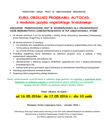 POWIATOWY URZĄD PRACY W CZĘSTOCHOWIE ORGANIZUJE KURS OBSŁUGI PROGRAMU AUTOCAD z modułem języka angielskiego branżowego SZKOLENIE PRZEZNACZONE JEST W SZCZEGÓLNOŚCI DLA UPRAWNIONYCH OSÓB BEZROBOTNYCH ZAREJESTROWANYCH W PUP CZĘSTOCHOWA, KTÓRE: 1. W okresie ostatnich 3 lat nie korzystały z żadnej formy aktywizacji zawodowej finansowanej przez Powiatowy Urząd Pracy w Częstochowie. 2. W okresie ostatnich 12 miesięcy: nie odmówiły bez uzasadnionej przyczyny przyjęcia propozycji odpowiedniej pracy lub innej formy pomocy określonej w ustawie, nie utraciły statusu z powodu niestawiennictwa w urzędzie w wyznaczonym terminie. 3. Przedłożą wypełnioną kartę kandydata na szkolenie grupowe wraz z jednym z niżej wymienionych załączników: uprawdopodobnieniem zatrudnienia lub oświadczeniem o zamiarze podjęcia działalności gospodarczej wraz z opisem planowanego przedsięwzięcia lub analizą rynku pracy pod kątem zapotrzebowania na wnioskowane kwalifikacje/umiejętności. 4. Posiadają wykształcenie minimum średnie 5. Dysponują dobrą znajomością obsługi komputera Osoby zainteresowane uczestnictwem w szkoleniu mogą zgłaszać się osobiście z wypełnioną kartą kandydata na szkolenie grupowe w wyznaczonych dniach rekrutacji na stanowisko swojego doradcy klienta, po wybraniu numeru doradcy klienta. Nabór odbywać się będzie od 16.05.2016r. do 17.05.2016 r. dla 10 osób Planowany termin rozpoczęcia kursu – czerwiec 2016 r. Informacja dotycząca zakończenia rekrutacji oraz lista osób zakwalifikowanych na szkolenie zostanie zamieszczona w siedzibie Powiatowego Urzędu Pracy w Częstochowie (na tablicy ogłoszeń na I piętrze obok pok. 117).