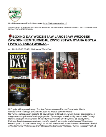 Opublikowane na Górnik Sosnowiec (http://boks.sosnowiec.pl) Strona g?ówna > BOXING DAY WODZIS?AW JAROS?AW WRZOSEK ZAWODNIKIEM TURNIEJU, ZWYCI?STWA RYANA GBYLA I PAW?A SABATOWICZA BOXING DAY WODZIS?AW JAROS?AW WRZOSEK ZAWODNIKIEM TURNIEJU, ZWYCI?STWA RYANA GBYLA I PAW?A SABATOWICZA [1] wt., 2015-12-15 20:47 | Waldemar Wodzi?ski [2] [3] [4] [5] III Edycja Mi?dzynarodowego Turnieju Bokserskiego o Puchar Prezydenta Miasta Wodzis?awia ?l?skiego ju? za nami, czas na krótkie podsumowanie ! Na Turniej zg?oszonych zosta?o 88 zawodników z 22 klubów, w tym 3 ekipy zagraniczne, z czego utworzonych zosta?o 40 pojedynków. Tym samym zosta? pobity rekord walk Turnieju który w zesz?ym roku wynosi? 34 pojedynki za? w roku 2013 wynosi? 28 pojedynków. Podczas Turnieju przeprowadzona zosta?a równie? kampania profilaktyczna ?Dopalacze kradn? ?ycie?, ?Uzale?nienia drog? do nik?d? realizowan? przez Komend? Powiatow? Policji w Wodzis?awiu ?l?skim oraz Urz?d Miasta Wodzis?awia ?l?skiego. Turniej rozpocz?? si? od wyró?nienia osób, które w przeci?gu 5 lat przyczyni?y si? do rozwoju klubu. Pami?tkowy medal otrzymali: - Prezydent Miasta Wodzis?awia ?l?skiego Pan Mieczys?awa Kieca - Cz?onek Rady Miasta Wodzis?awia ?l?skiego Pan Czes?aw Rychlik - Patryk Piechaczek ? zawodnik/Wiceprezes KSW Boxing Odra Wodzis?aw ?l?ski - Mariusz Makosz ? zawodnik/ cz?onek Zarz?du KSW Boxing Odra Wodzis?aw ?l?ski - ?ukasz Kozielski ? cz?onek KSW Boxing Odra Wodzis?aw ?l?ski - ?ucjan Wnuk ? W?a?ciciel Hotelu ?Tatra? w Zakopanem oraz Pensjonatu ?Go?ciniec Wodzis?awski? Pami?tkowe medale zosta?y równie? wr?czone go?ciom specjalnym Turnieju: - Piotr Wilczewski ? Zawodowy Mistrz ?wiata i Europy, trener - Mariusz Konieczy?ski ? Cz?onek Zarz?du grupy zawodowej TYMEX BOXING Oficjalnego otwarcia Turnieju dokona? Prezydent Miasta Wodzis?awia ?l?skiego. Zespó? naszego klubu reprezentowa?o 5 zawodników Ryan Gbyl m?odzik waga 50 kg, Patryk Ostrowski kadet 50 kg, Kamil J?druch kadet 60 kg, Pawe? Sabatowicz junior waga 69 kg oraz Jaros?aw Wrzosek senior waga 91 kg. Pierwsz? swoj? walk? w Wodzis?awskim ringu stoczy? nasz najm?odszy zawodnik ?wie?oupieczony Mistrz Polski Ryan Gbyl waga 50 kg jego przeciwnikiem by? zawodnik Górala ?ywiec aktualny wicemistrz Polski z Poznania Gabriel Biela walka w miar? wyrównana by?a tylko do po?owy pierwszej rundy, z up?ywem czasu nasz zawodnik zacz?? uzyskiwa? coraz wi?ksz? przewag? nad swoim rywalem co potwierdzi? jednog?o?ny werdykt s?dziowski na korzy?? Ryana Gbyla. https://youtu.be/kk2qyXza5OE [6] Kolejnym zawodnikiem naszego klubu który wyszed? do ringu by? Patryk Ostrowski którego przeciwnikiem by? zawodnik Górala ?ywiec Rados?aw Kami?ski, niestety od samego pocz?tku walka nie uk?ada?a si? po my?li naszego zawodnika, mimo ambitnej walki Patryk przegra? swój pojedynek jednog?o?nie na punkty wynosz?c napewno kolejne do?wiadczenie. https://youtu.be/xOSj7BhgV4A [7] Nast?pny do ringu wszed? nasz debiutant Kamil J?druch niestety Kamil wylosowa? bardzo dobrego zawodnika z Czech Tomasa Cermana zawodnik z Bohumina od samego pocz?tku narzuci? Kamilowi swój styl na który nie mia? sposobu nasz zawodnik i musia? uzna? wy?szo?? Czecha, du?o wa?niejsze w tym pojedynku od zwyci?stwa dla Kamila by?o do?wiadczenie którego z pewno?ci? naby?. https://youtu.be/G45yj89ROjY [8] Po kadetach swoje walki rozpocz?li juniorzy i ju? w trzeciej walce mogli?my zobaczy? naszego reprezentanta Paw?a Sabatowicza którego przeciwnikiem by? bardzo dobry zawodnik Bombardiera Wroc?aw Damiana Sznajdera, przez trzy rundy tej walki mo?na by?o zauwa?y? jak zawodnik z Wroc?awia nastawi? si? na mocny cios chc?c znokautowa? naszego zawodnika, Pawe? jednak pokaza? co warta jest szko?a sosnowieckiego boksu i przez pe?ne trzy rundy punktowa? rozw?cieczonego wroc?awianina wygrywaj?c walk? bardzo pewnie. https://youtu.be/ZDWV36ET1ow [9] Po czterech stoczonych pojedynkach wynik naszych walk by? remisowy dwa zwyci?stwa dwie pora?ki. Ostatnim naszym zawodnikiem który wszed? do ringu by? drugi z debiutantów w kategorii senior Jaros?aw Wrzosek waga 91 kg a jego przeciwnik to zawodnik Fight Boxing D?browa Górnicza Bart?omiej Gorol ju? po kilku pierwszych akcjach by?o wiadomo ?e nasz zawodnik nie czuje ?adnego respektu przed swoim bardziej do?wiadczonym zawodnikiem i to w?a?nie Jarek nadaje ton walce. Przez pe?ne trzy rundy nasz zawodnik mia? widoczn? przewag? i przez chwil? jego zwyci?stwo nie by?o zagro?one, po bardzo dobrej wygranej jednog?o?nie na punkty walce, nasz zawodnik zosta? uznany najlepszym zawodnikiem turnieju taki debiut to marzenie dla zawodnika... https://youtu.be/RUVXpRMCJvE [10] Poni?ej wyniki walk: M?odzik 38kg Wiktor Haza (UKS Evan Nowy S?cz) vs Iwan Kuczerenko (Bombardier Wroc?aw) 3-0 40kg Maciej Pelc (Bombardier Wroc?aw) vs Artur Skorupa (RMKS Rybnik) 0-3 43kg Daniel Trojok (TS Czarni-Góral ?ywiec) vs Szymon Skorupa (RMKS Rybnik) 1-2 48kg Gabriel Biela (TS Czarni-Góral ?ywiec) vs Ryan Gbyl (Górnik Sosnowiec) 0-3 54kg Filip Colkos (06 Kleofas Katowice) vs Antoni Brzozok (BKS Jastrz?bie) 0-3 56kg Damian ?aniecki (BKB Beskidy Bielsko-Bia?a) vs Rafa? Paszenda (RMKS Rybnik) 1-2 68kg Dariusz Mika (Jonak Team Strzelce Opolskie) vs Maksymilian Marchewka (KSW Boxing Odra Wodzis?aw) 3-0 Kobiety 52kg Natalia Dulian (UKS Evan Nowy S?cz) vs Agata Konieczny (KSW Boxing Odra Wodzis?aw) 0-3 54kg Sandra Pietroszek (BKS Jastrz?bie) vs Justyna Talarek (SKB Beskid Dragon Bielsko - Bia?a) 0-3 60kg Wioletta Czerniak (BKS Jastrz?bie) vs Maria Wójtowicz (SKB Beskid Dragon Bielsko - Bia?a) 0-3 60kg Aleksandra Piechowska (CSW Fight Boxing D?browa Górnicza) vs Weronika D?browska (BKS Jastrz?bie) 2-1 57kg Patrycja Joniec (06 Kleofas Katowice) vs Julia Koroll (Jonak Team Strzelce Opolskie) TKO3 54kg Ja?mina Zapotoczna (Bombardier Wroc?aw) vs Anna Skorupa (RMKS Rybnik) 0-3 Kadet 52kg Patryk Ostrowski (Górnik Sosnowiec) vs Rados?aw Kami?ski (TS Czarni-Góral ?ywiec) 0-3 57kg Filip Prysak (Start Cz?stochowa) vs Marcel Janicki (UKS ?l?sk Ruda ?l?sk