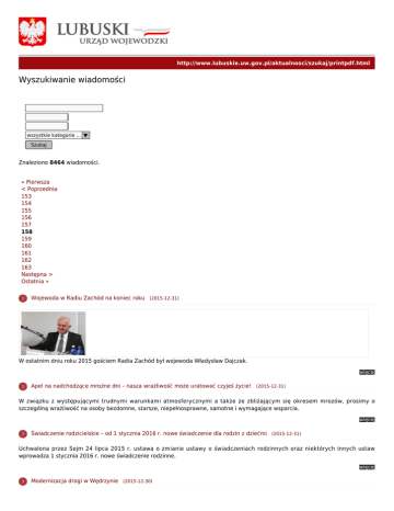 http://www.lubuskie.uw.gov.pl/aktualnosci/szukaj/printpdf.html Wyszukiwanie wiadomości wszystkie kategorie ... ▼ Szukaj Znaleziono 8464 wiadomości. « Pierwsza < Poprzednia 153 154 155 156 157 158 159 160 161 162 163 Następna > Ostatnia » Wojewoda w Radiu Zachód na koniec roku (2015-12-31) W ostatnim dniu roku 2015 gościem Radia Zachód był wojewoda Władysław Dajczak. więcej Apel na nadchodzące mroźne dni – nasza wrażliwość może uratować czyjeś życie! (2015-12-31) W związku z występującymi trudnymi warunkami atmosferycznymi a także ze zbliżającym się okresem mrozów, prosimy o szczególną wrażliwość na osoby bezdomne, starsze, niepełnosprawne, samotne i wymagające wsparcia. więcej Świadczenie rodzicielskie – od 1 stycznia 2016 r. nowe świadczenie dla rodzin z dziećmi (2015-12-31) Uchwalona przez Sejm 24 lipca 2015 r. ustawa o zmianie ustawy o świadczeniach rodzinnych oraz niektórych innych ustaw wprowadza 1 stycznia 2016 r. nowe świadczenie rodzinne. więcej Modernizacja drogi w Wędrzynie (2015-12-30) Dzięki dotacji celowej przekazanej przez wojewodę lubuskiego w Wędrzynie sfinalizowana została modernizacja fragmentu drogi wewnętrznej wykorzystywanej przez mieszkańców jako wyjazd z osiedla. więcej Realizacja programów polityki zdrowotnej przez samorządy terytorialne- nowe wzory sprawozdań (2015-12-30) Wojewoda Lubuski przypomina jednostkom samorządu terytorialnego o obowiązku przygotowywania w postaci elektronicznej (ePUAP) rocznych informacji o zrealizowanych w ubiegłym roku oraz planowanych na dany rok programach polityki zdrowotnej. więcej Spada temperatura – rośnie niebezpieczeństwo bezdomnych (2015-12-30) Przypominamy o infolinii, którą na temat możliwości pomocy osobom bezdomnym prowadzi Wydział Bezpieczeństwa i Zarządzania Kryzysowego Lubuskiego Urzędu Wojewódzkiego. więcej Dobowy raport bezpieczeństwa w Lubuskiem. Raport za 29.12.2015r. (2015-12-30) Dobowy raport Wojewódzkiego Centrum Zarządzania Kryzysowego dotyczący działalności administracji zespolonej minionej doby (za 29.12.2015r.) więcej Jakość powietrza można sprawdzić w telefonie (2015-12-30) To nowoczesne rozwiązanie przygotowane dla osób, które nie mają eksperckiej wiedzy na temat ochrony powietrza. więcej Pomoc wojewody dla poszkodowanych w Trzcińcach (2015-12-29) Urządzenia pozwalające osuszyć mieszkania zalane podczas gaszenia pożaru przekazał mieszkańcom Osiedla Trzcińce wojewoda Władysław Dajczak. więcej Andrzej Szmit wojewódzkim konsultantem ratownictwa medycznego (2015-12-29) Oficjalną nominację na stanowisko wojewódzkiego konsultanta w dziedzinie ratownictwa medycznego z rąk wojewody Władysława Dajczaka odebrał Andrzej Szmit. Nowy konsultant wojewódzki to wiele dekad doświadczenia: od prawie 30 lat kieruje wojewódzkim pogotowiem w Gorzowie, przez kilkanaście lat zajmował funkcję konsultanta wojewódzkiego, jest również współtwórcą ustawy o państwowym ratownictwie medycznym. więcej « Pierwsza < Poprzednia 153 154 155 156 157 158 159 160 161 162 163 Następna > Ostatnia »