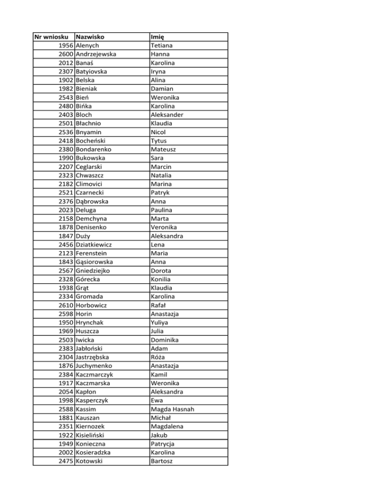Nr wniosku 1956 2600 2012 2307 1902 1982 2543 2480 2403 2501 2536 2418 2380 1990 2207 2323 2182 2521 2376 2023 2158 1878 1847 2456 2123 1843 2567 2328 1938 2334 2610 2598 1950 1969 2503 2383 2304 1876 2384 1917 2054 1998 2588 1881 2351 1922 1949 2002 2475 Nazwisko Alenych Andrzejewska Banaś Batyiovska Belska Bieniak Bień Bińka Bloch Błachnio Bnyamin Bocheński Bondarenko Bukowska Ceglarski Chwaszcz Climovici Czarnecki Dąbrowska Deluga Demchyna Denisenko Duży Dziatkiewicz Ferenstein Gąsiorowska Gniedziejko Górecka Grąt Gromada Horbowicz Horin Hrynchak Huszcza Iwicka Jabłoński Jastrzębska Juchymenko Kaczmarczyk Kaczmarska Kapłon Kasperczyk Kassim Kauszan Kiernozek Kisieliński Konieczna Kosieradzka Kotowski Imię Tetiana Hanna Karolina Iryna Alina Damian Weronika Karolina Aleksander Klaudia Nicol Tytus Mateusz Sara Marcin Natalia Marina Patryk Anna Paulina Marta Veronika Aleksandra Lena Maria Anna Dorota Konilia Klaudia Karolina Rafał Anastazja Yuliya Julia Dominika Adam Róża Anastazja Kamil Weronika Aleksandra Ewa Magda Hasnah Michał Magdalena Jakub Patrycja Karolina Bartosz 2645 2215 2062 2631 2183 1914 2382 2335 1927 2483 1931 1877 2052 2539 1879 2017 2548 2275 1939 1880 1960 2666 2021 2058 2208 2405 2546 1975 1997 2027 1957 2019 1853 2374 2014 1895 2622 2294 2589 2238 2242 2063 2406 1882 2484 2478 2493 1986 2534 1955 Król Krystosiak Krzyszowska Kubiak Kutsevych Kuźma Kwapiński Le Kim Lesik Libudzka Lipińska Litwińska Łachmańska Łuczak Maciak Maj Markowska Marszałek Martynjuk Midak Migdalska Mikołajczyk Mordovin Murza Nowak Ogonowska Olczak Opałka Paluch Parol Piegat Pierzchała Pietrak Podolak Przybylska Pyrz Rogala Rogóż Romanova Sakiewicz Sanghavi Sasińska Sierhej Simoniani Skalska Skorupiński Skrzyńska Smolak Sobiech Stadnyk Małgorzata Anastazja Paulina Jan Oksana Radosław Bartłomiej Chi Paulina Gabriela Laura Andżelika Dominika Weronika Małgorzata Katarzyna Agnieszka Weronika Katarzyna Mateusz Katia Andrea Maria Julia Aleksandra Dmytro Sebastian Alicja Magdalena Karolina Aleksandra Paulina Damian Ewa Oliwia Justyna Maja Zuzanna Jagoda Karolina Alicja Valeriia Ignacy Gloria Ewa Rafał Tamari Kamila Albert Zofia Hanna Paulina Anastasija 1962 1937 2434 2008 1901 1993 2652 1942 2298 1900 2568 1896 2050 1920 2015 2569 1952 1945 2009 1996 2628 2250 2060 2365 1940 2039 1869 2016 2439 2235 Suchecka Sudejko Sulewska Szczepański Szot Tchoń Topolska Topolska Trojanowska Tymiński Ulaski Wąsik Wdowiarz Wetoszka Wieczorkowski Wieteska Wilim Włodarczyk Wojtysiak Wolf Wróbel Wzorek Yevdokimova Zadorozhna Zapała Zarzycki Zbawiona Zdrojewska Zubek Żydowicz Katarzyna Joanna Agata Damian Olga Karolina Anastasiya Monika Julia Emil Wojciech Agata Magdalena Julia Jakub Patryk Piotr Olgierd Miriam Gabriel Aleksandra Maria Valeriya Sofia Dominika Karol Anna Eliza Piotr Tomasz