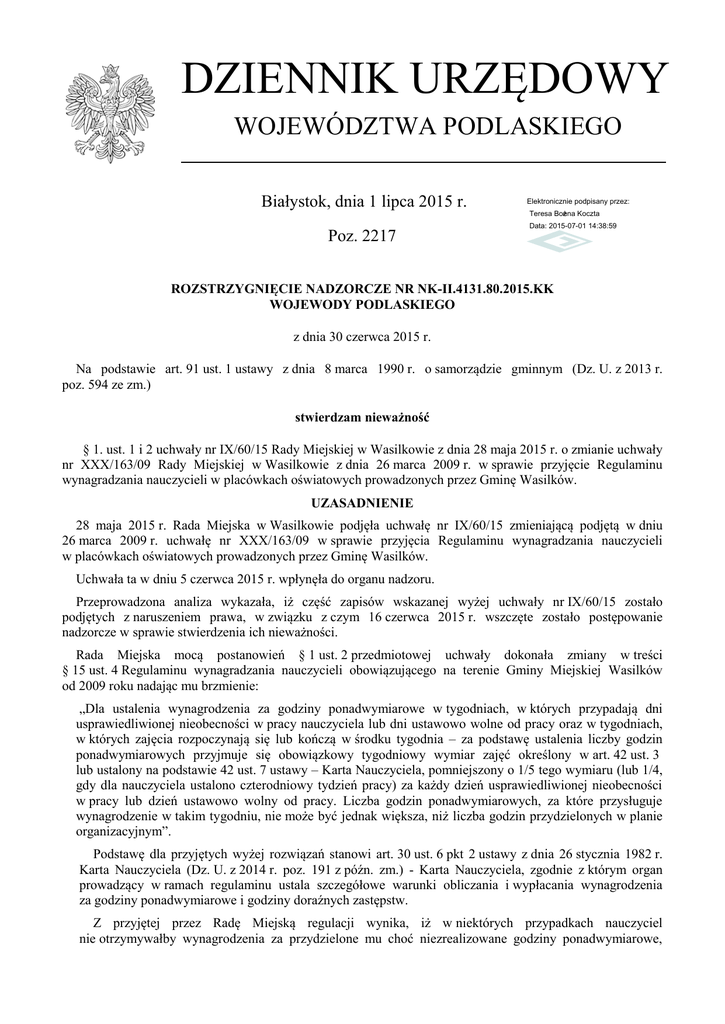 DZIENNIK URZĘDOWY WOJEWÓDZTWA PODLASKIEGO Białystok, dnia 1 lipca 2015 r. Elektronicznie podpisany przez: Teresa Bożena Koczta Poz. 2217 Data: 2015-07-01 14:38:59 ROZSTRZYGNIĘCIE NADZORCZE NR NK-II.4131.80.2015.KK WOJEWODY PODLASKIEGO z dnia 30 czerwca 2015 r. Na podstawie art. 91 ust. 1 ustawy z dnia 8 marca 1990 r. o samorządzie gminnym (Dz. U. z 2013 r. poz. 594 ze zm.) stwierdzam nieważność § 1. ust. 1 i 2 uchwały nr IX/60/15 Rady Miejskiej w Wasilkowie z dnia 28 maja 2015 r. o zmianie uchwały nr XXX/163/09 Rady Miejskiej w Wasilkowie z dnia 26 marca 2009 r. w sprawie przyjęcie Regulaminu wynagradzania nauczycieli w placówkach oświatowych prowadzonych przez Gminę Wasilków. UZASADNIENIE 28 maja 2015 r. Rada Miejska w Wasilkowie podjęła uchwałę nr IX/60/15 zmieniającą podjętą w dniu 26 marca 2009 r. uchwałę nr XXX/163/09 w sprawie przyjęcia Regulaminu wynagradzania nauczycieli w placówkach oświatowych prowadzonych przez Gminę Wasilków. Uchwała ta w dniu 5 czerwca 2015 r. wpłynęła do organu nadzoru. Przeprowadzona analiza wykazała, iż część zapisów wskazanej wyżej uchwały nr IX/60/15 zostało podjętych z naruszeniem prawa, w związku z czym 16 czerwca 2015 r. wszczęte zostało postępowanie nadzorcze w sprawie stwierdzenia ich nieważności. Rada Miejska mocą postanowień § 1 ust. 2 przedmiotowej uchwały dokonała zmiany w treści § 15 ust. 4 Regulaminu wynagradzania nauczycieli obowiązującego na terenie Gminy Miejskiej Wasilków od 2009 roku nadając mu brzmienie: „Dla ustalenia wynagrodzenia za godziny ponadwymiarowe w tygodniach, w których przypadają dni usprawiedliwionej nieobecności w pracy nauczyciela lub dni ustawowo wolne od pracy oraz w tygodniach, w których zajęcia rozpoczynają się lub kończą w środku tygodnia – za podstawę ustalenia liczby godzin ponadwymiarowych przyjmuje się obowiązkowy tygodniowy wymiar zajęć określony w art. 42 ust. 3 lub ustalony na podstawie 42 ust. 7 ustawy – Karta Nauczyciela, pomniejszony o 1/5 tego wymiaru (lub 1/4, gdy dla nauczyciela ustalono czterodniowy tydzień pracy) za każdy dzień usprawiedliwionej nieobecności w pracy lub dzień ustawowo wolny od pracy. Liczba godzin ponadwymiarowych, za które przysługuje wynagrodzenie w takim tygodniu, nie może być jednak większa, niż liczba godzin przydzielonych w planie organizacyjnym”. Podstawę dla przyjętych wyżej rozwiązań stanowi art. 30 ust. 6 pkt 2 ustawy z dnia 26 stycznia 1982 r. Karta Nauczyciela (Dz. U. z 2014 r. poz. 191 z późn. zm.) - Karta Nauczyciela, zgodnie z którym organ prowadzący w ramach regulaminu ustala szczegółowe warunki obliczania i wypłacania wynagrodzenia za godziny ponadwymiarowe i godziny doraźnych zastępstw. Z przyjętej przez Radę Miejską regulacji wynika, iż w niektórych przypadkach nauczyciel nie otrzymywałby wynagrodzenia za przydzielone mu choć niezrealizowane godziny ponadwymiarowe, Dziennik Urzędowy Województwa Podlaskiego –2– Poz. 2217 chociaż prawo do takiego wynagrodzenia wynika z przepisów prawa pracy (np. wynagrodzenie za czas urlopu wypoczynkowego, szkoleniowego, czy nieobecność spowodowana zwolnieniem lekarskim). Zgodnie z art. 9 § 2 ustawy z dnia 26 czerwca 1974 r. Kodeks pracy (Dz. U. z 2014 r. poz. 1502 z późn. zm.) postanowienia układów zbiorowych pracy i porozumień zbiorowych oraz regulaminów i statutów nie mogą być mniej korzystne dla pracowników, niż przepisy kodeksu pracy oraz innych ustaw i aktów wykonawczych. Powyższe stanowisko ma swoje odzwierciedlenie w orzecznictwie sądów administracyjnych, czego przykładem może być wyrok z dnia 27 listopada 2009 r. Wojewódzkiego Sądu Administracyjnego w Gliwicach sygn. akt IVSA/Gl 364/09, w którym Sąd wskazał m.in., iż w świetle art. 30 ust. 6 pkt 2 Karty Nauczyciela organ prowadzący nie posiada uprawnienia do określania sposobu obliczania wynagrodzenia za godziny nadliczbowe ponadwymiarowe w tygodniach, w których przypadają dni usprawiedliwionej nieobecności w pracy nauczyciela lub dni ustawowo wolne od pracy. Ponadto Sąd stwierdził, że wskazany w uchwale zmieniającej sposób obliczania wynagrodzenia za godziny ponadwymiarowe jest sprzeczny z obowiązującymi w ty zakresie rozwiązaniami ustawowymi. Doprowadza to do sytuacji, że pomimo ustawowego prawa do otrzymania wynagrodzenia za usprawiedliwioną nieobecność w pracy (np. urlop wypoczynkowy), nauczyciel nie otrzymałby takiego wynagrodzenia, przysługującego mu z mocy ustawy. Kwestia ta, jak już wskazano została unormowana zarówno w ustawie – Karta Nauczyciela, jak i w Kodeksie pracy (art. 80). Odmienna interpretacja doprowadziłaby do sytuacji, iż w niektórych tygodniach nauczyciele nie otrzymywaliby wynagrodzenia za przydzielone im i nie wykonane godziny ponadwymiarowe, mimo że prawo do takiego wynagrodzenia wynikałoby z przepisów ogólnych prawa pracy, co mogłoby być traktowane jako naruszenie art. 9 § 2 Kodeksu pracy. Rada Miejska jako organ stanowiący powinna działać tylko i wyłącznie na podstawie prawa i w jego granicach, zatem niedopuszczalne jest podejmowanie przez Radę regulacji bez wyraźnego upoważnienia ustawowego lub z jego przekroczeniem. Zdaniem organu nadzoru, organ stanowiący jednostki samorządu terytorialnego, realizując przysługującą mu kompetencję powinien ściśle uwzględniać wytyczne zawarte w upoważnieniu kompetencyjnym. Odstąpienie od tej zasady narusza związek formalny i materialny pomiędzy aktem wykonawczym a ustawą, co stanowi istotne naruszenie prawa. W doktrynie jak i w orzecznictwie ugruntował się pogląd, iż wykładnia norm o charakterze kompetencyjnym powinna być interpretowana w sposób ścisły i literalny. Jednocześnie zakazuje się dokonywania wykładni rozszerzającej przepisów kompetencyjnych oraz wyprowadzania kompetencji w drodze analogii (vide: wyrok Trybunału Konstytucyjnego z 28 czerwca 2000 r. K25/99, OTK 2000/5/141). Ponadto