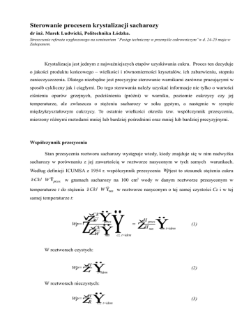 Sterowanie procesem krystalizacji sacharozy dr inż. Marek Ludwicki, Politechnika Łódzka. Streszczenie referatu wygłoszonego na seminarium “Postęp techniczny w przemyśle cukrowniczym”w d. 24-25 maja w Zakopanem. Krystalizacja jest jednym z najważniejszych etapów uzyskiwania cukru. Proces ten decyduje o jakości produktu końcowego – wielkości i równomierności kryształów, ich zabarwieniu, stopniu zanieczyszczenia. Dlatego niezbędne jest precyzyjne sterowanie warnikami zarówno pracującymi w sposób cykliczny jak i ciągłymi. Do tego sterowania należy uzyskać informacje nie tylko o wartości ciśnienia oparów grzejnych, podciśnienia (próżni) w warniku, poziomie cukrzycy czy jej temperaturze, ale zwłaszcza o stężeniu sacharozy w soku gęstym, a następnie w syropie międzykryształowym cukrzycy. Te ostatnie wielkości określa tzw. współczynnik przesycenia, mierzony różnymi metodami mniej lub bardziej pośrednimi oraz mniej lub bardziej precyzyjnymi. Współczynnik przesycenia Stan przesycenia roztworu sacharozy występuje wtedy, kiedy znajduje się w nim nadwyżka sacharozy w porównaniu z jej zawartością w roztworze nasyconym w tych samych warunkach. Według definicji ICUMSA z 1954 r. współczynnik przesycenia Wpjest to stosunek stężenia cukru ž Ck / W Ÿprzes w gramach sacharozy na 100 cm3 wody w danym roztworze przesyconym w temperaturze t do stężenia ž Ck / W Ÿnas w roztworze nasyconym o tej samej czystości Cz i w tej samej temperaturze t: Wp= ž Ÿ žŸ žCkW Ÿ Ck W przes nas = ž Ÿ H przes H nas (1) Cz, t=idem cz, t=idem W roztworach czystych: Wp= žHr Ÿ (2) t=idem W roztworach nieczystych: Wp= žHR Ÿ Cz, t=idem (3) gdzie: r – rozpuszczalność sacharozy w czystym roztworze R – rozpuszczalność sacharozy w nieczystym roztworze H – stosunek masowy ilości cukru Ck do ilości wody W w roztworze nasyconym W 1962 roku ICUMSA zaleciła, aby za pomocą wzoru (1) definiować Wp nie przy jednakowych czystościach lecz przy jednakowym stężeniu niecukrów Nc/ W . Nowa definicja jest uzasadniona teoretycznie, ponieważ w toku krystalizacji czystość maleje, a stosunek Nc/ W pozostaje stały. Dopóki jednak dostępne w literaturze tablice rozpuszczalności sacharozy wyrażają R jako funkcję Cz i t, nowa definicja jest mało praktyczna. Metody pomiaru przesycenia w warniku Metody subiektywne Ta grupa metod jest zależna od gotowacza obsługującego warnik. Może on np. obserwować pęcherze pary i bryzgi soku na szkłach wziernych warnika. Ręczna próba „na nitkę” służy do oceny lepkości i konsystencji próbki zawartości warnika. Gotowacz sam decyduje o momencie zaszczepienia waru i tylko od jego doświadczenia i umiejętności zależy efekt końcowy krystalizacji. Metody subiektywne są mało precyzyjne ale w przypadku doświadczonych gotowaczy mogą wystarczyć do poprawnego ugotowania waru. Nie nadają się do wykorzystania w nowoczesnych, zautomatyzowanych produktowniach. Ebuliometria Ebuliometria wykorzystuje określanie podwyższenia temperatury wrzenia zawartości warnika, spowodowane wzrostem stężenia sacharozy (prawo Raoulta). Zwykle mierzy się temperaturę cukrzycy w porównaniu z temperaturą wrzenia czystej wody pod tym samym ciśnieniem. Jest to dokładna metoda określania stężenia sacharozy w syropie międzykryształowym pod warunkiem uwzględnienia wpływu na temperaturę wrzenia ciśnienia hydrostatycznego słupa cieczy. Przy skomplikowanej realizacji nie pozwala na określenie ilości kryształów. Refraktometria Jest to pomiar zawartości suchej substancji przy użyciu specjalnego, wstawianego do komory warnika refraktometru. Dużą dokładność osiąga się zwłaszcza do momentu powstawania kryształów. Nie pozwala na określanie ilości kryształów i z tego względu najbardziej nadaje się do kontrolowania początkowego etapu gotowania waru. Pryzmat refraktometru jest podatny na zarastanie osadami i kryształami; zwykle jest więc wyposażony w układy czyszczące. Wiskozymetria (reometria) Lepkość roztworów sacharozy zależy od ich stężenia i temperatury. W zawiesinach kryształów (w cukrzycy, przy końcu procesu jej gotowania) pomiar właściwości reologicznych pozwala na określanie nie tylko stężenia cukru ale i ilości kryształów. Metoda jest bardziej przydatna przy dużej zawartości kryształów i znacznej lepkości (w końcowym etapie gotowania waru). Często na początku gotowania waru stosuje się więc dodatkowy pomiar refraktometryczny. Pomiary lepkości są najczęściej dokonywane skomplikowanymi mechanicznie wiskozymetrami rotacyjnymi, mierzącymi moment obrotowy napędzanego walca zanurzonego w cukrzycy (Rys. 1) lub ultradźwiękowymi, mierzącymi dekrement tłumienia drgań metalowej płytki pobudzanej cyklicznie z częstotliwością ok. 30 kHz za pomocą piezoelektryku. Znane jest też rozwiązanie mierzące prędkość ruchu umieszczonej w cukrzycy specjalnej płetwy napędzanej elektromagnetycznie. Rys. 1. Rotacyjny reometr przemysłowy (PIAP) Radiometria Jest to bardzo dokładna metoda pomiaru gęstości zawartości warnika, skorelowanej ze stężeniem sacharozy (stężeniem suchej substancji) i przesyceniem. Polega na określeniu stopnia absorpcji promieniowania γ prze warstwę cukrzycy o stałej grubości. Wadą metody jest jej wysoka cena i konieczność stosowania izotopu promieniotwórczego (ochrony radiologicznej). Przykładem radiometrycznego określania przesycenia w warniku jest metoda Bertholda. Konduktometria Wartość konduktywności czyli przewodności elektrycznej właściwej zawartości warnika jest zależna od temperatury, pH, składu niecukrów i ich stężenia. Przyjmując, że skład chemiczny niecukrów w soku gęstym nie ulega gwałtownym zmianom, a zmiany temperatury są powtarzalne i możliwe do kompensowania, można określić zależność konduktywności od stopnia zagęszczenia soku gęstego lub cukrzycy i tym samym jej korelację z przesyc