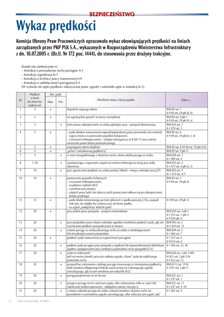 BEZPIECZE�STWO Wykaz prędkości Komisja Obrony Praw Pracowniczych opracowała wykaz obowiązujących prędkości na liniach zarządzanych przez PKP PLK S.A., wykazanych w Rozporządzeniu Ministerstwa Infrastruktury z dn. 18.07.2005 r. (Dz.U. Nr 172 poz. 1444), do stosowania przez drużyny trakcyjne. Zosta�y one zamieszczone w: Instrukcji o prowadzeniu ruchu poci�gów Ir-1 Instrukcja sygnalizacji Ie-1 Instrukcja o technice pracy manewrowej Ir-9 Instrukcja o radio��czno�ci poci�gowej Ir-5 (W wykazie nie uj�to pr�dko�ci nakazywane przez sygna�y i wska�niki uj�te w instrukcji Ie-1). Man. 1 o dojazd do stoj�cego taboru 2 3 o na sygna�pcha� powoli na tarczy rozrz�dowej 3 5 4 5 o 5 6 7 5 5 5 o o 8 510 o 9 10 o 10 10 o 11 15 o 12 20 o 13 20 o 14 20 o 15 20 16 20 o 17 20 o 18 20 o 19 20 o 20 20 o 21 20 o Lp. 12 Dot. jazdy Pr�dko�� w km/h nie mo�e by� wi�ksza ni� 3 G�os Maszynisty 4/2009 Poc. Okre�lenie miejsca lub przypadku o tymczasowe zabezpieczenie na szlaku p�kni�tej szyny przejazd obserwowany o jazda sk�adem manewrowym naprzód poprzedzona przez pracownika (nie mo�no�� zaj�cia miejsca na pierwszym poje�dzie kolejowym), z towarami niebezpiecznymi nalepka ostrzegawcza nr 8 lub 15 oraz cysterny oznaczone pasem koloru pomara�czowego rozprz�ganie taboru dr��kiem pcha� z umiarkowan� pr�dko�ci� w razie nieuzgodnionego z dy�urnym ruchu cofania sk�adu poci�gu ze szlaku wjazd poci�gu z zagrzanym czopem osi zestawu ko�owego na stacj� przy sta�ej obserwacji przy ograniczeniu pr�dko�ci na szlaku poni�ej 10km/h miejsce os�oni�te tarcz� D1 przetaczanie pojazdów kolejowych: z towarami niebezpiecznymi, wyj�tkowo ci��kimi (60 t) z przekroczon� skrajni� zaj�tych przez ludzi (nie dotyczy je�eli przetaczanie odbywa si� po zabezpieczonej drodze przebiegu) jazda sk�adu manewrowego po torze g�ównym o spadku powy�ej 2,5 a pojazd trakcyjny nie móg�by by� umieszczony od strony spadku, na sygna� podepchn�� sk�ad do górki przy je�dzie przez przejazdy przej�cia nieobsadzone o Zapis z RMI §9 ust. 7 Ir-9 §9 ust. 29 pkt 8), b) RMI §9 ust. 9 pkt 1 Ir-9 §9 ust. 29 pkt 8), a) RMI §54 ust. 3 Ir-1 §74 ust. 3 RMI §9 ust. 6 Ir-9 §9 ust. 29 pkt 6) c), d) RMI §9 ust. 8 Ir9 §9 ust. 29 pkt 6) b) RMI §9 ust. 9 pkt 2) RMI §49 ust. 3 Ir-1 §69 ust. 4 RMI §55 ust. 4 Ir-1 §75 ust. 4 pkt 2), 3) RMI §92 ust. 4 Ie1 §10 ust. 4.7) RMI §9 ust. 5 Ir-9 §9 ust. 29 pkt 4) Ir-9 §9 ust. 29 pkt 3) RMI §10 ust. 4 pkt 1 Ir-1 §13 ust. 1 pkt 1) Ir-9 §29 pkt 2) przy przeje�dzie przez miejsce os�oni�te sygna�em zwolnienia pr�dko�ci jazdy, gdy nie RMI §92 ust. 2 wyznaczono pr�dko�ci przejazdu przez to miejsce Ie-1 §10 ust. 15 cofanie poci�gu za wiedz� dy�urnego ruchu na szlaku z nieobs�ugiwanymi RMI §49 ust. 2 lub niezabezpieczonymi przejazdami Ir-1 §66 ust. 7 pr�dko�� jazdy manewrowej za wyprawionym poci�giem Ir-1 §12 ust. 6 Ir-9 §14 ust. 6 pr�dko�� jazdy poci�gów przez przejazdy z rogatkami lub niepowiadomionymi dró�nikami, Ir-1 §56 ust. 23, 46 zgodnie z post�powaniem przy zamkni�ciu posterunków ruchu (przypadek D i E) jazda na widoczno�� RMI §24 ust. 2 pkt 3 (40) je�li nie mo�na okre�li� przyczyn nadania sygna�u Alarm jazda do najbli�szego Ir1§31 ust. 2 pkt 3) b) posterunku ruchu Ir-5 §12 ust. 12 RMI §112 ust. 19 b) przejazd bez zatrzymania ci��kiego poci�gu towarowego ze zmniejszon� pr�dko�ci� Ir-1§31 ust. 2 pkt 1) obok semafora odst�powego blokady samoczynnej nie wskazuj�cego sygna�u zezwalaj�cego, gdy na tym semaforze jest wska�nik W22 poci�g przyjmowany na tor boczny RMI §31 ust. 2 Ir-1 §37 ust. 1 przyj�cie poci�gu na tor cz��ciowo zaj�ty, albo wykorzystany tylko w cz��ci lub RMI §31 ust. 11 zako�czony koz�em oporowym odst�pstwo stanowi stacyjny rj Ir-1 §37 ust. 9, 10 z miejsca odjazdu poci�gu nie wida� wskaza� semafora i dy�urny ruchu nie Ir-1 §61 ust. 4 powiadomi� o wy�wietleniu sygna�u zezwalaj�cego, albo widoczny jest sygna� stój BEZPIECZE�STWO 22 20 o 23 20 o 24 20 o 25 20 o 26 20 o 27 20 o 28 20 o 29 20 o 30 25 31 30 o 32 30 o 33 30 o 34 30 o 35 40 36 40 o 37 40 o 38 40 o 39 40 o 40 40 o 41 42 60 65 o o 43 80120 o 44 120 o 45 130 o 46 140 o 47 160 o o o wyjazd na szlak z blokad� samoczynn� na podstawie sz lub rozkazu pisemnego do czasu mini�cia przez czo�o poci�gu semafora wskazuj�cego sygna� zezwalaj�cy gdy samoczynny semafor odst�powy wskazuje sygna� stój, b�d� bia�e �wiat�o lub sygna� w�tpliwy, albo gdy semafor ten jest nieo�wietlony a z kabiny pojazdu trakcyjnego nie wida� przeszkody, na przednim odst�pie, po zatrzymaniu mo�na kontynuowa� jazd� z pr�dko�ci� do 20 km/h, tak aby w ka�dej chwili mo�na zatrzyma� poci�g w razie zauwa�enia przeszkody. Jazda z tak� pr�dko�ci� do miejsca mini�cia przez czo�o poci�gu semafora wskazuj�cego sygna� zezwalaj�cy na jazd� po zauwa�eniu podawanego w naszym kierunku sygna�u Pc6 obni�y� pr�dko�� jazdy obok stoj�cego poci�gu tak aby zatrzyma� si� w miejscu znajdowania si� maszynisty lub przeszkody uniemo�liwiaj�cej przejazd jazda do najbli�szej stacji z p�askimi miejscami lub nalepami na ko�ach zestawów RMI §68 ust. 18 Ie-1 §3 ust. 16 RMI §69 ust. 3 Ir-1 §63 ust. 10 RMI §30 ust. 2 Ir-1 §63 ust. 28 RMI §55 ust. 7 Ir-1 §75 ust. 6 polecenia ograniczenia pr�dko�ci w przypadku zauwa�enia braku zderzaka RMI §55 ust. 11 w poje�dzie trakcyjnym w poci�gu poprzedzaj�cym Ir-1 §75 ust. 11 wyjazd na tor s�siaduj�cy z torem po którym przejecha� poci�g bez sygna�u ko�ca RMI §56 ust. 3 poci�gu Ir-1 §76 ust. 2 je�eli pracownika obs�uguj�cego przejazd nie mo�na powiadomi� o odje�dzie poci�gu RMI §40 ust. 4 lub innego pojazdu kolejowego, a