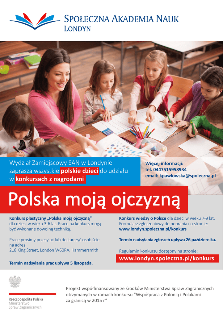 Wydział Zamiejscowy SAN w Londynie zaprasza wszystkie polskie dzieci do udziału w konkursach z nagrodami Więcej informacji: tel. 0447515958934 email: [email protected] Polska moją ojczyzną Konkurs plastyczny „Polska moją ojczyzną” dla dzieci w wieku 3-6 lat. Prace na konkurs mogą być wykonane dowolną techniką. Konkurs wiedzy o Polsce dla dzieci w wieku 7-9 lat. Formularz zgłoszeniowy do pobrania na stronie: www.londyn.spoleczna.pl/konkurs Prace prosimy przesyłać lub dostarczyć osobiście na adres: 218 King Street, London W60RA, Hammersmith Termin nadsyłania zgłoszeń upływa 26 października. Termin nadsyłania prac upływa 5 listopada. Regulamin konkursu dostępny na stronie: www.londyn.spoleczna.pl/konkurs Projekt współfinansowany ze środków Ministerstwa Spraw Zagranicznych otrzymanych w ramach konkursu "Współpraca z Polonią i Polakami za granicą w 2015 r.” Polska moją ojczyzną Wydział Zamiejscowy SAN w Londynie realizuje projekt „Kto ty jesteś? Polak mały – lekcje patriotyzmu dla najmłodszych” współfinansowany przez Ministerstwo Spraw Zagranicznych w ramach konkursu „Współpraca z Polonią i Polakami za granicą w 2015 r.”, zadanie 5.2 Utrwalanie więzi z Polską. Głównym celem projektu jest wzrost wiedzy z zakresu polskiego dziedzictwa kulturowego wśród dzieci wywodzących się ze środowiska polskiej migracji zarobkowej oraz ułatwienie im adaptacji do sytuacji powrotu do kraju i nauki w szkole w Polsce. Cel ten jest realizowany poprzez zorganizowanie weekendowych warsztatów dla dzieci, konkursu plastycznego oraz konkursu z wiedzy o Polsce. Uczestnictwo w cyklu warsztatów weekendowych pozwoli dzieciom wzbogacić wiedzę o Polsce i o polskim dziedzictwie kulturowym, kształtować i rozwijać postawy patriotyczne, a tym samym wpłynie na umacnianie poczucia przynależności narodowej dzieci polskiej emigracji zarobkowej. Dzięki uczestnictwu w działaniach realizowanych w ramach projektu wśród dzieci migrantów zostanie rozwinięta ciekawość poznawcza związana z ojczyzną i jej historią, zwyczajami, tradycją tożsamością narodową. Serdecznie zachęcamy do udziału w konkursach organizowanych w ramach projektu! www.londyn.spoleczna.pl/konkurs Projekt współfinansowany ze środków Ministerstwa Spraw Zagranicznych otrzymanych w ramach konkursu "Współpraca z Polonią i Polakami za granicą w 2015 r.”