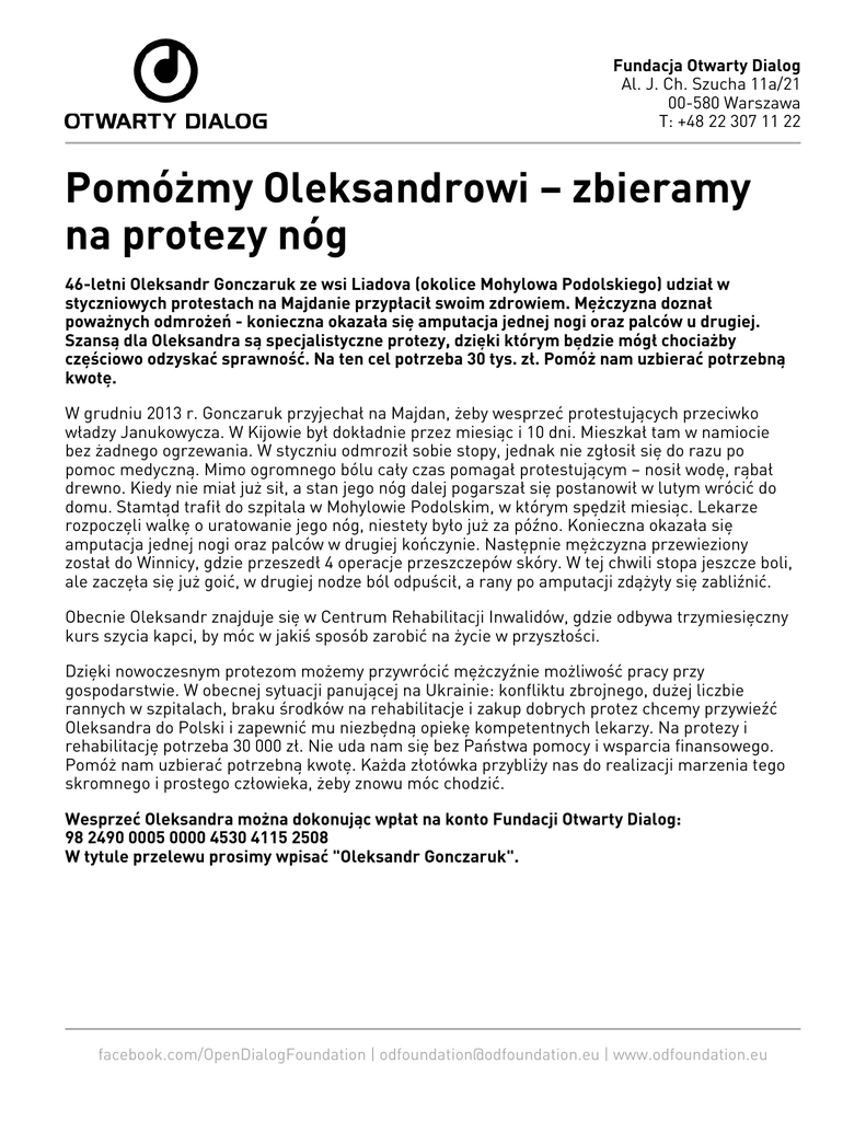 Fundacja Otwarty Dialog Al. J. Ch. Szucha 11a/21 00-580 Warszawa T: +48 22 307 11 22 Pomóżmy Oleksandrowi – zbieramy na protezy nóg 46-letni Oleksandr Gonczaruk ze wsi Liadova (okolice Mohylowa Podolskiego) udział w styczniowych protestach na Majdanie przypłacił swoim zdrowiem. Mężczyzna doznał poważnych odmrożeń - konieczna okazała się amputacja jednej nogi oraz palców u drugiej. Szansą dla Oleksandra są specjalistyczne protezy, dzięki którym będzie mógł chociażby częściowo odzyskać sprawność. Na ten cel potrzeba 30 tys. zł. Pomóż nam uzbierać potrzebną kwotę. W grudniu 2013 r. Gonczaruk przyjechał na Majdan, żeby wesprzeć protestujących przeciwko władzy Janukowycza. W Kijowie był dokładnie przez miesiąc i 10 dni. Mieszkał tam w namiocie bez żadnego ogrzewania. W styczniu odmroził sobie stopy, jednak nie zgłosił się do razu po pomoc medyczną. Mimo ogromnego bólu cały czas pomagał protestującym – nosił wodę, rąbał drewno. Kiedy nie miał już sił, a stan jego nóg dalej pogarszał się postanowił w lutym wrócić do domu. Stamtąd trafił do szpitala w Mohylowie Podolskim, w którym spędził miesiąc. Lekarze rozpoczęli walkę o uratowanie jego nóg, niestety było już za późno. Konieczna okazała się amputacja jednej nogi oraz palców w drugiej kończynie. Następnie mężczyzna przewieziony został do Winnicy, gdzie przeszedł 4 operacje przeszczepów skóry. W tej chwili stopa jeszcze boli, ale zaczęła się już goić, w drugiej nodze ból odpuścił, a rany po amputacji zdążyły się zabliźnić. Obecnie Oleksandr znajduje się w Centrum Rehabilitacji Inwalidów, gdzie odbywa trzymiesięczny kurs szycia kapci, by móc w jakiś sposób zarobić na życie w przyszłości. Dzięki nowoczesnym protezom możemy przywrócić mężczyźnie możliwość pracy przy gospodarstwie. W obecnej sytuacji panującej na Ukrainie: konfliktu zbrojnego, dużej liczbie rannych w szpitalach, braku środków na rehabilitacje i zakup dobrych protez chcemy przywieźć Oleksandra do Polski i zapewnić mu niezbędną opiekę kompetentnych lekarzy. Na protezy i rehabilitację potrzeba 30 000 zł. Nie uda nam się bez Państwa pomocy i wsparcia finansowego. Pomóż nam uzbierać potrzebną kwotę. Każda złotówka przybliży nas do realizacji marzenia tego skromnego i prostego człowieka, żeby znowu móc chodzić. Wesprzeć Oleksandra można dokonując wpłat na konto Fundacji Otwarty Dialog: 98 2490 0005 0000 4530 4115 2508 W tytule przelewu prosimy wpisać "Oleksandr Gonczaruk". facebook.com/OpenDialogFoundation | [email protected] | www.odfoundation.eu