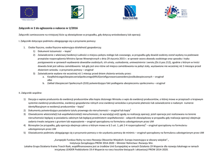 Załącznik nr 2 do ogłoszenia o naborze nr 2/2016 Załączniki zamieszczone na niniejszej liście są obowiązkowe w przypadku, gdy dotyczą wnioskodawcy lub operacji. I. Załączniki dotyczące podmiotu ubiegającego się o przyznanie pomocy: 1. Osoba fizyczna, osoba fizyczna wykonująca działalność gospodarczą: 1 1) Dokument tożsamości – kopia 2) Zaświadczenie z właściwej Ewidencji Ludności o miejscu pobytu stałego lub czasowego, w przypadku gdy dowód osobisty został wydany na podstawie przepisów rozporządzenia Ministra Spraw Wewnętrznych z dnia 29 stycznia 2015 r. w sprawie wzoru dowodu osobistego oraz sposobu i trybu postępowania w sprawach wydawania dowodów osobistych, ich utraty, uszkodzenia, unieważnienia i zwrotu (Dz.U.poz.212), zgodnie z którym w treści dowodu brak jest adresu zameldowania lub gdy jest ono różne od miejsca zameldowania na pobyt stały, wystawione nie wcześniej niż 3 miesiące przed złożeniem wniosku o przyznanie pomocy – oryginał 3) Zaświadczenie wydane nie wcześniej niż 1 miesiąc przed dniem złożenia wniosku przez: a. KasęRolniczegoUbezpieczeniaSpołecznego(KRUS)oniefigurowaniuwewidencjiosóbubezpieczonych – oryginał albo b. Zakład Ubezpieczeń Społecznych (ZUS) potwierdzające fakt podlegania ubezpieczeniu społecznemu – oryginał II. Załączniki wspólne: 1) 2) 3) 4) 5) Decyzja o wpisie producenta do ewidencji producentów albo kopia złożonego Wniosku o wpis do ewidencji producentów, o której mowa w przepisach o krajowym systemie ewidencji producentów, ewidencji gospodarstw rolnych oraz ewidencji wniosków o przyznanie płatności lub zaświadczenie o nadanym numerze 1 identyfikacyjnym w ewidencji producentów – kopia 1 Dokumenty potwierdzające posiadanie tytułu prawnego do nieruchomości – oryginał lub kopia Oświadczenie właściciela(i) lub współwłaściciela(i) nieruchomości, że wyraża(ją) on(i) zgodę na realizację operacji, jeżeli operacja jest realizowana na terenie nieruchomości będącej w posiadaniu zależnym lub będącej przedmiotem współwłasności - załącznik obowiązkowy w przypadku gdy realizacja operacji obejmuje zadania trwale związane z gruntem lub wyposażenie – oryginał sporządzony na formularzu udostępnionym przez UM 2 Biznesplan (w przypadku, gdy operacja obejmuje zakres o którym mowa w § 2 ust. 1, pkt 2-4 rozporządzenia) – oryginał sporządzony na formularzu udostępnionym przez UM Oświadczenie podmiotu ubiegającego się o przyznanie pomocy o nie uzyskaniu pomocy de minimis – oryginał sporządzony na formularzu udostępnionym przez UM „Europejski Fundusz Rolny na rzecz Rozwoju Obszarów Wiejskich: Europa inwestująca w obszary wiejskie”., Instytucja Zarządzająca PROW 2014-2020 – Minister Rolnictwa i Rozwoju Wsi. Lokalna Grupa Działania Kraina Trzech Rzek, współfinansowana jest ze środków Unii Europejskiej w ramach Działania 19 Wsparcie dla rozwoju lokalnego w ramach inicjatywy LEADER Poddziałanie 19.4 Wsparcie na rzecz kosztów bieżących i aktywizacji PROW 2014-2020. 6) 7) 8) Informacja podmiotu ubiegającego się o przyznanie pomocy o uzyskanej pomocy de minimis – oryginała sporządzony na formularzu udostępnionym przez UM, wraz z Zaświadczeniem (ami) o pomocy de minimis w rolnictwie lub rybołówstwie, jakie podmiot ubiegający się o przyznanie pomocy otrzymał w roku, w którym ubiega się o pomoc oraz w okresie 2 poprzedzających go lat - kopia Formularz informacji przedstawianych przy ubieganiu się o pomocy de minimis – oryginał 1 Pełnomocnictwo, jeżeli zostało udzielone – oryginał lub kopia III. Załączniki dotyczące robót budowlanych 1 1) Kosztorys inwestorski – oryginał lub kopia 2) Mapy lub szkice sytuacyjne oraz rysunki charakterystyczne dotyczące umiejscowienia operacji (w przypadku, gdy projekt budowlany nie jest przedkładany) – 1 oryginał lub kopia IV. Załączniki potwierdzające spełnianie lokalnych kryteriów wyboru operacji: 1. Opis zgodności z lokalnymi kryteriami wyboru operacji –formularz udostępniony przez LGD – oryginał wraz z załącznikami 1 Kopie dokumentów składanych wraz z wnioskiem mogą być potwierdzone za zgodność z oryginałem przez pracownika LGD, UM, lub podmiot, który wydał dokument, lub w formie kopii poświadczonej za zgodność z oryginałem przez notariusza. 2 Rozporządzenie Ministra Rolnictwa i Rozwoju Wsi z dnia 24 września 2015 r. w sprawie szczegółowych warunków i trybu przyznawania pomocy finansowej w ramach poddziałania „Wsparcie na wdrażanie operacji w ramach strategii rozwoju lokalnego kierowanego przez społeczność” objętego Programem Rozwoju Obszarów Wiejskich na lata 2014–2020 (Dz. U. poz. 1570 „Europejski Fundusz Rolny na rzecz Rozwoju Obszarów Wiejskich: Europa inwestująca w obszary wiejskie”., Instytucja Zarządzająca PROW 2014-2020 – Minister Rolnictwa i Rozwoju Wsi. Lokalna Grupa Działania Kraina Trzech Rzek, współfinansowana jest ze środków Unii Europejskiej w ramach Działania 19 Wsparcie dla rozwoju lokalnego w ramach inicjatywy LEADER Poddziałanie 19.4 Wsparcie na rzecz kosztów bieżących i aktywizacji PROW 2014-2020.