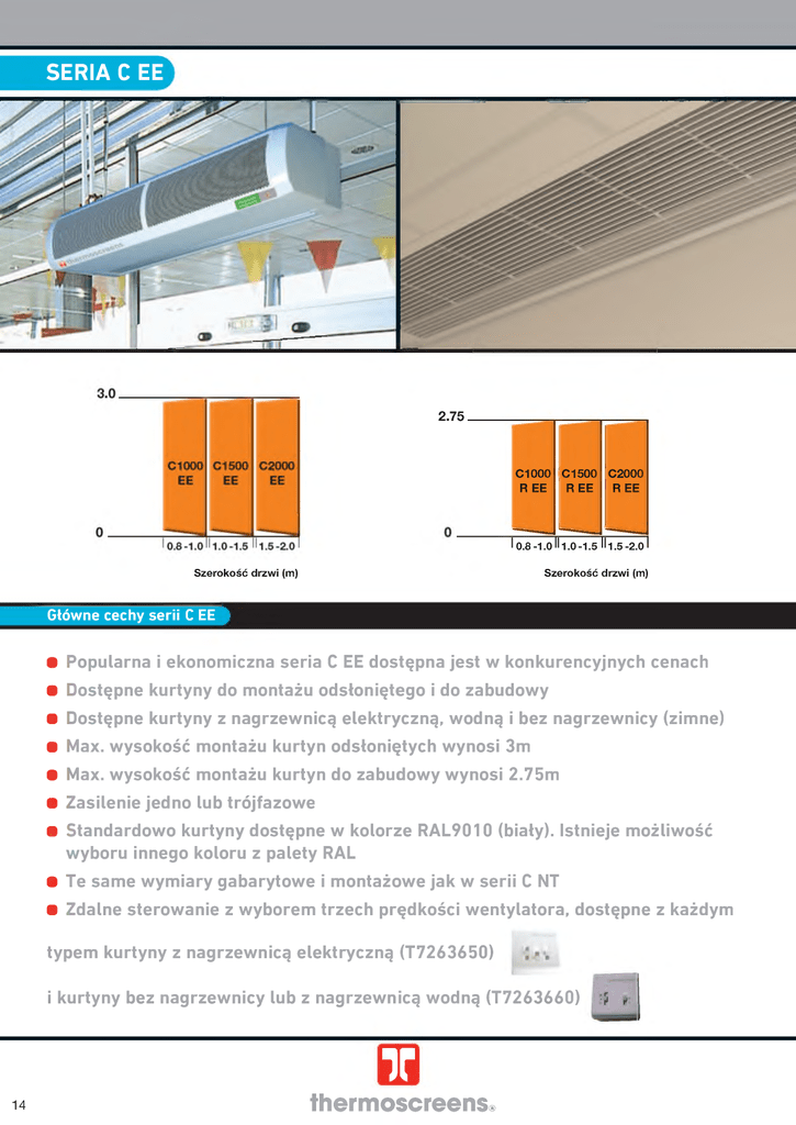 SERIA C EE 2.75 C1000 R EE C1500 R EE C2000 R EE 10.8 -1.0 11.0-1.5 h .5 -2.0 Szerokość drzwi (m) Szerokość drzwi (m) Główne cechy serii C EE • Popularna i ekonomiczna seria C EE dostępna jest w konkurencyjnych cenach • Dostępne kurtyny do montażu odsłoniętego i do zabudowy • Dostępne kurtyny z nagrzewnicą elektryczną, wodną i bez nagrzewnicy (zimne) • Max. wysokość montażu kurtyn odsłoniętych wynosi 3m • Max. wysokość montażu kurtyn do zabudowy wynosi 2.75m • Zasilenie jedno lub trójfazowe • Standardowo kurtyny dostępne w kolorze RAL9010 (biały). Istnieje możliwość wyboru innego koloru z palety RAL • Te same wymiary gabarytowe i montażowe jak w serii C NT • Zdalne sterowanie z wyborem trzech prędkości wentylatora, dostępne z każdym typem kurtyny z nagrzewnicą elektryczną (T7263650) i kurtyny bez nagrzewnicy lub z nagrzewnicą wodną (T7263660) ir 14 thermoscreens® -5 i DANE TECHNICZNE Seria C EE Modele Wymiary (mm) (dł. x gtęb. x wys.) Zasilanie (50Hz) Moc cieplna (kW) Natężenie *na fazę (A) Maks. prędkość (m/s) Maks. przepływ powietrza (m7h Masa (kg) **dB(A 55 Kurtyny zimne (bez nagrzewnicy) C1000AEE NT 1137 x 2 7 5 x 1 9 8 230V-1 - 0.7 9 1250 15 C1500AEE NT 1669 x 275 x 198 230V-1 - 0.9 9 1800 21 55 C2000A EE NT 2200 x 275 x 198 230V-1 - 1.1 9 2500 31 56 55 Kurtyny z nagrzewnicą elektryczną C1000E EE NT 1137 x 2 7 5 x 1 9 8 400V-3 4.5/9 *13.7 9 1250 16 C1500E EE NT 1669 x 275 x 198 400V-3 6/12 *18.3 9 1800 23 55 C2000E EE NT 2200 x 275 x 198 400V-3 9/18 *27.2 9 2500 33 56 55 Kurtyny z nagrzewnicą wodną C1000W EE NT 1137 x 2 7 5 x 1 9 8 230V-1 6 0.7 8.5 1180 18 C1500W EE NT 1669 x 275 x 198 230V-1 9 0.9 8.5 1700 26 55 C2000W EE NT 2200 x 275 x 198 230V-1 12 1.1 8.5 2360 37 56 Seria C EE >do zabudowy Modele Wymiary (mm) (dł. x głęb. x wys.) Wymiary kratki wraz z ramką (mm) Zasilanie (50Hz) Moc cieplna (kW) Maks. Natężenie Maks. *na fazę prędkość przepływ powietrza (m/s) (A) (m7h) Masa (kg) **dB(A) Kurtyny zimne (bez nagrzewnicy) C 1000AR EE 1200 x 347 x 205 1209x353 230V-1 - 0.7 9 1190 19 55 C 1500AR EE 1600 x 347 x 205 1609x353 230V-1 0.9 9 1730 25 55 C2000AR EE 2100 x 347 x 205 2120x353 230V-1 - 1.1 9 2380 35 56 55 Kurtyny z nagrzewnicą elektryczną C1000E9R EE 1200 x 347 x 205 1209x353 400V-3 4.5/9 *13.7 9 1190 20 C1500E12R EE 1600 x 347 x 205 1609x353 400V-3 6/12 *18.3 9 1730 27 55 C2000E18R EE 2100 x 347 x 205 2120x353 400V-3 9/18 *27.2 9 2380 37 56 55 Kurtyny z nagrzewnicą wodną C1000W6R EE 1200 x 347 x 205 1209x353 230V-1 6 0.7 8.5 1120 22 C1500W9R EE 1600 x 347 x 205 1609x353 230V-1 9 0.9 8.5 1630 30 55 C2000W12R EE 2100 x 347 x 205 2120x353 230V-1 12 1.1 8.5 2240 41 56 Kurtyna powietrzna Wymagany przepływ powietrza w podwieszonym stropie (m7h) Efektywna wentylacja powietrza w podwieszonym stropie zakończonym kratką (cm) C1000R EE 353 500 C1500R EE 421 700 C2000R EE 707 1200 **P ozio m hałasu (d B A ) p od a n o d la p oje d yncze j kurtyny, za in sta lo w a n e j n a m aks. w ys o k o ś c i d zia ła ją ce j w p om ieszcze n iu o p rze cię tn e j a kustyce (cza s p og ło su 0.7 s), ku ba turze o d p o w ia d a ją ce j 8 w ym ia n o m p o w ie trz a n a g od zin ę, w odl. 3m od u rzą dze nia. P oziom h ałasu m o że b y ć w ie lo kro tn ie w y ż s z y w p rzyp a d ku g d y w y s o k o ś ć in stala cji zo s ta ła z m n ie jszo n a , g d y p o m ie szc ze n ie je s t puste, g d y ilo ść w ym ia n p o w ie trz a je s t w ię k s z a n iż 8 w ym /h lub ko m b ina cji p ow yższych czyn nikó w . P oziom hała su ró w n ie ż s ię z w ię kszy g d y w ię ce j n iż je d n a ku rtyn a je s t z a in sta lo w a n a p rz y tym sam ym w e jściu . 15 ^ WYMIARY GABARYTOWE I MONTAŻOWE Seria C Wymiary dotyczą również serii C EE. D 100 (m in) E E 1 ii . ^ to V ł Seria C 275 C 10 0 0 C1500 C2000 A (m m ) 1137 1669 2200 B (m m ) 908 1408 1928 C (m m ) N /A 7 04 964 D (m m ) 710 1208 1728 E(m m ) N /A 604 864 F(m m) 161 170 161 do zabudowy Wymiary dotyczą również serii C EE. B C O tw ó r w s tro p ie C 10 0 0 R C 1500R C2000R A (m m ) 1129 1529 2040 B (m m ) 1179 1579 2090 C (m m ) 1209 1609 2120 D ł.(m m ) 1179 1579 2090 311 311 311 S zer.(m m ) 1.5 m -1 4 0 2 m -1 5 0 ir 18 therm oscreens OPORY PRZEPŁYWU WODY PRZEZ WYMIENNIK Opory przepływu Seria C / Seria C do zabudowy pod 82/71 °C Przepływ wody (l/s) Przepływ wody S e ria C N om inalny przepływ w ody (l/s) 82 / 71 °C Opory przepływu wymiennika (kPa) C1000W NT 0.14 2.77 C1500W NT 0.21 6.74 C2000WNT 0.29 13.4 Seria C do zabud ow y N om inalny przepływ w ody (l/s) 82 / 71 °C Opory przepływu wymiennika (kPa) C1000WR 0.14 2.77 C1500WR 0.21 6.74 C2000WR 0.29 13.4 Moc cieplna w kurtynach z nagrzewnicą wodną przy temp. 82°C / 71 °C oraz wejściowej temp.powietrza 20°C 19