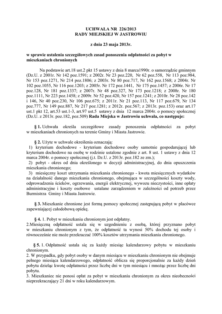 UCHWAŁA NR 226/2013 RADY MIEJSKIEJ W JASTROWIU z dnia 23 maja 2013r. w sprawie ustalenia szczegółowych zasad ponoszenia odpłatności za pobyt w mieszkaniach chronionych Na podstawie art.18 ust.2 pkt 15 ustawy z dnia 8 marca1990r. o samorządzie gminnym (Dz.U. z 2001r. Nr 142 poz.1591; z 2002r. Nr 23 poz.220, Nr 62 poz.558, Nr 113 poz.984, Nr 153 poz.1271, Nr 214 poz.1806; z 2003r. Nr 80 poz.717, Nr 162 poz.1568; z 2004r. Nr 102 poz.1055, Nr 116 poz.1203; z 2005r. Nr 172 poz.1441, Nr 175 poz.1457; z 2006r. Nr 17 poz.128, Nr 181 poz.1337; z 2007r. Nr 48 poz.327, Nr 173 poz.1218; z 2008r. Nr 180 poz.1111, Nr 223 poz.1458; z 2009r. Nr 52 poz.420, Nr 157 poz.1241; z 2010r. Nr 28 poz.142 i 146, Nr 40 poz.230, Nr 106 poz.675; z 2011r. Nr 21 poz.113, Nr 117 poz.679, Nr 134 poz.777, Nr 149 poz.887, Nr 217 poz.1281; z 2012r. poz.567; z 2013r. poz.153) oraz art.17 ust.1 pkt 12, art.53 ust.1-3, art.97 ust.5 ustawy z dnia 12 marca 2004r. o pomocy społecznej (Dz.U. z 2013r. poz.182, poz.509) Rada Miejska w Jastrowiu uchwala, co następuje: § 1. Uchwała określa szczegółowe zasady ponoszenia w mieszkaniach chronionych na terenie Gminy i Miasta Jastrowie. odpłatności za pobyt § 2. UŜyte w uchwale określenia oznaczają: 1) kryterium dochodowe - kryterium dochodowe osoby samotnie gospodarującej lub kryterium dochodowe na osobę w rodzinie ustalone zgodnie z art. 8 ust. 1 ustawy z dnia 12 marca 2004r. o pomocy społecznej (j.t. Dz.U. z 2013r. poz.182 ze zm.); 2) pobyt - okres od dnia określonego w decyzji administracyjnej, do dnia opuszczenia mieszkania chronionego; 3) miesięczny koszt utrzymania mieszkania chronionego - kwota miesięcznych wydatków na działalność danego mieszkania chronionego, obejmująca w szczególności koszty wody, odprowadzenia ścieków, ogrzewania, energii elektrycznej, wywozu nieczystości, inne opłaty administracyjne i koszty osobowe ustalane zarządzeniem w zaleŜności od potrzeb przez Burmistrza Gminy i Miasta Jastrowie. § 3. Mieszkanie chronione jest formą pomocy społecznej zastępującą pobyt w placówce zapewniającej całodobową opiekę. § 4. 1. Pobyt w mieszkaniu chronionym jest odpłatny. 2.Miesięczną odpłatność ustala się w uzgodnieniu z osobą, której przyznano pobyt w mieszkaniu chronionym z tym, Ŝe odpłatność ta wynosi 50% dochodu tej osoby i równocześnie nie moŜe przekraczać 100% kosztów utrzymania mieszkania chronionego. § 5. 1. Odpłatność ustala się za kaŜdy miesiąc kalendarzowy pobytu w mieszkaniu chronionym. 2. W przypadku, gdy pobyt osoby w danym miesiącu w mieszkaniu chronionym nie obejmuje pełnego miesiąca kalendarzowego, odpłatność oblicza się proporcjonalnie za kaŜdy dzień pobytu dzieląc kwotę odpłatności przez liczbę dni w tym miesiącu i mnoŜąc przez liczbę dni pobytu. 3. Mieszkaniec nie ponosi opłat za pobyt w mieszkaniu chronionym za okres nieobecności nieprzekraczający 21 dni w roku kalendarzowym. 4. Osoba, której przyznano pobyt w mieszkaniu chronionym zobowiązana jest do regulowania naleŜnych opłat na konto Miejsko- Gminnego Ośrodka Pomocy Społecznej w Jastrowiu w wysokości i terminie określonych w decyzji administracyjnej. § 6. Wykonanie uchwały powierza się Burmistrzowi Gminy i Miasta Jastrowie. § 7. Uchwała wchodzi w Ŝycie po upływie 14 dni od ogłoszenia w Dzienniku Urzędowym w Województwa Wielkopolskiego. Uzasadnienie do uchwały Nr 226/2013 Rady Miejskiej w Jastrowiu z dnia 23 maja 2013r. w sprawie ustalenia szczegółowych zasad ponoszenia odpłatności za pobyt w mieszkaniach chronionych Stosownie do art. 17 ust. 1 pkt 12 ustawy z dnia 12 marca 2004 r. o pomocy społecznej do zadań własnych gminy o charakterze obowiązkowym naleŜy prowadzenie i zapewnienie miejsc w mieszkaniach chronionych. Zgodnie z art. 53 ust. 1- ust. 3 ustawy z dnia 12 marca 2004 r. o pomocy społecznej: 1.Osobie, która ze względu na trudną sytuację Ŝyciową, wiek, niepełnosprawność lub chorobę potrzebuje wsparcia w funkcjonowaniu w codziennym Ŝyciu, ale nie wymaga usług w zakresie świadczonym przez jednostkę całodobowej opieki, w szczególności osobie z zaburzeniami psychicznymi, osobie opuszczającej pieczę zastępczą w rozumieniu ustawy o wspieraniu rodziny i systemie pieczy zastępczej, młodzieŜowy ośrodek wychowawczy, zakład dla nieletnich, a takŜe cudzoziemcowi, który uzyskał w Rzeczypospolitej Polskiej status uchodźcy lub ochronę uzupełniającą, moŜe być przyznany pobyt w mieszkaniu chronionym. 2. Mieszkanie chronione jest formą pomocy społecznej przygotowującą osoby tam przebywające, pod opieką specjalistów, do prowadzenia samodzielnego Ŝycia lub zastępującą pobyt w placówce zapewniającej całodobową opiekę. Mieszkanie chronione zapewnia warunki samodzielnego funkcjonowania w środowisku, w integracji ze społecznością lokalną. 3. Mieszkanie chronione moŜe być prowadzone przez kaŜdą jednostkę organizacyjną pomocy społecznej lub organizację poŜytku publicznego. W myśl art. 97 ust.5 ustawy z dnia 12 marca 2004 r. o pomocy społecznej rada powiatu lub rada gminy w drodze uchwały ustala, w zakresie zadań własnych, szczegółowe zasady ponoszenia odpłatności za pobyt w ośrodkach wsparcia i mieszkaniach chronionych. W celu obniŜenia kosztów związanych z pobytem mieszkańców Gminy w domach pomocy społecznej utworzono mieszkania chronione. W mieszkaniach chronionych będą mogły zostać umieszczone osoby, które z pomocą specjalistów będą w stanie funkcjonować w środowisku. Dotychczas osoby takie były kierowane do domu pomocy społecznej, co generowało duŜe koszty po stronie Gminy. Szacuje się, Ŝe miesięczny koszt utrzymania mieszkania chronionego w 2013 roku dla 3 osób będzie wynosił ok. 3 200 zł ( czynsz, energia, woda, ścieki, śmieci oraz wynagrodzenie opiekunki wraz z pochodnymi płac). Maksymalnie poniesiony koszt w przeliczeniu na 1 mieszkańca będzie wynosił ok. 1050 zł przy załoŜeniu
