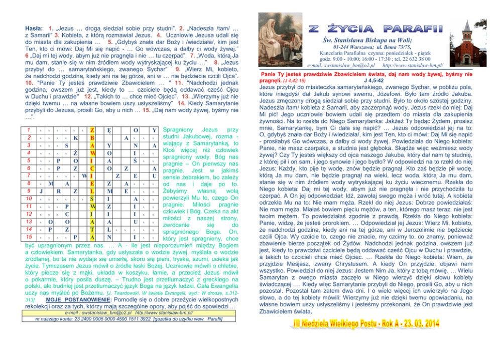 Hasła: 1. „Jezus … drogą siedział sobie przy studni”. 2. „Nadeszła /tam/ … z Samarii” 3. Kobieta, z którą rozmawiał Jezus. 4. Uczniowie Jezusa udali się do miasta dla zakupienia … 5. „Gdybyś znała dar Boży i /wiedziała/, kim jest Ten, kto ci mówi: Daj Mi się napić - … Go wówczas, a dałby ci wody żywej.” 6 „Daj mi tej wody, abym już nie pragnęła i nie … tu czerpać”. 7. „Woda, którą Ja mu dam, stanie się w nim źródłem wody wytryskającej ku życiu …” 8. „Jezus przybył do … samarytańskiego, zwanego Sychar” 9. „Wierz Mi, kobieto, że nadchodzi godzina, kiedy ani na tej górze, ani w … nie będziecie czcili Ojca”. 10. "Panie Ty jesteś prawdziwie Zbawicielem … " 11. "Nadchodzi jednak godzina, owszem już jest, kiedy to … czciciele będą oddawać cześć Ojcu w Duchu i prawdzie" 12. „Takich to … chce mieć Ojciec”. 13. „Wierzymy już nie dzięki twemu … na własne bowiem uszy usłyszeliśmy” 14. Kiedy Samarytanie przybyli do Jezusa, prosili Go, aby u nich … 15. „Daj nam wody żywej, byśmy nie …”. Jezus przy Z Ę O Y Spragniony studni Jakubowej, rozma x x x 2 K B A wiający z Samarytanką, to x x x 3 S A Y N A Ktoś więcej niż człowiek x x x x 4 Ż W O I x x spragniony wody. Bóg nas x x 5 P O I A Ś x x pragnie – On pierwszy nas x x 6 P Z C O Z A pragnie. Jest w jakimś x x x x x 7 W I Z E U sensie żebrakiem, bo zależy x 8 M A E Z A x x x od nas i daje po to. 9 Żebyśmy własną wolą J R Z L M E x x x powierzyli Mu to, czego On x x x x x x x x 10 Ś I A pragnie. Miłości pragnie x x x 11 P W Z I x x człowiek i Bóg. Czeka na akt x x x 12 C I I I x x miłości z naszej strony, x 13 O O A A U x x zwrócenie się do x 14 P Z T Ł x x x x x spragnionego Boga. On, x x x x 15 P A N I x x który jest spragniony, chce być upragnionym przez nas. … A - Ile jest nieporozumień między Bogiem a człowiekiem. Samarytanka, gdy usłyszała o wodzie żywej, myślała o wodzie źródlanej, bo ta nie wydaje się umarłą, skoro się pieni, tryska, szumi, ucieka jak życie. Tymczasem Jezus mówił o źródle łaski Bożej. Uczniowie mówili o chlebie, który piecze się z mąki, układa w koszyku, łamie, a przecież Jezus mówił o pokarmie, który posila duszę. – Trudno jest przetłumaczyć z greckiego na polski, ale trudniej jest przetłumaczyć język Boga na język ludzki. Cała Ewangelia uczy nas myśleć po Bożemu. [J. Twardowski, W świetle Ewangelii, wyd.: W drodze, s.312313]. MOJE POSTANOWIENIE: Pomodlę się o dobre przeżycie wielkopostnych rekolekcji oraz za tych, którzy mają szczególne opory, aby pójść do spowiedzi ... 1 x x x x x x x x x x e-mail : [email protected] http://www.stanislaw-bm.pl/ nr naszego konta: 23 2490 0005 0000 4500 1511 3922 [gazetka do użytku wew. Parafii] Św. Stanisława Biskupa na Woli; 01-244 Warszawa; ul. Bema 73/75, Kancelaria Parafialna czynna: poniedziałek - piątek godz. 9:00 - 10:00; 16:00 - 17:30 ; tel. 22 632 38 00 e-mail: [email protected] http://www.stanislaw-bm.pl/ Panie Ty jesteś prawdziwie Zbawicielem świata, daj nam wody żywej, byśmy nie pragnęli. (J 4,42.15) J 4,5-42 Jezus przybył do miasteczka samarytańskiego, zwanego Sychar, w pobliżu pola, które /niegdyś/ dał Jakub synowi swemu, Józefowi. Było tam źródło Jakuba. Jezus zmęczony drogą siedział sobie przy studni. Było to około szóstej godziny. Nadeszła /tam/ kobieta z Samarii, aby zaczerpnąć wody. Jezus rzekł do niej: Daj Mi pić! Jego uczniowie bowiem udali się przedtem do miasta dla zakupienia żywności. Na to rzekła do Niego Samarytanka: Jakżeż Ty będąc Żydem, prosisz mnie, Samarytankę, bym Ci dała się napić? … Jezus odpowiedział jej na to: O, gdybyś znała dar Boży i /wiedziała/, kim jest Ten, kto ci mówi: Daj Mi się napić - prosiłabyś Go wówczas, a dałby ci wody żywej. Powiedziała do Niego kobieta: Panie, nie masz czerpaka, a studnia jest głęboka. Skądże więc weźmiesz wody żywej? Czy Ty jesteś większy od ojca naszego Jakuba, który dał nam tę studnię, z której pił i on sam, i jego synowie i jego bydło? W odpowiedzi na to rzekł do niej Jezus: Każdy, kto pije tę wodę, znów będzie pragnął. Kto zaś będzie pił wodę, którą Ja mu dam, nie będzie pragnął na wieki, lecz woda, którą Ja mu dam, stanie się w nim źródłem wody wytryskającej ku życiu wiecznemu. Rzekła do Niego kobieta: Daj mi tej wody, abym już nie pragnęła i nie przychodziła tu czerpać. A On jej odpowiedział: Idź, zawołaj swego męża i wróć tutaj. A kobieta odrzekła Mu na to: Nie mam męża. Rzekł do niej Jezus: Dobrze powiedziałaś: Nie mam męża. Miałaś bowiem pięciu mężów, a ten, którego masz teraz, nie jest twoim mężem. To powiedziałaś zgodnie z prawdą. Rzekła do Niego kobieta: Panie, widzę, że jesteś prorokiem. … Odpowiedział jej Jezus: Wierz Mi, kobieto, że nadchodzi godzina, kiedy ani na tej górze, ani w Jerozolimie nie będziecie czcili Ojca. Wy czcicie to, czego nie znacie, my czcimy to, co znamy, ponieważ zbawienie bierze początek od Żydów. Nadchodzi jednak godzina, owszem już jest, kiedy to prawdziwi czciciele będą oddawać cześć Ojcu w Duchu i prawdzie, a takich to czcicieli chce mieć Ojciec. … Rzekła do Niego kobieta: Wiem, że przyjdzie Mesjasz, zwany Chrystusem. A kiedy On przyjdzie, objawi nam wszystko. Powiedział do niej Jezus: Jestem Nim Ja, który z tobą mówię. … Wielu Samarytan z owego miasta zaczęło w Niego wierzyć dzięki słowu kobiety świadczącej …. Kiedy więc Samarytanie przybyli do Niego, prosili Go, aby u nich pozostał. Pozostał tam zatem dwa dni. I o wiele więcej ich uwierzyło na Jego słowo, a do tej kobiety mówili: Wierzymy już nie dzięki twemu opowiadaniu, na własne bowiem uszy usłyszeliśmy i jesteśmy przekonani, że On prawdziwie jest Zbawicielem świata. Papież Franciszek - Drodzy bracia i siostry, niech w tym czasie Wielkiego Po