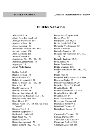 INDEKS NAZWISK „Polityka i Społeczeństwo” 6/2009 INDEKS NAZWISK Abd Allah 119 Abdel Aziz Ibn Saud 167 Albright Madeleine 194 Andrasz Adam 194 Anusz Andrzej 107 Arendarski Andrzej 107, 108 Arendt Hannah 130 Aron Raymond 105 Arrow Kenneth 12 Arystoteles 36, 125, 127, 128 Atatürk Kemal Pasza 114 Augustyn 128 Awad Abdel Kader Babbie Earl 40 Bäcker Roman 173 Bacon Francis 128 Balicki Zygmunt 65, 72 Bana Al Hasan 113–116, 121 Barcz Jan 136 Bardl Franciszek 19 Barlicki Norbert 96 Barroso Jose Manuel 138 Bartoszewicz Joachim 50, 51, 53 Bartyzel Jacek 103, 104 Bartz Bruno 173 Barycz Anna 104, 105 zob. też Tusk Donald Bassam Tibi 113 Bauman Zygmunt 43 Bądkowski Lech 105 Beck Józef 70, 179 Bednarz Józef 74 Bemenista Andrzej 171 Beneš Eduard 132, 177, 181 Berezowski Zygmunt 49 Berger Peter 43 Bergmann Olaf 48, 53 Berlin Isaiah 105, 130 Bernacki Włodzimierz 107 Bielan Adam 62 Bielecka Monika 193 Bielecki Jan Krzysztof 104, 107, 108, 111 Bielecki Tadeusz 52, 53 Bień Aleksy 96 Bierut Bolesław 61 Bilčík Vladimír 138 Bobko Aleksander 184, 185, 192, 195 Bodin Jean 36 Bonusiak Włodzimierz 185, 190 Borowski Stefan 67 Bortnowska Halina 29, 30 Bourdieu Pierre 39, 41–43 Brandts Beate 142 Brandts Ehrenfried 142, 143 Brandts Heinz 141–143 Brandts Lony 141 Brok Hans van den 134 Brzeziński Tomasz 60 Buchanan James 9–17 Buksiński Tadeusz 12 Buttiglione Rocco 138 Campanella Tomaso 128 Cecuda Dariusz 105 Chalid Ibn Abd-Aziz 167 Chmielarz Andrzej 180 Chomeini Ajatollah 168 Indeks nazwisk Christiansen Thomas 43 Churska Karolina 60 Cichosz Marzena 60 Cieplechowicz Natalia 185 Cimek Henryk 19, 184–191, 195 Cimek Wacław 185 Cimoszewicz Włodzimierz 157 Comte Auguste 37 Constant Benjamin 129 Cwynar Katarzyna 190 Cycero Marek Tuliusz 36 Cyrankiewicz Józef 97 Czaplicki Kazimierz Wojciech 161 Czapnik Sławomir 164 Czyżewski Marek 39 Ćwik Władysław 74 Daszyński Ignacy 69, 96 Dąbski Jan 19, 23 Dejmek Kazimierz 148, 149 Dmowski Roman 47–51, 53, 65, 72, 180 Doboszyński Adam 49, 51 Doktór Grażyna 151 Drobner Bolesław 95 Drosik Adam 164 Dudek Antoni 104 Dudziński Stanisław 191 Ďurica Milan 134 Durkheim Emile 43 Dyla Adam 162 Dynia Elżbieta 193 Dzielski Mirosław 104 Dziemidok Bożena 59 Dzurinda Mikulaš 134, 136–138, 140, 178, 182 Dzwończyk Joanna 171 Dzwończyk Maria 163 Eisler Jerzy 144–146, 148, 149 Engelgard Jan 180 Engels Fryderyk 124, 130 Etchegaray Roger 33 Fahd Ibn Abd al-Aziz 167 Fajsal Ibn Abd al-Aziz 167, 168 Faruga Andrzej 182 Faruk, król Egiptu 115, 116 Figeľ Ján 135, 138 Fijałkowski Wojciech 116 Fijołek Marcin 193, 195 Filar Dariusz 106 Filc Dani 170 Filipowicz Stanisław 59 Flis Jarosław 163 Foucault Michel 42, 124, 130 Fras Janina 64 Frattini Franco 138 Fukuyama Francis 130 Furman Wojciech 192, 195 Gábelová Barbara 137 Gadomski Witold 108 Gajdzica Michal 137 Gargas Anita 106, 107 Geremek Bronisław 194 Giddens Anthony 39–41, 43 Gierek Edward 61, 146 Giertych Jędrzej (jg.) 53 Gil-Robles Jose-Maria 134 Gmerek-Rajchel Maria 162 Gmitruk Janusz 179, 181, 182 Gniazdowski Mateusz 181 Godłów-Legiędź Janina 10 Gołębiewska Natalia 190 Gomułka Władysław 144, 146 Göring Hermann 179 Gowin Jarosław 28 Grabiński Tomasz 136, 137 Grabska Stanisława 30 Grabski Stanisław 48–50, 66 Grabski Władysław 21 Green Thomas H. 129 Grott Olgierd 173 Grzecznarowski Józef 95, 96 197 198 INDEKS NAZWISK Grzybowska Gabriela 190 Gunning James Patrick 11 Guziur Janusz 182 Habermas Jurgen 130 Halczak Bohdan 48–51, 53 Hall Aleksander 105 Hayek Friedrich August von 9–13, 15–17, 28, 105, 130 Hegel Georg Wilhelm Friedrich 129 Herodot 36 Hlinka Andrej 180, 181 Hlond August 78 Hobbes Thomas 11, 36, 128 Hochfeld Julian 97–99 Hodeiba Husajn 116 Hodža Milan 181 Horoszewicz Michał 30 Howarth David 39, 43 Hruszovský Pavol 137 Hrynyk Wasyl 78 Hubert Jan 52 Huntington Samuel 130 Husaini Ishak Musa 117 Husajn Ibn Ali 119, 120 Ikonowicz Piotr 60 Indraszczyk Arkadiusz 180 Iwaneczko Dariusz 78 Jabłoński Andrzej Wojciech 61 Jackson Andrew 173 Jamsheer Hasan Ali 117 Jan Paweł II 28–35 Janowska Halina 21 Janowski Mieczysław 192 Janusz Grzegorz 190 Jasiński Roman 77 Jessop Bob 43 Jezierski Krzysztof Winicjusz 182 Jeziński Marek 60, 172 Jędruszczak Tadeusz 21 Jörgensen Knud Erik 43 Jörgensen Marianne 43 Kaczyński Jarosław 164 Kaczyński Lech 62, 163, 164 Kajetanowicz Kajetan 141, 143 Kamińska-Szmaj Irena 64, 67 Kamiński Michał 62 Kapczyński Piotr 105, 106 Kapelushnikov Roman 11 Karmasin Franz 181 Karnowska Danuta 103 Karwat Mirosław 69 Kasińska-Metryka Agnieszka 171 Kautsky Karl 130 Kawalec Krzysztof 47–50 Kępczyński Wincenty 96 Kieszczyński Lucjan 186 Kisielewski Stefan 104 Kitowski Jerzy 191 Kłosowicz Robert 194 Kłusak Miron 171 Kňažko Milan 177 Kocyłowśkyj Josafat 77 Kołodziejczyk Dariusz 114 Kołodziejczyk-Konarska Katarzyna 132, 134 Koprowski Andrzej 31 Koprukowniak Albin 191 Korfanty Wojciech 22 Korolko Mikołaj 75 Korwin-Mikke Janusz 59, 104, 193 Kotler Philip 58 Kováč Michal Kowal Paweł 194 Kowalczyk Krzysztof 163 Kowalski Sergiusz 39 Kozicki Stanisław (S.K.) 51, 53, 65, 66 Kozioł Leszek 193 Kozłowski Jacek 104, 105 Krajewski Zenon 24 Krasnowski Zbigniew 67 Krauz-Mozer Barbara 161 Indeks nazwisk Krzykała Stanisław 185 Kubek Andrzej 173 Kukan Eduard 134 Kuniński Miłowit 10, 11 Kuroń Jacek 59, 60, 147 Kurski Jacek 62 Kuryłowicz Adam 97 Kutb Said 118 Kwaśniewski Aleksander 59, 157 Laclau Ernesto 41 Lange Oskar 97, 99, 100 Lassalle Ferdynand 127 Laubier Patric de 30 Lenin Włodzimierz Ilicz 48, 52, 130 Leon XIII 28, 31, 32, 34 Lepper Andrzej 172, 173 Lewandowski Janusz 104–106, 108, 111 Linden Eric van den 137 Lippman Walter 105 Lloyd Georg Dawid 23 Locke John 36, 128 Luckmann Thomas 43 Luhmann Niklas 43 Luksemburg Róża 130 Lutak Tomasz 190, 192, 193 Lutosławski Kazimierz 51 Łabędź Krzysztof 39, 40, 44 Łastawski Kazimierz 133–135, 190 Łoś Robert 133, 175–178 Machalski Andrzej 107, 108 Machiavelli Niccolo 36, 128 MacIn