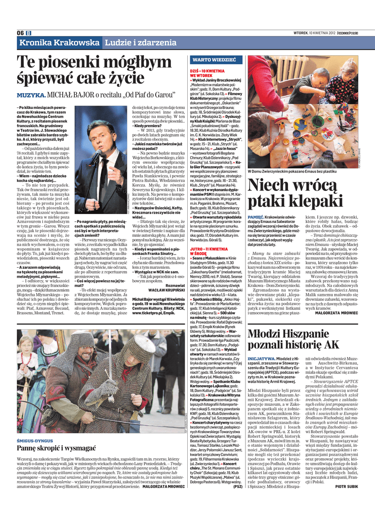 06 B WTOREK, 10 KWIETNIA 2012 Kronika Krakowska Ludzie i zdarzenia Te piosenki mógłbym śpiewać całe życie – Po nagraniu płyty, po miesiącach spotkań z publicznością coś byś w tych interpretacjach zmienił? –Pierwszyrazniczego.Oczywiście, z recitalu wypadło kilka piosnek nagranych na tych dwóch płytach, bo byłby za długi. Nabieram natomiast narastającej ochoty, by nagrać też część drugą. Oczywiście, nie od razu, ale po albumie z repertuarem premierowym. – Coś więcej powiesz na jej temat? –To efekt mojej współpracy z Wojciechem Młynarskim. Ja zbieram kompozycje odjednych kompozytorów, Wojtek poprosił o nie innych. A ma taką metodę, że dostaje muzykę, pisze do niej tekst, po czym daje temu kompozytorowi inne słowa, oczekując na muzykę. W ten sposób powstają dwie piosenki... –Kiedypremiera? – W 2013, gdy tradycyjnie po dwóch latach pożegnam się z recitalem obecnym. –Jakieśnazwiskatwórcówjuż możeszpodać? – Na pewno będzie muzyka Wojciecha Borkowskiego, z którym owocnie współpracuję od wielu lat, i obecnego na moich ostatnich płytach gitarzysty Pawła Stankiewicza, i pewnie Piotra Rubika, Włodzimierza Korcza. Myślę, że również Seweryna Krajewskiego. I kilku innych. Na pewno o kompozytorów dziś łatwiej niż o autorów tekstów... – Następców Osieckiej, Kofty, Kreczmara rzeczywiście nie widać... – Dlatego tak się cieszę, że Wojciech Młynarski jest wciąż w świetnej formie i napisze dla mnie autorską płytę. A mam już pomysłnakolejną.Alezawcześnie, by go ujawniać. – Kiedyś wspominałeś o piosenkach Franka Sinatry... – I coraz bardziej wiem, że to chyba nie dla mnie. Przeholowałem z tym marzeniem. – Wystąpisz w NCK nie sam. – Tak jak poprzednio z4–osobowym zespołem. Rozmawiał WACŁAW KRUPIŃSKI MichałBajorwystąpi16kwietnia ogodz.19 w auliNowohuckiego Centrum Kultury. Bilety: NCK, www.ticketpro.pl,Empik. FOT. ANDRZEJ BANAŚ – Po kilku miesiącach powracasz do Krakowa, tym razem do Nowohuckiego Centrum Kultury, z recitalem piosenek francuskich. Na grudniowy w Teatrze im. J. Słowackiego biletów zabrakło bardzo szybko. A ci, którzy przyszli, byli zachwyceni... – Od października dałem już 78 recitali. I gdybyś mnie zapytał, który z moich wszystkich programów chciałbym śpiewać do końca życia, to bym powiedział, że właśnie ten. – Wiem – najmłodsze dziecko kocha się najbardziej... – To nie ten przypadek. Tak ów francuski recital przeżywam, tak mnie ta muzyka niesie, tak świetnie jest odbierany – po prostu jest coś takiego w tych piosenkach, których większość wykonawców już fruwa w niebie poza Aznavourem i najmłodszym w tym gronie – Garou. Wręcz czuję, jak te piosenki dojrzewają na scenie i myślę, że publiczność dostrzega, że się na nich wychowałem, o czym wspominam w książeczce do płyty. To, jak już kiedyś powiedziałem, piosenki wszech czasów. – A zarazem odpowiadają na tęsknotę za piosenkami melodyjnymi, pięknymi... – I odbiorcy, w większości przecież nie znający francuskiego, mogą – dzięki tłumaczeniem Wojciecha Młynarskiego – posłuchać ich po polsku i dowiedzieć się, o czym niegdyś śpiewali: Piaf, Aznavour, Becaud, Brassens, Montand, Trenet. FOT. ANNA KACZMARZ MUZYKA. MICHAŁ BAJOR o recitalu „Od Piaf do Garou” ŚMIGUS-DYNGUS Pannę skropić i wysmagać Wczoraj, na zakończenie Targów Wielkanocnych na Rynku, zagościli tam m.in. rycerze, którzy walczyli o damę i pokazywali, jak w minionych wiekach obchodzono Lany Poniedziałek. – Tradycja zmieniała się w ciągu stuleci. Rycerz tylko pokrapiał (nie oblewał) pannę wodą. Kiedyś też smagało się dziewczęta witkami wierzbowymi po nogach. Te, które nie zostały pokropione lub wysmagane – mogły się czuć urażone, jak i zaniepokojone, bo oznaczało to, że nie ma nimi zainteresowania ze strony kawalerów – wyjaśnia Paweł Starzyński, założyciel tworzącego się właśnie amatorskiego Teatru Żywej Historii, który przygotował przedstawienie. MAŁGORZATA MROWIEC DZIŚ – 10 KWIETNIA WE WTOREK »WykładJaninyBroczkowskiej „Modernizmwmalarstwiepolskim”;godz.11,DomKultury„Podgórze”(ul.Sokolska13). » Filmowy KlubHistoryczny:projekcjafilmu dokumentalnegopt.„Oskarżenie” wreżyseriiGrzegorzaBrauna; godz.18,ŚródmiejskiOśrodekKultury(ul.Mikołajska2). » DyskusyjnyKlubKsiążki: MarlenadeBlasi „SmakipołudniowejItalii”–godz. 18.30,KlubKuźniaOśrodkaKultury im.C.K.Norwida(os.ZłotyWiek 14). » KlubInternetowy„Strych”, wgodz.15–21,Klub„Strych”(ul. Masarska14). » „Jazzinfocus” – wystawafotografiiBogdana Chmury;KlubDziennikarzy„Pod Gruszką”(ul.Szczepańska1). » KołoGierPlanszowych –rozgrywki wewspółczesnegryplanszowe: negocjacyjne,familijne,strategiczne,historyczne,godz.16–21.30, Klub„Strych”(ul.Masarska14). » KoncertwwykonaniudyplomantówPSM IIstopniaim.M.KarłowiczawKrakowie.Wprogramie m.in.Paganini,Brahms,Mozart, Bach;godz.18,KlubDziennikarzy „PodGruszką”(ul.Szczepańska1). » Otwartewarsztatyrękodzieła artystycznego.Wprogramie:koralenaręcznieplecionymsznurku. ProwadzenieKrystynaDrożdżowska;godz.17,OśrodekKulturyim. Norwida(os.Górali5). JUTRO – 11 KWIETNIA W ŚRODĘ »SeanszMaluszkiem wKinie StudyjnymSfinks,godz.11.30 (osiedleGórali5)–projekcjafilmu „ZakochanyGoethe”(melodramat, Niemcy2010,reż.P.Stolzl).Seanse skierowanesądorodzicówmałych dzieci–półmrok,ściszonydźwięk nasali,przewijak,możliwośćopieki naddziećmiwwieku1,5–4lata. » SpotkaniazBiblią:„AkkoiHajfa”.Prowadzenie:drMariaKantor; godz.17,KlubInteligencjiKatolickiej(ul.Sienna5). » 500słów naminutę –kursszybkiegoczytania.Prowadzenie:RafałDąbrowski; godz.17,EmpikKraków(Rynek Główny5).Wstępwolny. »Warsztatysztukatorskie: odlewanie form.ProwadzenieIgaPauliczek; godz.17.30,DomKultury„Podgórze”(ul.Sokolska13). » Wykład otwarty wramachwarsztatówliterackich:dr