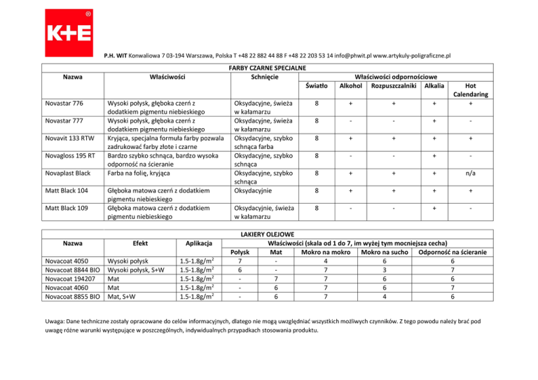 P.H. WIT Konwaliowa 7 03-194 Warszawa, Polska T +48 22 882 44 88 F +48 22 203 53 14 [email protected] www.artykuly-poligraficzne.pl Nazwa Novastar 776 Novastar 777 Novavit 133 RTW Novagloss 195 RT Novaplast Black Matt Black 104 Matt Black 109 Nazwa Novacoat 4050 Novacoat 8844 BIO Novacoat 194207 Novacoat 4060 Novacoat 8855 BIO FARBY CZARNE SPECJALNE Schnięcie Światło Właściwości Wysoki połysk, głęboka czerń z dodatkiem pigmentu niebieskiego Wysoki połysk, głęboka czerń z dodatkiem pigmentu niebieskiego Kryjąca, specjalna formuła farby pozwala zadrukować farby złote i czarne Bardzo szybko schnąca, bardzo wysoka odporność na ścieranie Farba na folię, kryjąca Głęboka matowa czerń z dodatkiem pigmentu niebieskiego Głęboka matowa czerń z dodatkiem pigmentu niebieskiego Efekt Wysoki połysk Wysoki połysk, S+W Mat Mat Mat, S+W Aplikacja 1.5-1.8g/m2 1.5-1.8g/m2 1.5-1.8g/m2 1.5-1.8g/m2 1.5-1.8g/m2 Właściwości odpornościowe Alkohol Rozpuszczalniki Alkalia Oksydacyjne, świeża w kałamarzu Oksydacyjne, świeża w kałamarzu Oksydacyjne, szybko schnąca farba Oksydacyjne, szybko schnąca Oksydacyjne, szybko schnąca Oksydacyjnie 8 + + + Hot Calendaring + 8 - - + - 8 + + + + 8 - - + - 8 + + + n/a 8 + + + + Oksydacyjnie, świeża w kałamarzu 8 - - + - LAKIERY OLEJOWE Właściwości (skala od 1 do 7, im wyżej tym mocniejsza cecha) Połysk Mat Mokro na mokro Mokro na sucho Odporność na ścieranie 7 4 6 6 6 7 3 7 7 7 6 6 6 7 6 7 6 7 4 6 Uwaga: Dane techniczne zostały opracowane do celów informacyjnych, dlatego nie mogą uwzględniać wszystkich możliwych czynników. Z tego powodu należy brać pod uwagę różne warunki występujące w poszczególnych, indywidualnych przypadkach stosowania produktu.