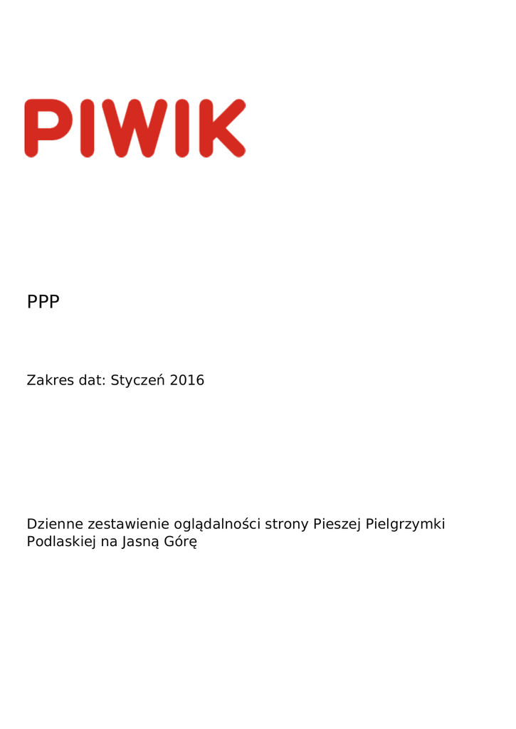 PPP Zakres dat: Styczeń 2016 Dzienne zestawienie oglądalności strony Pieszej Pielgrzymki Podlaskiej na Jasną Górę Podsumowanie odwiedzin Nazwa Parametr Parametr Liczba niepowtarzających się użytkowników 560 Użytkownicy 738 Aktywność 3 502 Maksymalna ilość działań podczas jednej wizyty 98 Ilość akcji przypadających na wizytę 5 Średni czas pobytu na stronie (w sekundach) 00:03:16 Współczynnik rezygnacji 52% PPP | Zakres dat: Styczeń 2016 | Page 2 of 7 Aktywność - Główne wskaźniki Nazwa Parametr Parametr Liczba odsłon 2 916 Liczba odsłon niepowtarzających się 1 811 Pobrania 580 Pobrania bez powtórzeń 533 Linki zewnętrzne 6 Unikalne linki zewnętrzne 6 Wyszukiwania 0 Unikalne słowa kluczowe 0 Średni czas generowania 0,38 s PPP | Zakres dat: Styczeń 2016 | Page 3 of 7 Kraj KrajIlość akcji przypadających na wizytę Użytkownicy Aktywność Ilość akcji Średni czas na przypadających stronie na wizytę Współczynnik rezygnacji Przychody Polska 691 3 365 5 00:03:19 51% 0 zł Stany Zjednoczone 24 105 4 00:04:25 50% 0 zł Rosja 9 11 1 00:00:22 78% 0 zł Nieznany 3 3 1 00:00:00 100% 0 zł Czechy 2 4 2 00:03:59 50% 0 zł Szwecja 2 2 1 00:00:00 100% 0 zł Ukraina 2 2 1 00:00:00 100% 0 zł Wielka Brytania 2 2 1 00:00:00 100% 0 zł Brytyjskie Terytorium Oceanu Indyjskiego 1 1 1 00:00:00 100% 0 zł Niemcy 1 6 6 00:02:10 0% 0 zł Węgry 1 1 1 00:00:00 100% 0 zł PPP | Zakres dat: Styczeń 2016 | Page 4 of 7 Typ urządzenia TypIlość urządzenia akcji przypadających na wizytę Użytkownicy Aktywność Ilość akcji Średni czas na przypadających stronie na wizytę Współczynnik rezygnacji Współczynnik przetwarzania Pulpit 511 2 483 5 00:03:30 50% 0% Smartfon 180 790 4 00:02:29 58% 0% Nieznany 30 182 6 00:04:38 47% 0% Tablet 11 21 2 00:02:18 73% 0% Phablet 6 26 4 00:01:43 17% 0% PPP | Zakres dat: Styczeń 2016 | Page 5 of 7 Przeglądarki odwiedzających Przeglądarka Ilość akcji przypadających na wizytę Użytkownicy Aktywność Ilość akcji Średni czas na przypadających stronie na wizytę Współczynnik rezygnacji Współczynnik przetwarzania Chrome 261 1 164 5 00:03:32 53% 0% Firefox 190 980 5 00:03:51 46% 0% Chrome Mobile 151 719 5 00:02:49 57% 0% Opera 32 235 7 00:03:53 41% 0% Internet Explorer 31 98 3 00:01:08 68% 0% Android Browser 28 73 3 00:02:12 64% 0% IE Mobile 16 121 8 00:04:36 31% 0% Mobile Safari 10 32 3 00:01:43 60% 0% Safari 5 15 3 00:00:43 40% 0% Microsoft Edge 4 25 6 00:01:19 25% 0% Opera Mini 4 25 6 00:02:42 50% 0% Yandex Browser 2 2 1 00:00:00 100% 0% Amigo 1 1 1 00:00:00 100% 0% Chromium 1 4 4 00:01:16 0% 0% Iceweasel 1 1 1 00:00:00 100% 0% Opera Mobile 1 7 7 00:00:43 0% 0% PPP | Zakres dat: Styczeń 2016 | Page 6 of 7 Wersja systemu operacyjnego Wersja operacyjnego Ilośćsystemu akcji przypadających na wizytę Użytkownicy Aktywność Ilość akcji Średni czas na przypadających stronie na wizytę Współczynnik rezygnacji Współczynnik przetwarzania Windows 7 296 1 264 4 00:02:59 52% 0% Android 4.4 90 504 6 00:03:19 52% 0% Windows 8.1 70 387 6 00:04:28 40% 0% Windows XP 52 352 7 00:06:32 44% 0% Windows 10 48 216 5 00:02:11 52% 0% Android 5.0 32 88 3 00:01:30 66% 0% Android 5.1 26 63 2 00:02:15 69% 0% Windows Vista 20 111 6 00:03:39 70% 0% Android 4.1 17 75 4 00:03:14 47% 0% Android 4.2 17 44 3 00:00:38 71% 0% Windows 8 13 112 9 00:05:13 38% 0% Windows Phone 8.1 13 59 5 00:03:59 38% 0% GNU/Linux 9 36 4 00:00:30 56% 0% Android 4.3 7 43 6 00:01:58 43% 0% Android 3 24 8 00:03:36 33% 0% Android 4.0 3 6 2 00:01:10 67% 0% iOS 8.4 3 3 1 00:00:00 100% 0% iOS 9.2 3 23 8 00:05:24 33% 0% Windows Phone 8.0 3 62 21 00:07:15 0% 0% Nieznany 2 2 1 00:00:00 100% 0% Ubuntu 2 5 3 00:00:38 50% 0% Android 2.3 1 1 1 00:00:00 100% 0% CyanogenMod 10 1 10 10 00:31:52 0% 0% 7 12 2 00:00:12 57% 0% Pozostałe PPP | Zakres dat: Styczeń 2016 | Page 7 of 7 Powered by TCPDF (www.tcpdf.org)