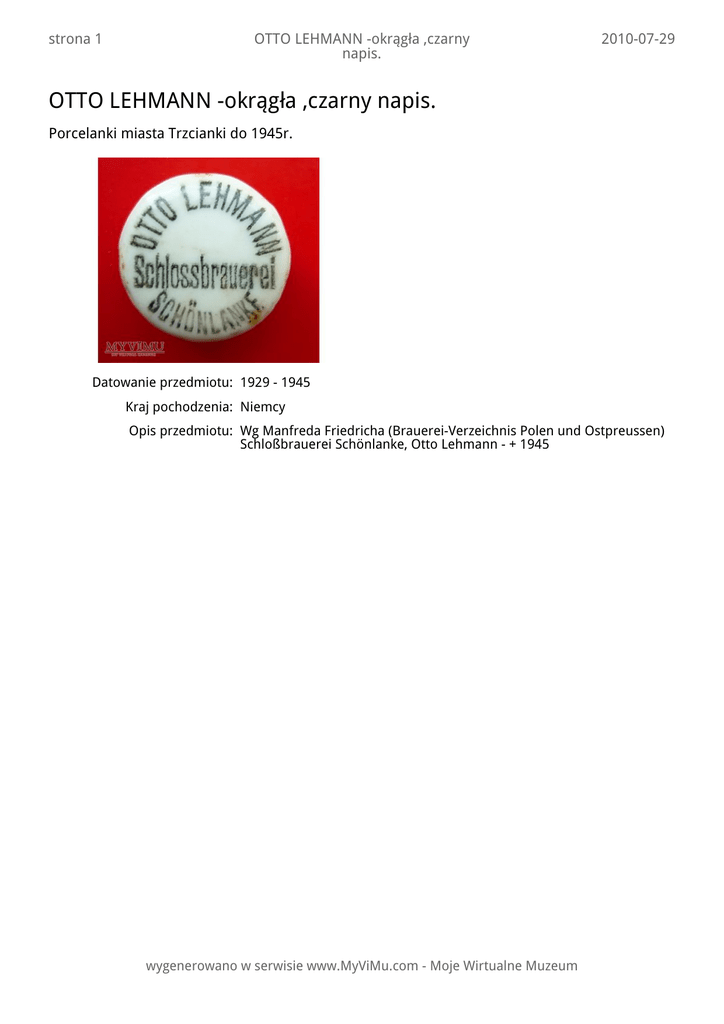 strona 1 OTTO LEHMANN -okrągła ,czarny napis. 2010-07-29 OTTO LEHMANN -okrągła ,czarny napis. Porcelanki miasta Trzcianki do 1945r. Datowanie przedmiotu: 1929 - 1945 Kraj pochodzenia: Niemcy Opis przedmiotu: Wg Manfreda Friedricha (Brauerei-Verzeichnis Polen und Ostpreussen) Schloßbrauerei Schönlanke, Otto Lehmann - + 1945 wygenerowano w serwisie www.MyViMu.com - Moje Wirtualne Muzeum strona 1 OTTO LENDT-okrągła .czerwony napis. 2010-07-29 OTTO LENDT-okrągła .czerwony napis. Porcelanki miasta Trzcianki do 1945r. Kraj pochodzenia: Niemcy Opis przedmiotu: W Reichsadressbuch 1929 (R. Mosse) firma Otto Lendt nie występuje. Prawdopodobnie jest to zamknięcie od wody mineralnej. wygenerowano w serwisie www.MyViMu.com - Moje Wirtualne Muzeum strona 1 OTTO LENDT-podłużna,czarny napis. 2010-07-29 OTTO LENDT-podłużna,czarny napis. Porcelanki miasta Trzcianki do 1945r. Kraj pochodzenia: Niemcy Opis przedmiotu: W Reichsadressbuch 1929 (R. Mosse) firma Otto Lendt nie występuje. Prawdopodobnie jest to zamknięcie od wody mineralnej. wygenerowano w serwisie www.MyViMu.com - Moje Wirtualne Muzeum strona 1 OTTO LENDT-podłużna,czerwony napis. 2010-07-29 OTTO LENDT-podłużna,czerwony napis. Porcelanki miasta Trzcianki do 1945r. Kraj pochodzenia: Niemcy Opis przedmiotu: W Reichsadressbuch 1929 (R. Mosse) firma Otto Lendt nie występuje. Prawdopodobnie jest to zamknięcie od wody mineralnej. wygenerowano w serwisie www.MyViMu.com - Moje Wirtualne Muzeum strona 1 OTTO LENDT-podłużna,cała zielona,czarny napis. 2010-07-29 OTTO LENDT-podłużna,cała zielona,czarny napis. Porcelanki miasta Trzcianki do 1945r. Kraj pochodzenia: Niemcy Opis przedmiotu: W Reichsadressbuch 1929 (R. Mosse) firma Otto Lendt nie występuje. Prawdopodobnie jest to zamknięcie od wody mineralnej. wygenerowano w serwisie www.MyViMu.com - Moje Wirtualne Muzeum strona 1 OTTO LEHMANN -okrągła ,czerwony napis. 2010-07-29 OTTO LEHMANN -okrągła ,czerwony napis. Porcelanki miasta Trzcianki do 1945r. Datowanie przedmiotu: 1929 - 1945 Kraj pochodzenia: Niemcy Opis przedmiotu: Wg Manfreda Friedricha (Brauerei-Verzeichnis Polen und Ostpreussen) Schloßbrauerei Schönlanke, Otto Lehmann - + 1945 wygenerowano w serwisie www.MyViMu.com - Moje Wirtualne Muzeum strona 1 OTTO LEHMANN -podłużna ,czerwony napis. 2010-07-29 OTTO LEHMANN -podłużna ,czerwony napis. Porcelanki miasta Trzcianki do 1945r. Datowanie przedmiotu: 1929 - 1945 Kraj pochodzenia: Niemcy Opis przedmiotu: Wg Manfreda Friedricha (Brauerei-Verzeichnis Polen und Ostpreussen) Schloßbrauerei Schönlanke, Otto Lehmann - + 1945 wygenerowano w serwisie www.MyViMu.com - Moje Wirtualne Muzeum strona 1 Ludwig Neugebauer-okrągła,czarny napis. 2010-07-29 Ludwig Neugebauer-okrągła,czarny napis. Porcelanki miasta Trzcianki do 1945r. Datowanie przedmiotu: 1902 Kraj pochodzenia: Niemcy Opis przedmiotu: Wg Manfreda Friedricha (Brauerei-Verzeichnis Polen und Ostpreussen) Ludwig Neugebauer, Brauerei -1902 wygenerowano w serwisie www.MyViMu.com - Moje Wirtualne Muzeum strona 1 Paul Thomas & Co-okrągła,czerwony napis. 2010-07-29 Paul Thomas & Co-okrągła,czerwony napis. Porcelanki miasta Trzcianki do 1945r. Datowanie przedmiotu: 1893 Kraj pochodzenia: Niemcy Opis przedmiotu: Wg Manfreda Friedricha (Brauerei-Verzeichnis Polen und Ostpreussen) Brauerei Paul Thomas & Co. -1893 wygenerowano w serwisie www.MyViMu.com - Moje Wirtualne Muzeum strona 1 Erwin Schmeer-okrągła,czarny napis. 2010-07-29 Erwin Schmeer-okrągła,czarny napis. Porcelanki miasta Trzcianki do 1945r. Datowanie przedmiotu: 1911 Kraj pochodzenia: Niemcy Opis przedmiotu: Wg Manfreda Friedricha (Brauerei-Verzeichnis Polen und Ostpreussen Erwin Schmeer, Brauerei - + 1911 wygenerowano w serwisie www.MyViMu.com - Moje Wirtualne Muzeum strona 1 Erwin Schmeer-podłużna,czarny napis. 2010-07-29 Erwin Schmeer-podłużna,czarny napis. Porcelanki miasta Trzcianki do 1945r. Datowanie przedmiotu: 1911 Kraj pochodzenia: Niemcy Opis przedmiotu: Wg Manfreda Friedricha (Brauerei-Verzeichnis Polen und Ostpreussen Erwin Schmeer, Brauerei - + 1911 Porcelanka tak piwna jak i od wody mineralnej oraz lemoniady. wygenerowano w serwisie www.MyViMu.com - Moje Wirtualne Muzeum strona 1 Gustaw Kriege-podłużna,czarny napis. 2010-07-29 Gustaw Kriege-podłużna,czarny napis. Porcelanki miasta Trzcianki do 1945r. Kraj pochodzenia: Niemcy Opis przedmiotu: W Reichsadressbuch 1929 (R. Mosse) firma Gustav Krege nie występuje. wygenerowano w serwisie www.MyViMu.com - Moje Wirtualne Muzeum strona 1 Scharlock Johann-podłużna,czarny napis. 2010-07-29 Scharlock Johann-podłużna,czarny napis. Porcelanki miasta Trzcianki do 1945r. Datowanie przedmiotu: 1929 - 1931 Kraj pochodzenia: Niemcy Opis przedmiotu: W Reichsadressbuch 1929 (R. Mosse): Scharlock Johannes, wytwórnia wody mineralnej W Klockhaus Kaufmännisches Handes- u. Gewerbe-Adressbuch des Deutschen Reichs 1931: Scharlock Johann, wytwórnia wody mineralnej wygenerowano w serwisie www.MyViMu.com - Moje Wirtualne Muzeum strona 1 Scharlock Johann-okrągła,zielony napis. 2010-07-29 Scharlock Johann-okrągła,zielony napis. Porcelanki miasta Trzcianki do 1945r. Datowanie przedmiotu: 1929 - 1931 Kraj pochodzenia: Niemcy Opis przedmiotu: W Reichsadressbuch 1929 (R. Mosse): Scharlock Johannes, wytwórnia wody mineralnej W Klockhaus Kaufmännisches Handes- u. Gewerbe-Adressbuch des Deutschen Reichs 1931: Scharlock Johann, wytwórnia wody mineralnej wygenerowano w serwisie www.MyViMu.com - Moje Wirtualne Muzeum strona 1 Scharlock Johann-podłużna,czarny napis. 2010-07-29 Scharlock Johann-podłużna,czarny napis. Porcelanki miasta Trzcianki do 1945r. Datowanie przedmiotu: 1929 - 1931 Kraj pochodzenia: Niemcy Opis przedmiotu: W Reichsadressbuch 1929 (R. Mosse): Scharlock Johannes, wytwórnia wody mineralnej W Klockhaus Kaufmännisches Handes- u. Gewerbe-Adressbuch des Deutschen Reichs 1931: Scharlock Johann, wytwórnia wody mineralnej wygenerowano w serwisie www.MyViMu.com - Moje Wirtualne Muzeu