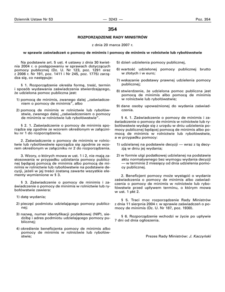 Dziennik Ustaw Nr 53 — 3243 — Poz. 354 354 ROZPORZÑDZENIE RADY MINISTRÓW z dnia 20 marca 2007 r. w sprawie zaÊwiadczeƒ o pomocy de minimis i pomocy de minimis w rolnictwie lub rybo∏ówstwie Na podstawie art. 5 ust. 4 ustawy z dnia 30 kwietnia 2004 r. o post´powaniu w sprawach dotyczàcych pomocy publicznej (Dz. U. Nr 123, poz. 1291 oraz z 2006 r. Nr 191, poz. 1411 i Nr 245, poz. 1775) zarzàdza si´, co nast´puje: § 1. Rozporzàdzenie okreÊla form´, treÊç, termin i sposób wydawania zaÊwiadczenia stwierdzajàcego, ˝e udzielona pomoc publiczna jest: 1) pomocà de minimis, zwanego dalej „zaÊwiadczeniem o pomocy de minimis”, albo 2) pomocà de minimis w rolnictwie lub rybo∏ówstwie, zwanego dalej „zaÊwiadczeniem o pomocy de minimis w rolnictwie lub rybo∏ówstwie”. § 2. 1. ZaÊwiadczenie o pomocy de minimis sporzàdza si´ zgodnie ze wzorem okreÊlonym w za∏àczniku nr 1 do rozporzàdzenia. 2. ZaÊwiadczenie o pomocy de minimis w rolnictwie lub rybo∏ówstwie sporzàdza si´ zgodnie ze wzorem okreÊlonym w za∏àczniku nr 2 do rozporzàdzenia. 3. Wzory, o których mowa w ust. 1 i 2, nie majà zastosowania w przypadku udzielania pomocy publicznej b´dàcej pomocà de minimis albo pomocà de minimis w rolnictwie lub rybo∏ówstwie na podstawie decyzji, je˝eli w jej treÊci zostanà zawarte wszystkie elementy wymienione w § 3. § 3. ZaÊwiadczenie o pomocy de minimis i zaÊwiadczenie o pomocy de minimis w rolnictwie lub rybo∏ówstwie zawiera: 5) dzieƒ udzielenia pomocy publicznej, 6) wartoÊç udzielonej pomocy publicznej brutto w z∏otych i w euro; 7) wskazanie podstawy prawnej udzielenia pomocy publicznej; 8) stwierdzenie, ˝e udzielona pomoc publiczna jest pomocà de minimis albo pomocà de minimis w rolnictwie lub rybo∏ówstwie; 9) dane osoby upowa˝nionej do wydania zaÊwiadczenia. § 4. 1. ZaÊwiadczenie o pomocy de minimis i zaÊwiadczenie o pomocy de minimis w rolnictwie lub rybo∏ówstwie wydaje si´ z urz´du w dniu udzielenia pomocy publicznej b´dàcej pomocà de minimis albo pomocà de minimis w rolnictwie lub rybo∏ówstwie, a w przypadku pomocy: 1) udzielanej na podstawie decyzji — wraz z tà decyzjà w dniu jej wydania; 2) w formie ulgi podatkowej udzielanej na podstawie aktu normatywnego bez wymogu wydania decyzji — w terminie 2 miesi´cy od dnia udzielenia pomocy publicznej. 2. Beneficjent pomocy mo˝e wystàpiç o wydanie zaÊwiadczenia o pomocy de minimis albo zaÊwiadczenia o pomocy de minimis w rolnictwie lub rybo∏ówstwie przed up∏ywem terminu, o którym mowa w ust. 1 pkt 2. 1) dat´ wydania; 2) piecz´ç podmiotu udzielajàcego pomocy publicznej; § 5. Traci moc rozporzàdzenie Rady Ministrów z dnia 11 sierpnia 2004 r. w sprawie zaÊwiadczeƒ o pomocy de minimis (Dz. U. Nr 187, poz. 1930). 3) nazw´, numer identyfikacji podatkowej (NIP), siedzib´ i adres podmiotu udzielajàcego pomocy publicznej; § 6. Rozporzàdzenie wchodzi w ˝ycie po up∏ywie 7 dni od dnia og∏oszenia. 4) okreÊlenie beneficjenta pomocy de minimis albo pomocy de minimis w rolnictwie lub rybo∏ówstwie; Prezes Rady Ministrów: J. Kaczyƒski Dziennik Ustaw Nr 53 — 3244 — Poz. 354 Za∏àczniki do rozporzàdzenia Rady Ministrów z dnia 20 marca 2007 r. (poz. 354) Za∏àcznik nr 1 WZÓR Dziennik Ustaw Nr 53 — 3245 — Poz. 354 Za∏àcznik nr 2 WZÓR
